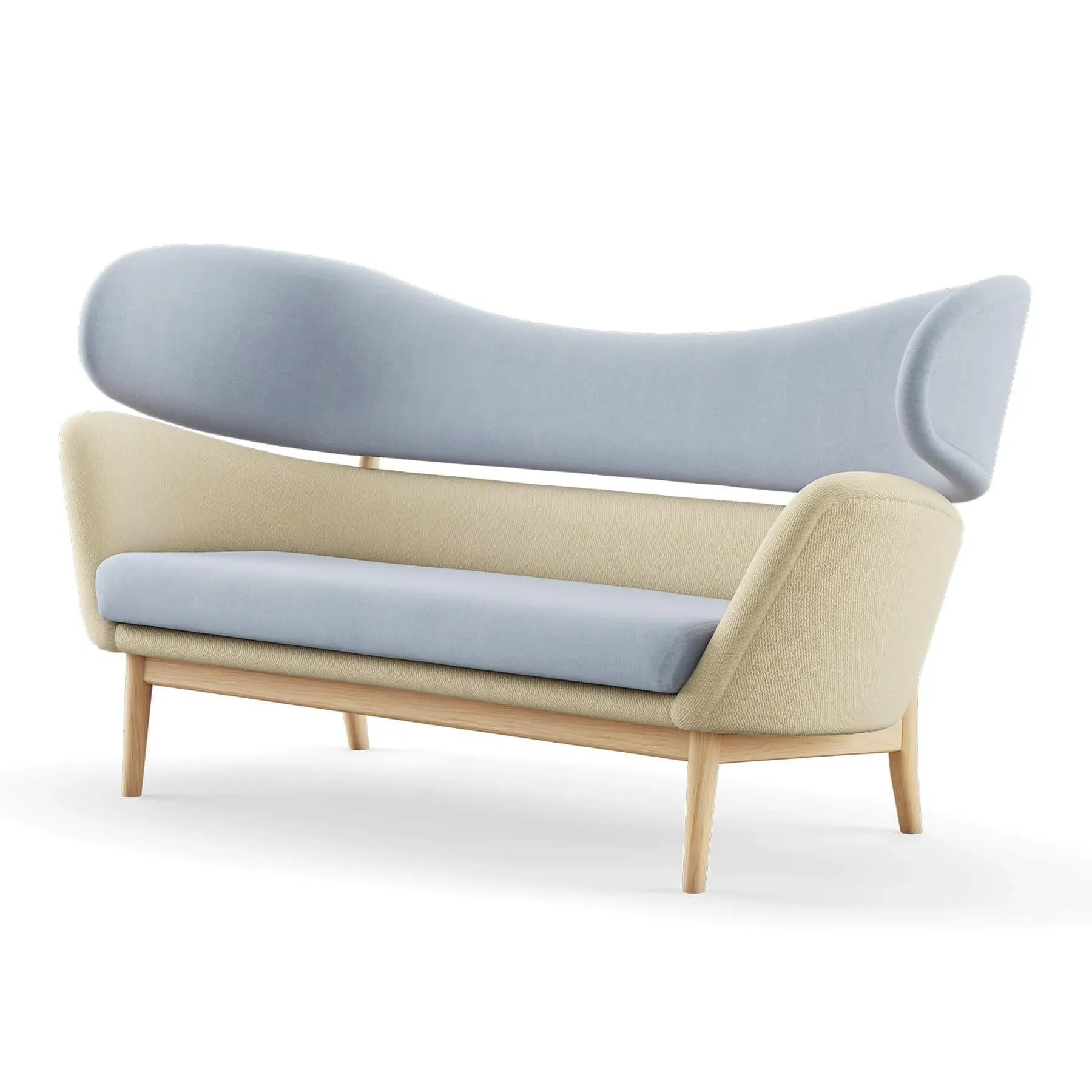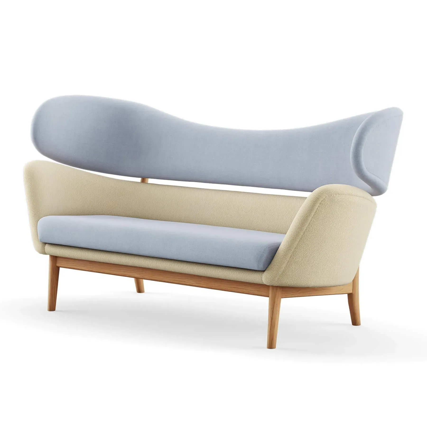 The Baker Sofa offers Danish modern design with its two-piece backrest and sculptural forms. Its hand-sewn upholstery features springs in the cushion for enhanced comfort and durability, while the sturdy wooden frame provides lasting support. The upholstered body rests upon an elegant wood construction that creates visual lightness, and the separated furniture elements add architectural interest.