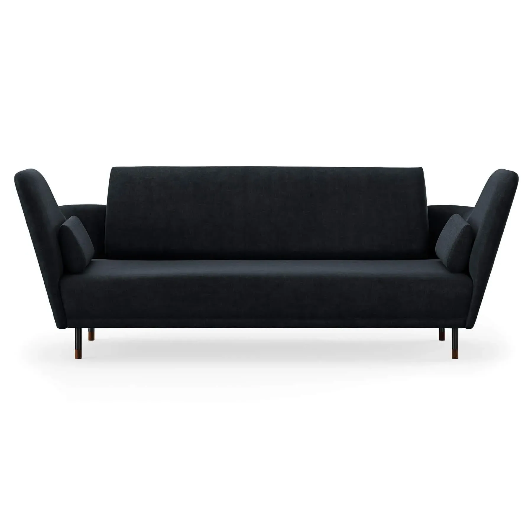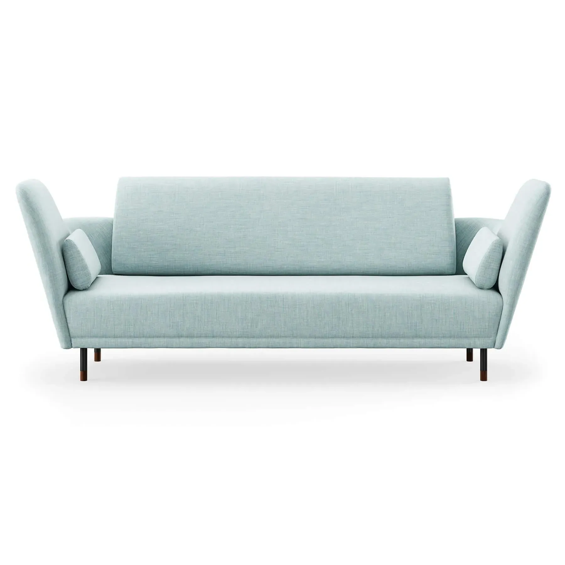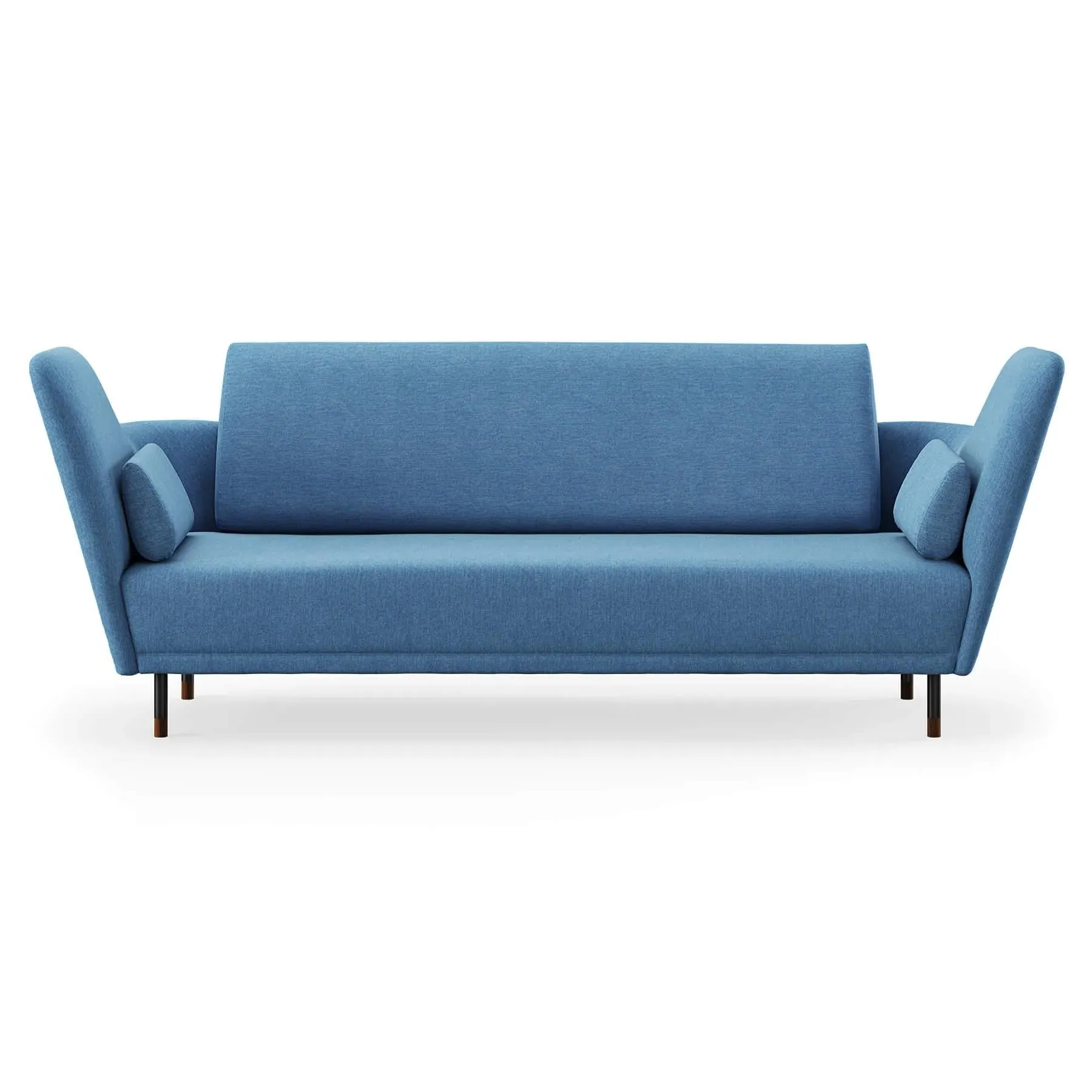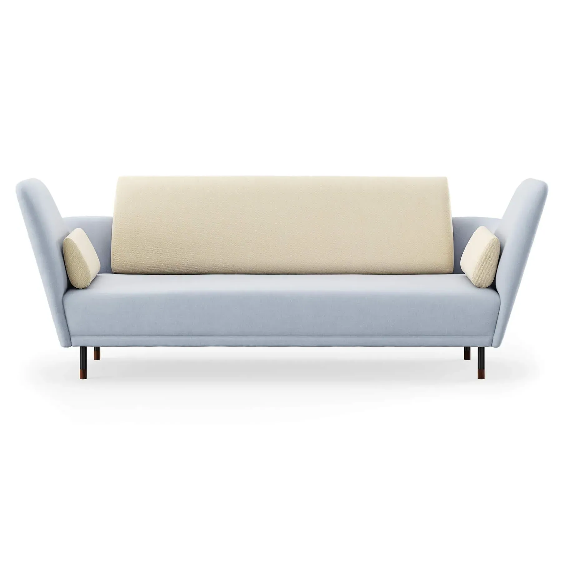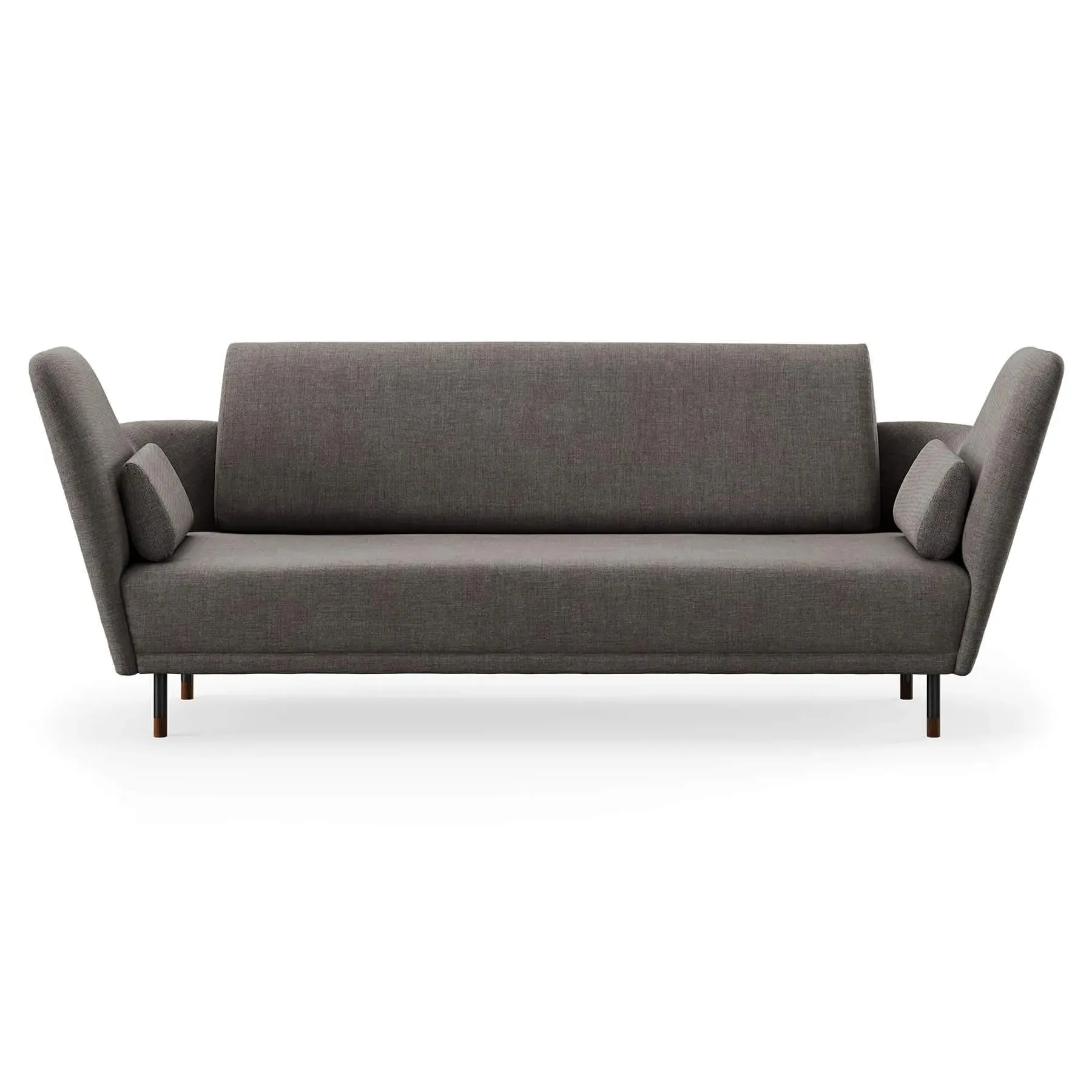 The sofa features a sculptural silhouette with smooth lines and tall armrests that embrace the seat for enhanced comfort. Its hand-sewn upholstery combines with spring construction in the seat to provide lasting support. The steel legs with wooden walnut toes add durability, while the spacious seating area suits relaxed lounging.