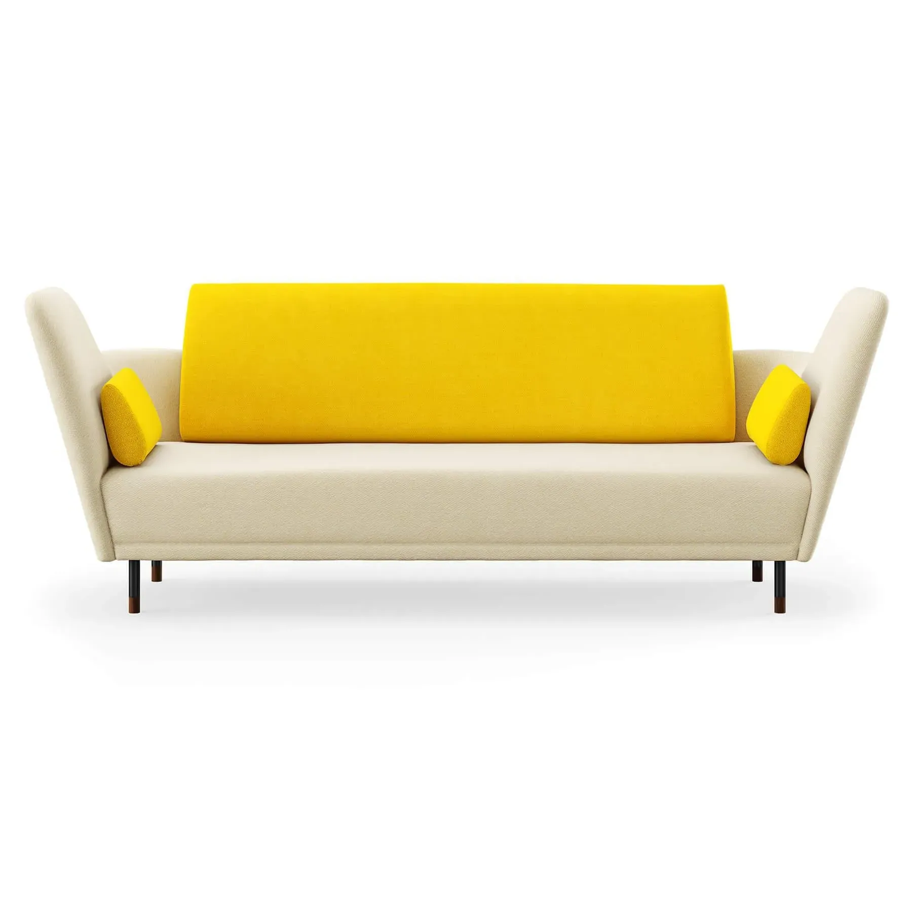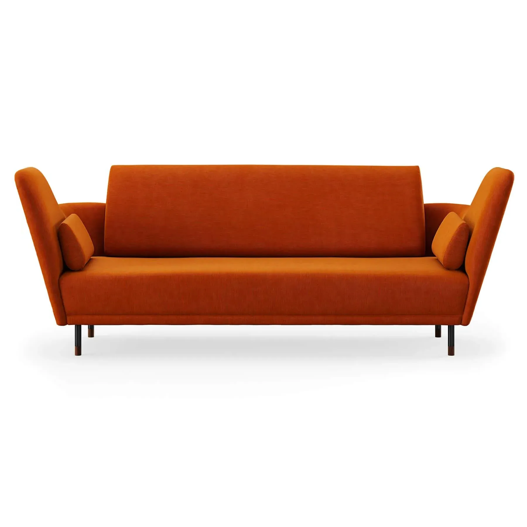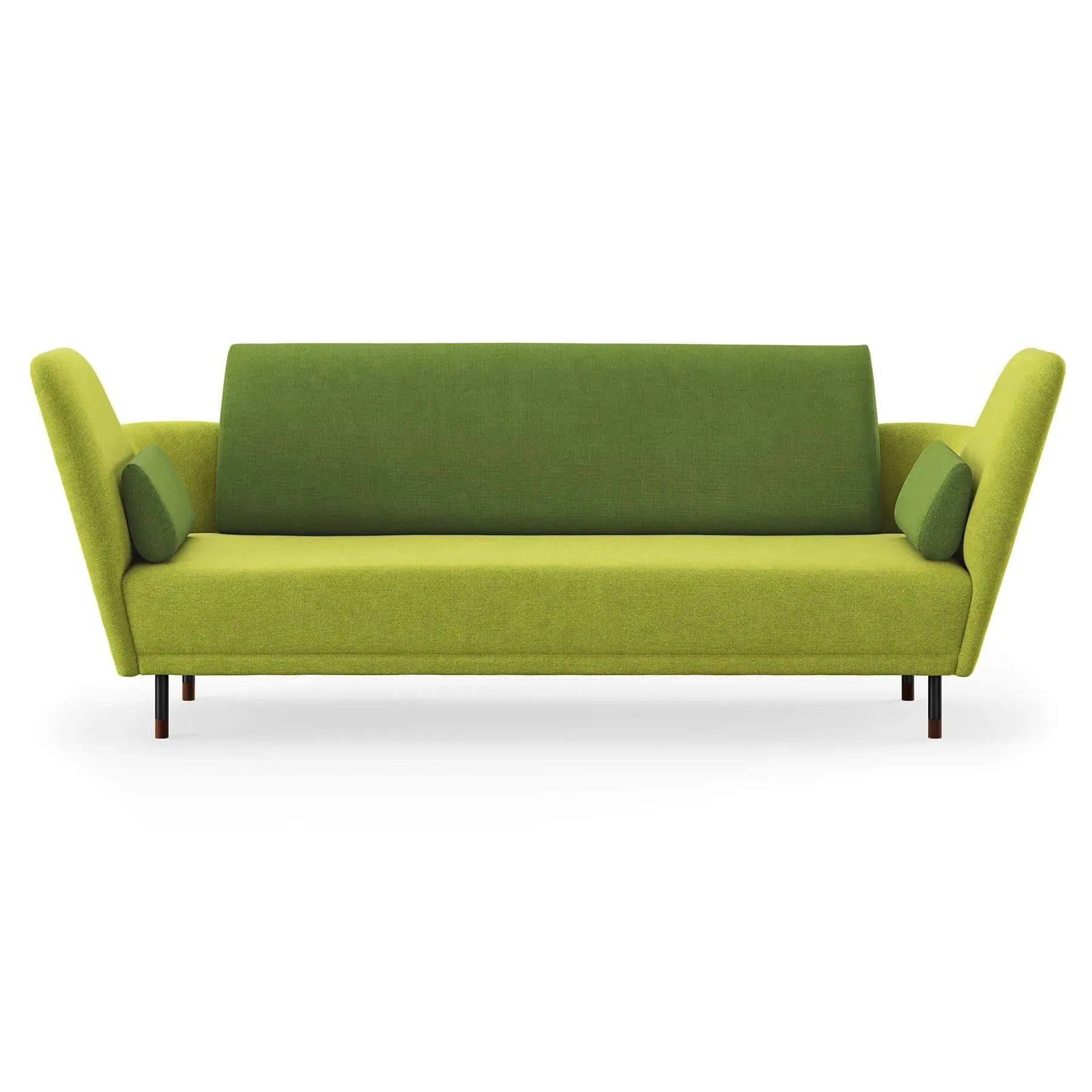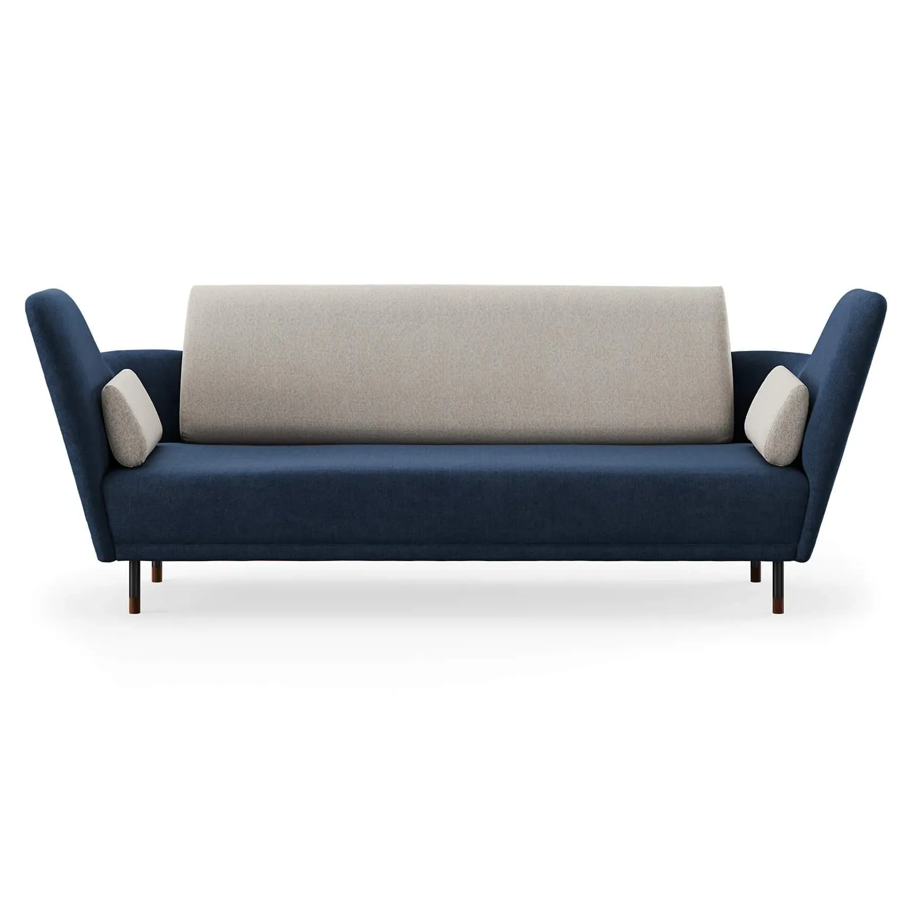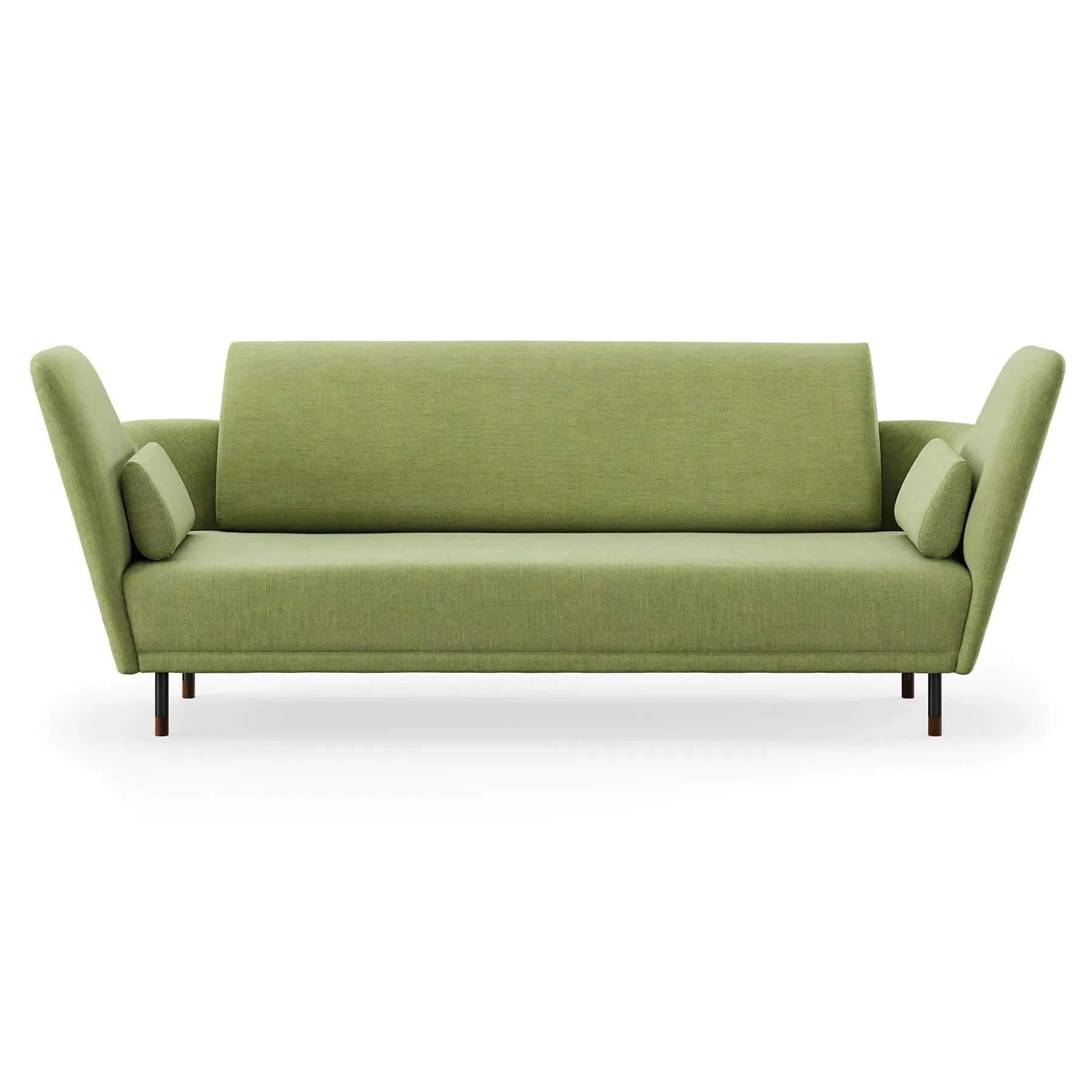 The sofa features a sculptural silhouette with smooth lines and tall armrests that embrace the seat for enhanced comfort. Its hand-sewn upholstery combines with spring construction in the seat to provide lasting support. The steel legs with wooden walnut toes add durability, while the spacious seating area suits relaxed lounging.
