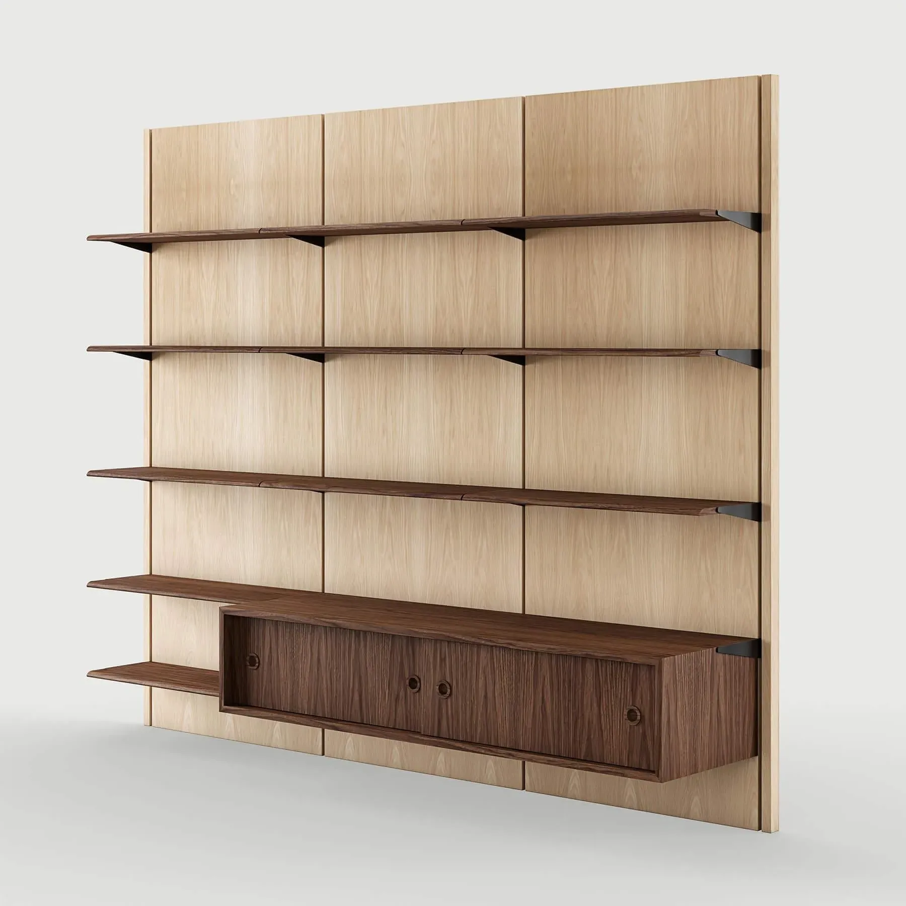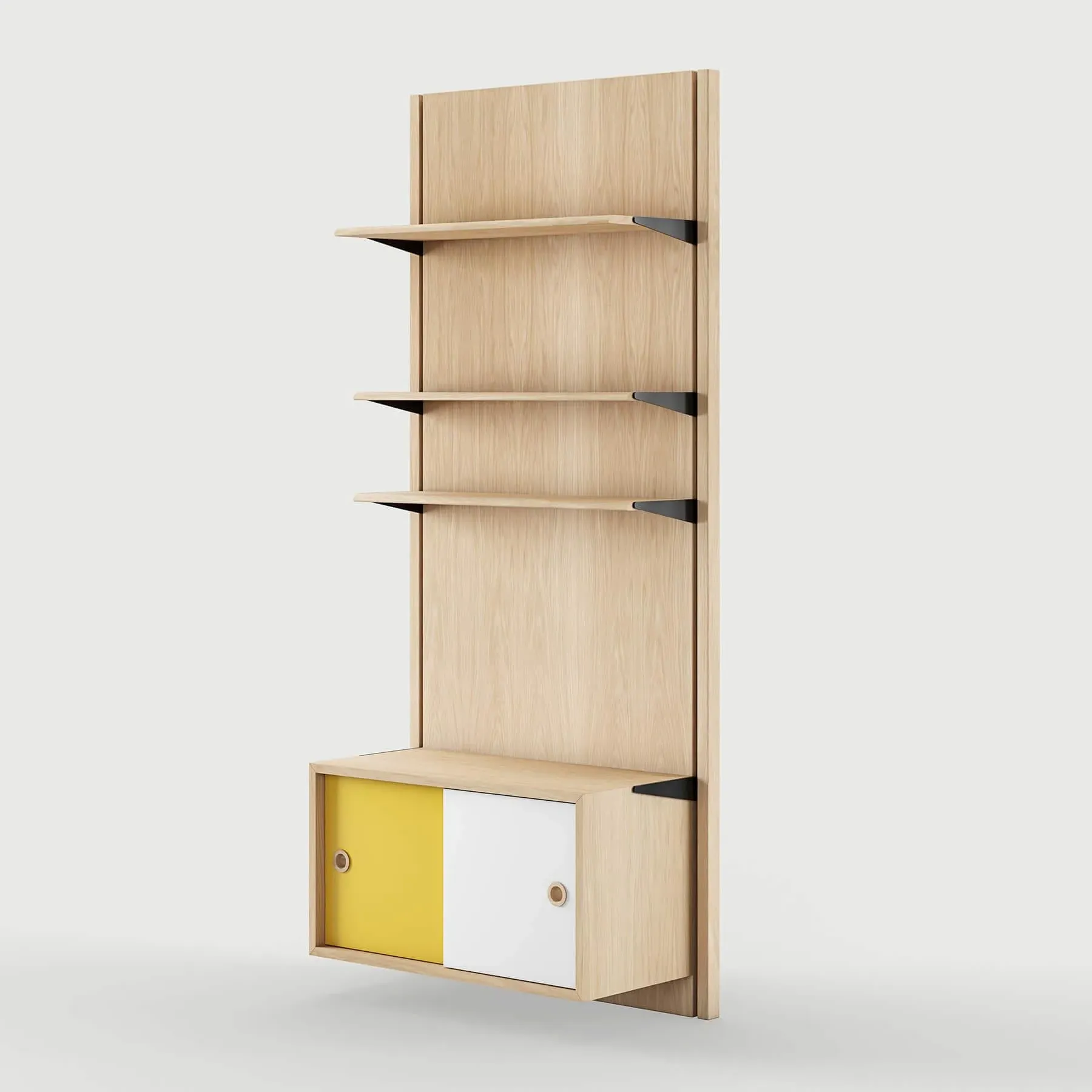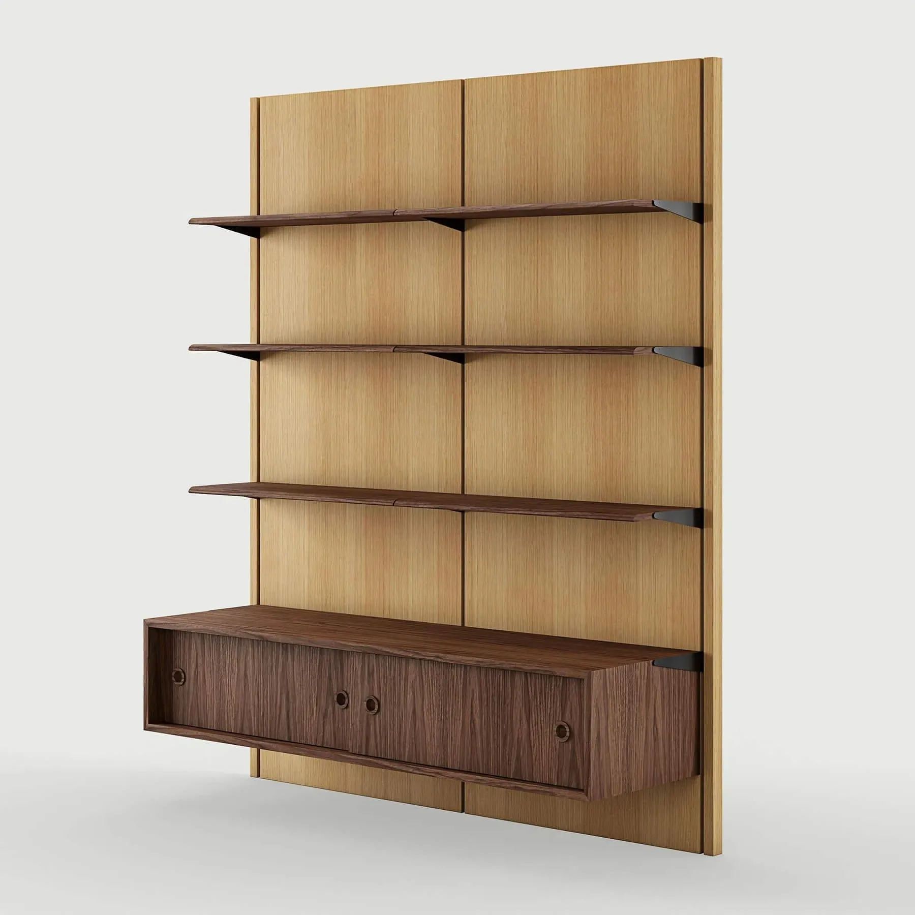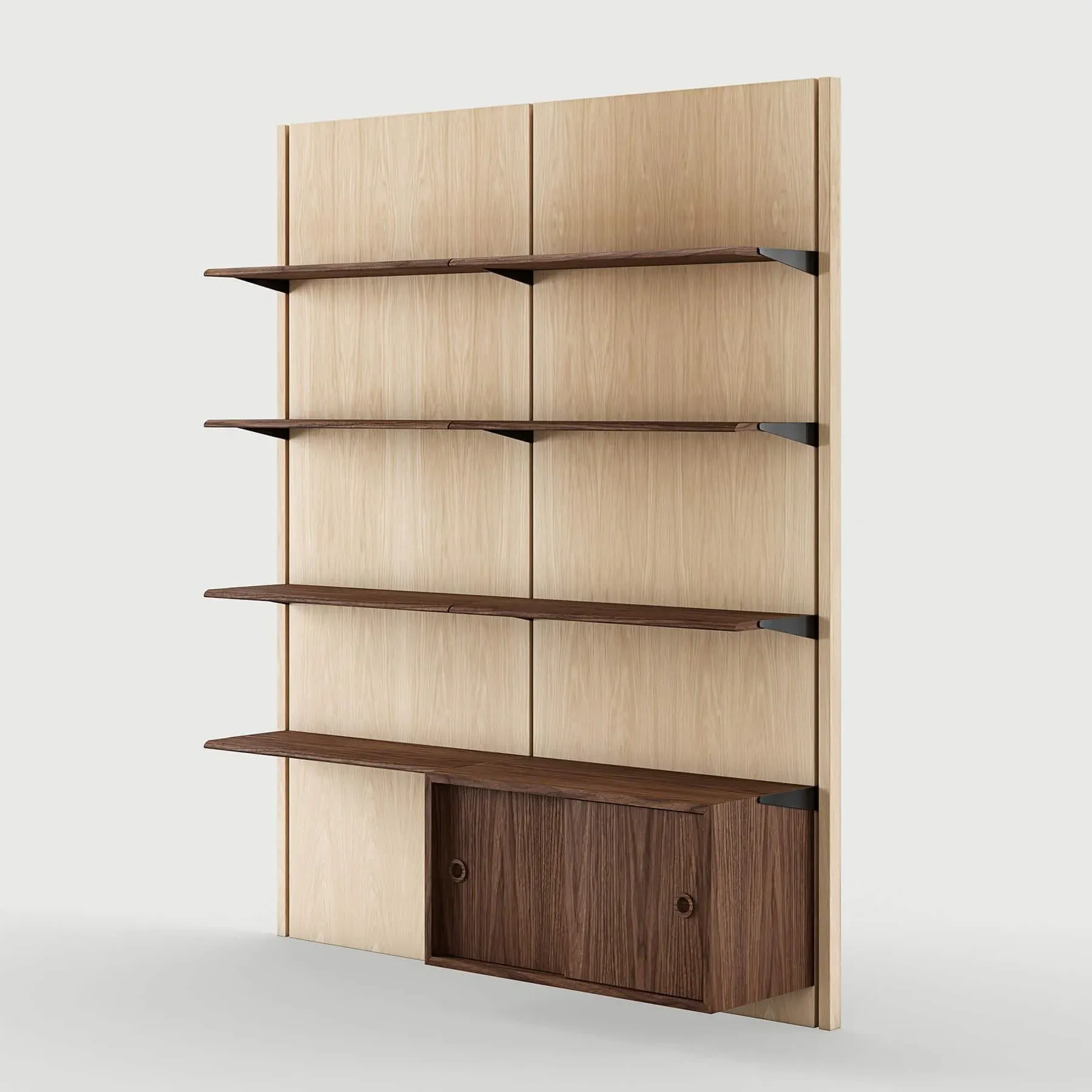 The Panel shelving system is a modern and elegant storage solution designed by Danish architect and designer Finn Juhl in 1953. Juhl was known for his organic approach to design and the Panel system is a perfect example of this, featuring an asymmetrical design that combines solid wood panels and steel supports. Put simply – the Panel system is a classic and, for those in the know, a must have for the office or home. Holloways of Ludlow offer a bespoke, complimentary service to allow you to create a unique panel system, to your own specifications. Mark will guide you step by step through the process of creating your system, rendering an image to allow you to visualise your system, before personally tracking the order from sale to build. To take advantage of this service please email mark@hollowaysofludlow.com. Our friends at Finn Juhl have also created a number of configurations for the Panel system for various spaces and needs. Configuration 1a comprises of: 1 x Start panel 3 x 22cm shelves And a small cupboard, either with a painted finish, or a veneer finish.