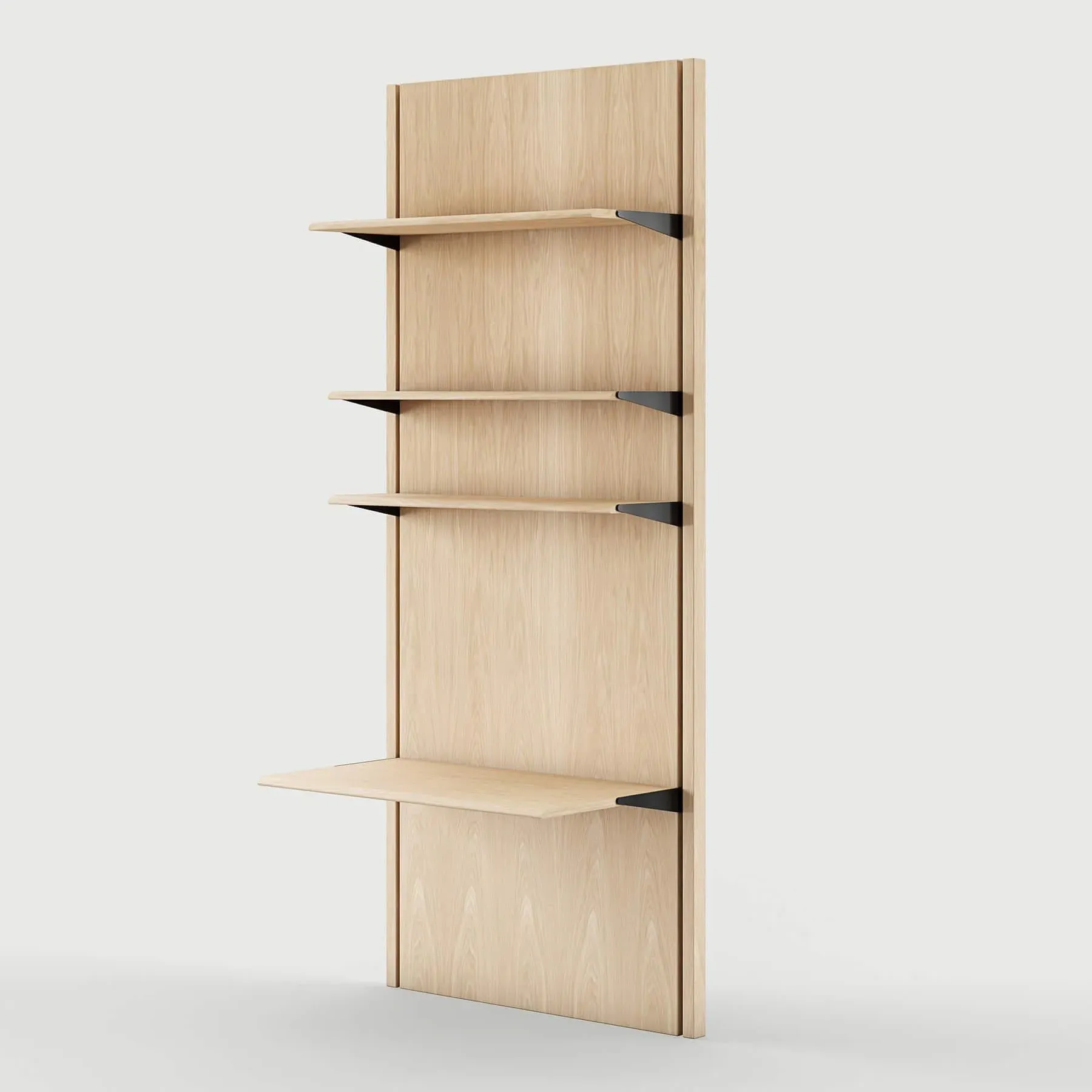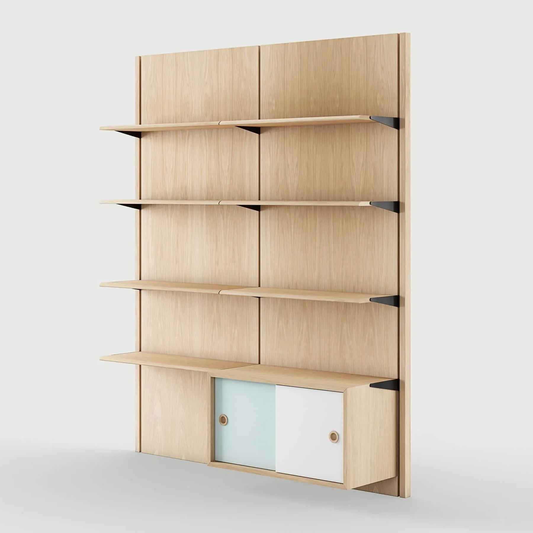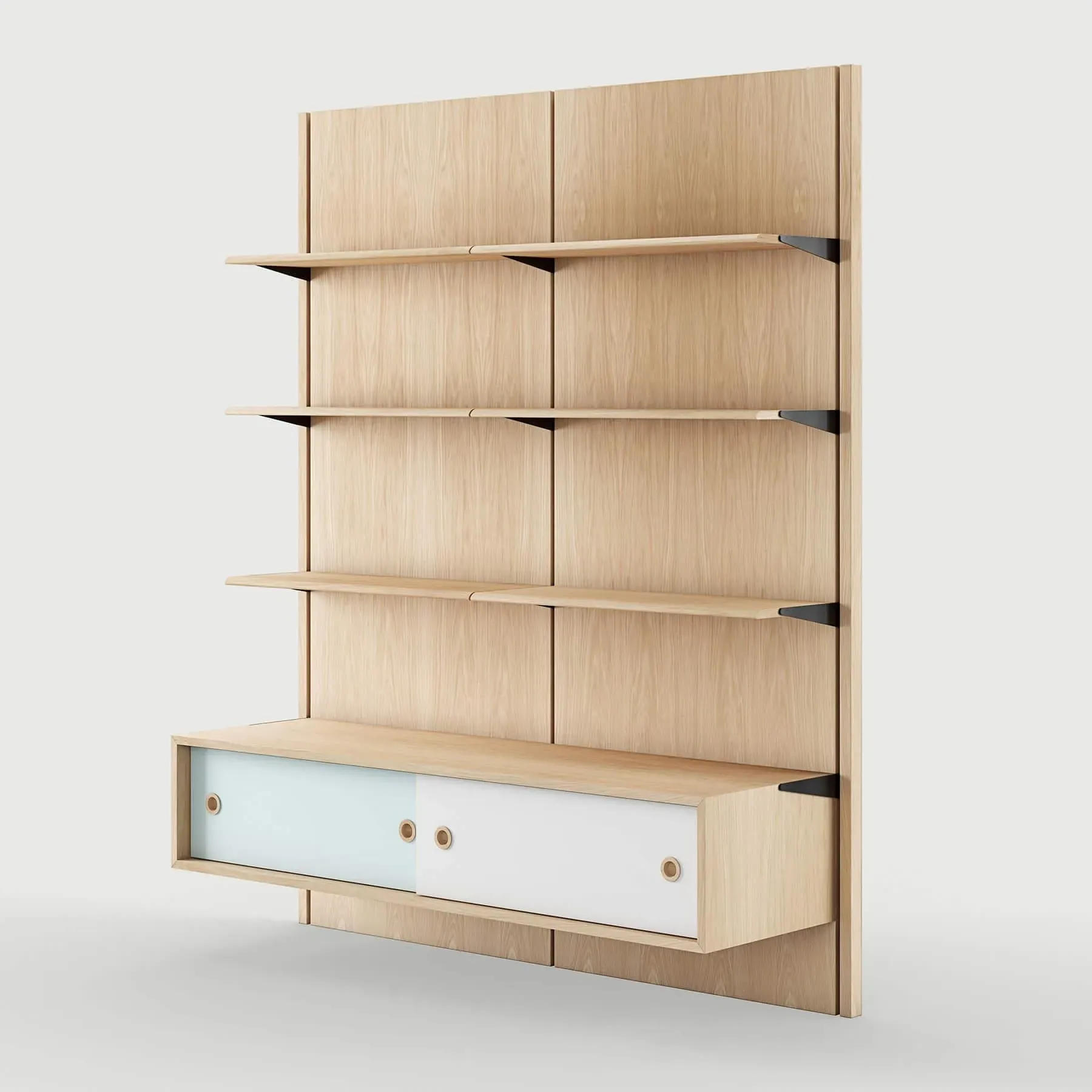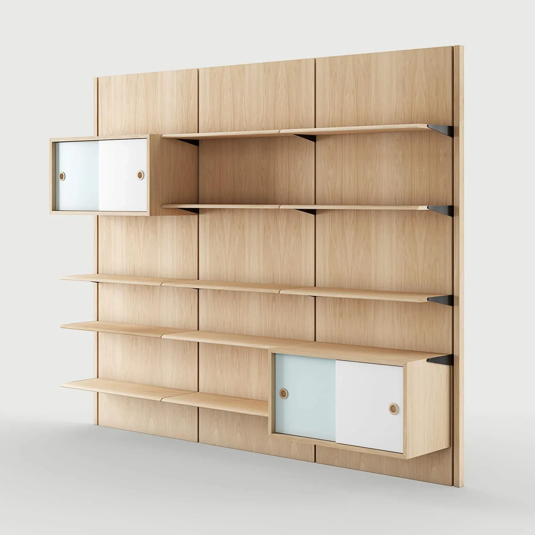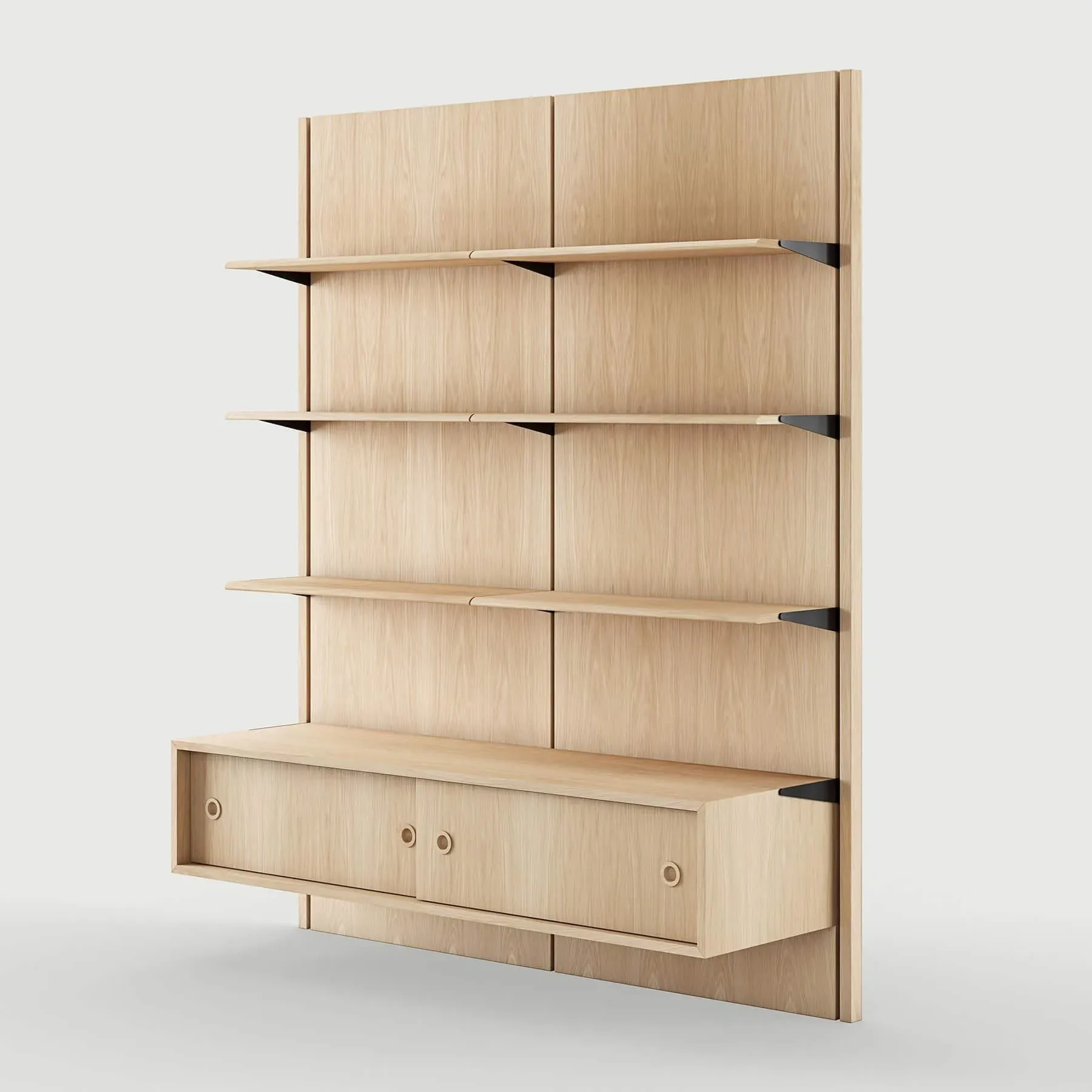 The Panel System offers modular storage with its asymmetrical design, combining solid wood panels and steel supports. Its configuration includes one start panel, three 22cm shelves, and a small cupboard with choice of painted or veneer finish. The system features organic Danish design principles, while the steel framework ensures structural stability and durability.