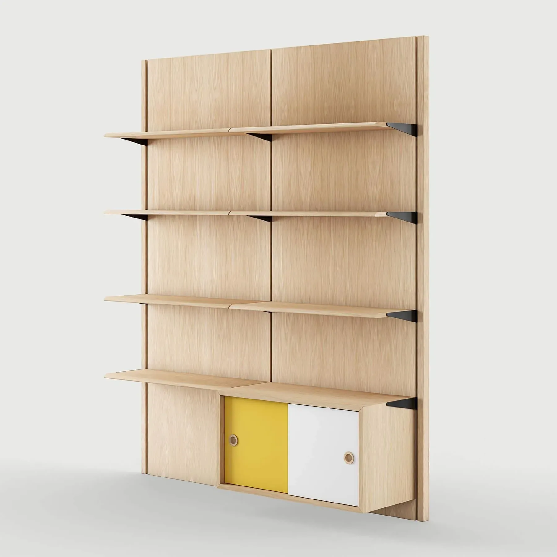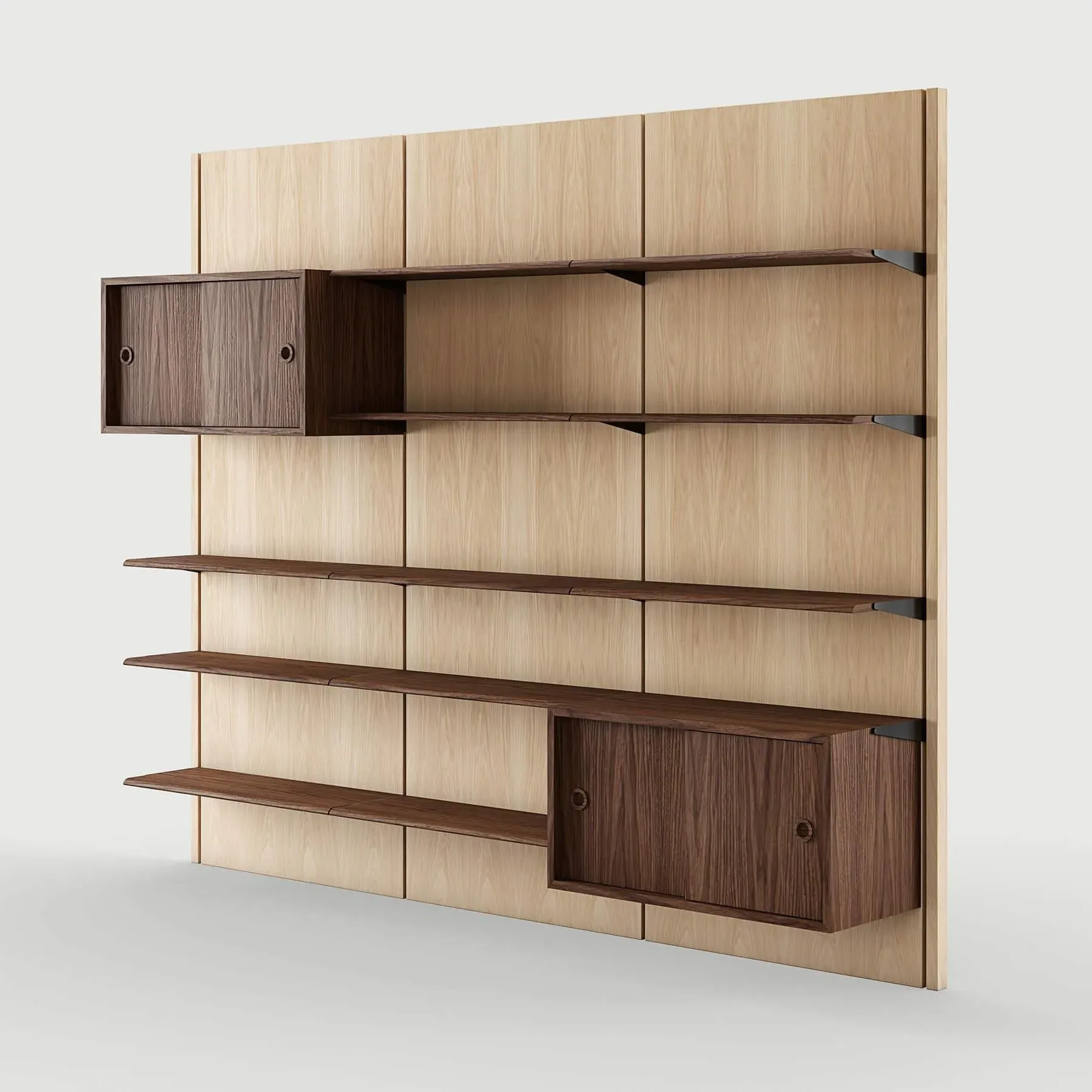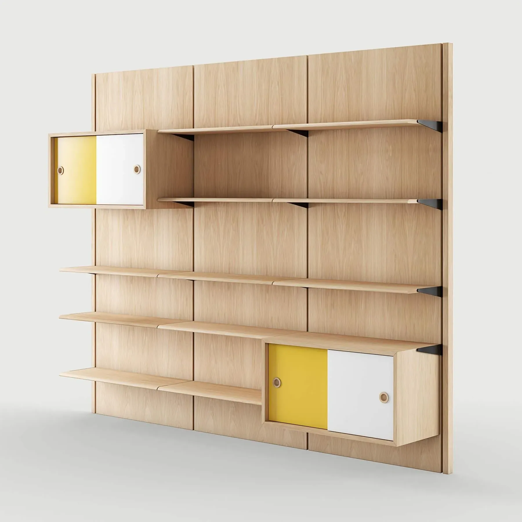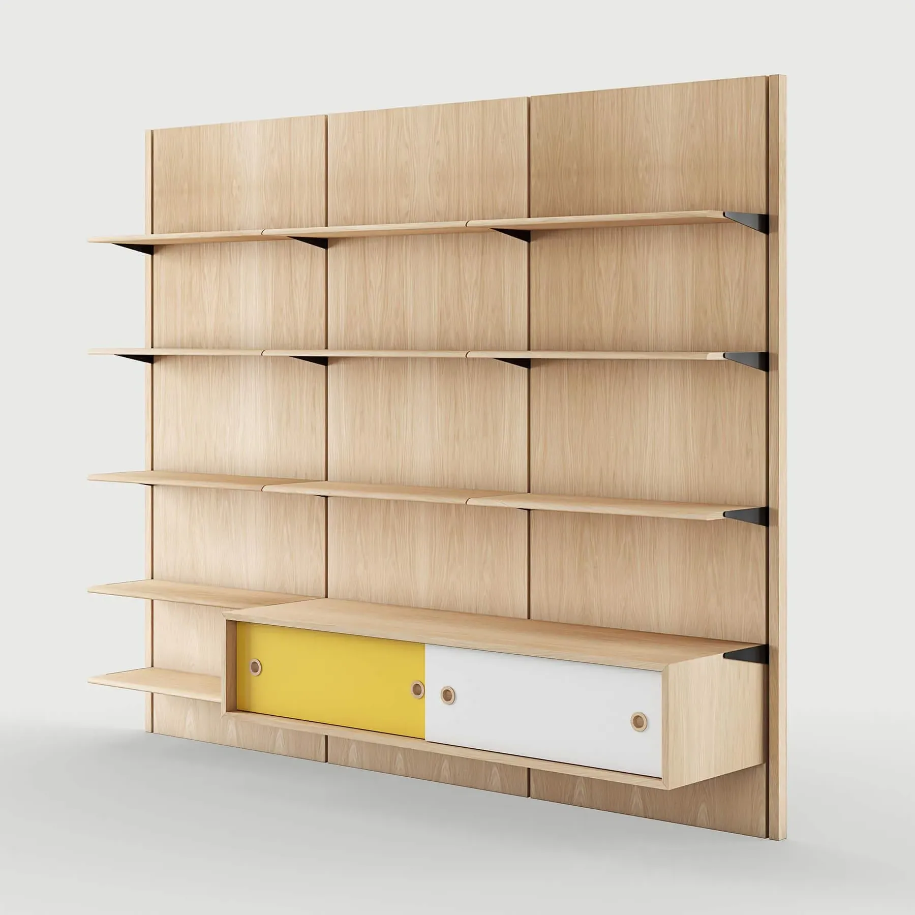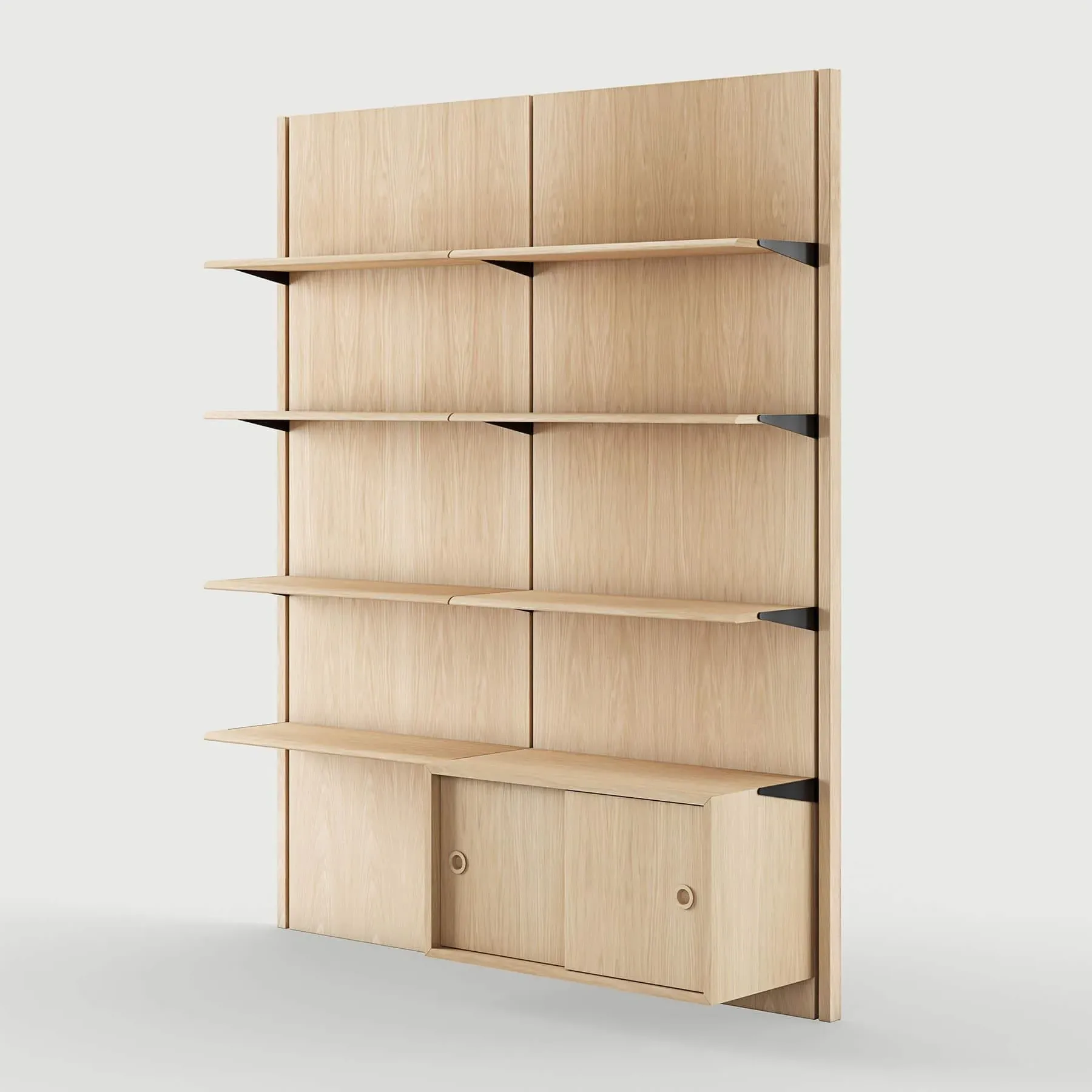 The Panel System offers modular storage with its asymmetrical design, combining solid wood panels and steel supports. Its configuration includes one start panel, three 22cm shelves, and a small cupboard with choice of painted or veneer finish. The system features organic Danish design principles, while the steel framework ensures structural stability and durability.
