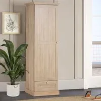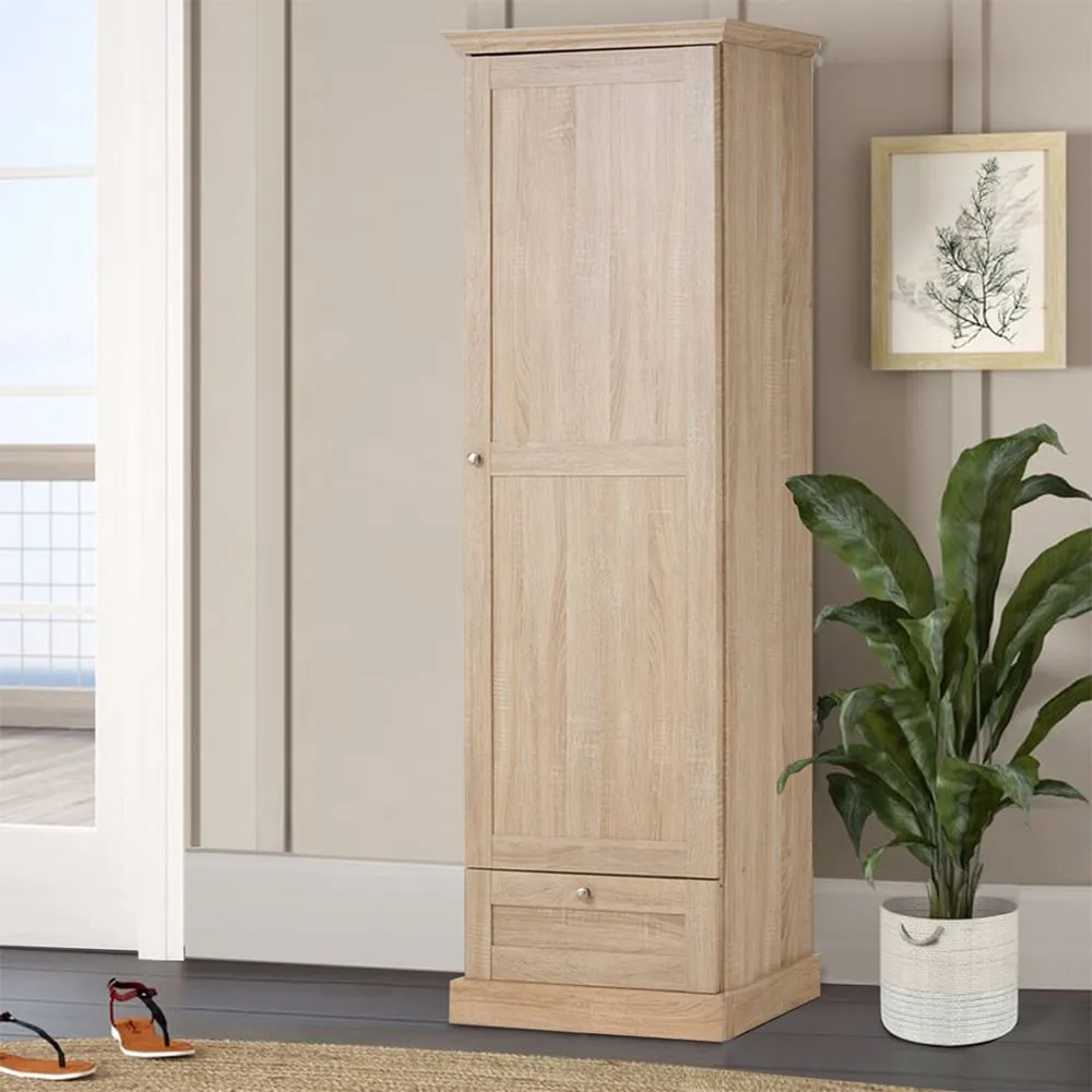 The Clive Storage Cabinet offers practical organization with its single drawer and door compartment design. Crafted from durable engineered wood with a Sonoma Oak finish, it provides versatile storage for small personal items in the drawer while the spacious door cabinet accommodates larger items. The minimalist construction features easy-to-use handles and a compact build that ensures long-lasting durability. W59 x D35 x H70 cm.