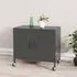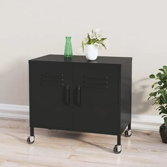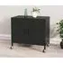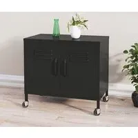 The Emrik Storage Cabinet combines sturdy steel construction with mobile convenience through its four-wheel castor system. Its adjustable shelf provides ample storage space for books, media equipment, and essentials, while the two front wheels feature brakes to prevent accidental movement. The steel frame supports up to 70kg total capacity with air vents on the doors for ventilation. W60 x D35 x H49 cm.