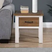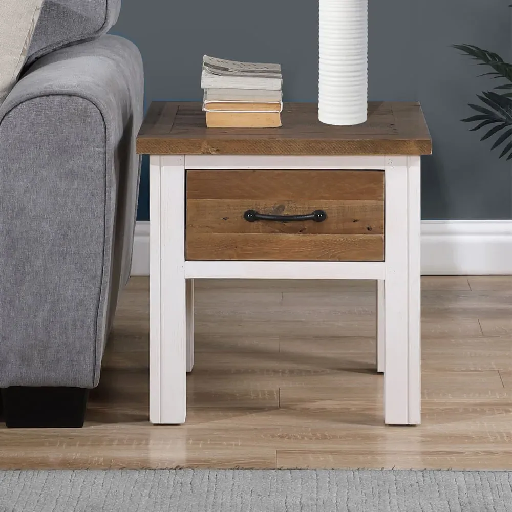 Add a touch of modern rustic charm to your home with the Furniture in Fashion Savona Wooden Square Lamp Table In White And Oak. This elegant piece features a striking two-tone design, combining a matte White base with a natural oak-effect top. Perfectly proportioned, it brings style and practicality to any living room, bedroom, or hallway. Whether used to display a lamp, hold decorative accessories, or serve as a handy side table, the Savona lamp table is both functional and beautiful. Crafted from high-quality wood, it offers durability and timeless appeal, making it a standout addition to your interior decor. This compact yet eye-catching table from Furniture in Fashion is the perfect finishing touch to any space. The Furniture in Fashion Savona Wooden Square Lamp Table In White And Oak is the perfect blend of functionality and design. Elevate your interior with this stylish accent piece that delivers everyday utility with timeless elegance. FEATURES : Material : Wooden Finish : White, Oak Our stunning Savona range boasts an exceptional commitment to sustainability, all external timbers used are 100% reclaimed, helping us to contribute to a greener, more beautiful world The collection is produced largely by hand by skilled craftsmen During the timber preparation, they leave all nail holes and scars to try and maintain as much of the 'weathered wood' appearance as possible, making each piece unique and characterful The painted sections undergo a meticulous hand-spraying process, repeated until the designer's envisioned appearance is flawlessly attained The natural (non-painted) areas have been prepared using a similar method, but instead a clear protective lacquer is used, so you can see the beauty and character of every piece of timber This is a high end collection, designed to last a lifetime Versatility : Ideal for living rooms, bedrooms, or hallways Style : Blends seamlessly with both classic and contemporary decor Use : Perfect for displa