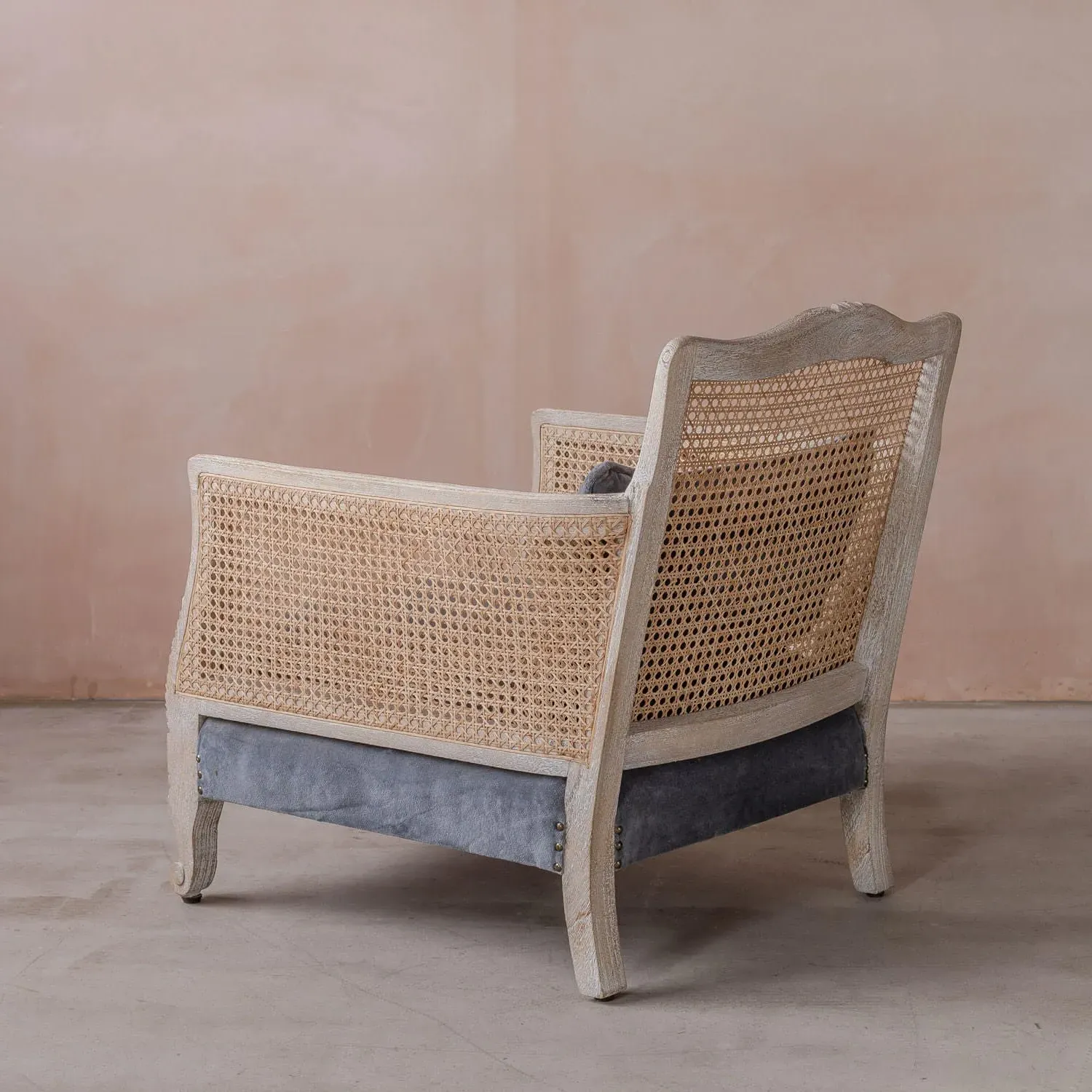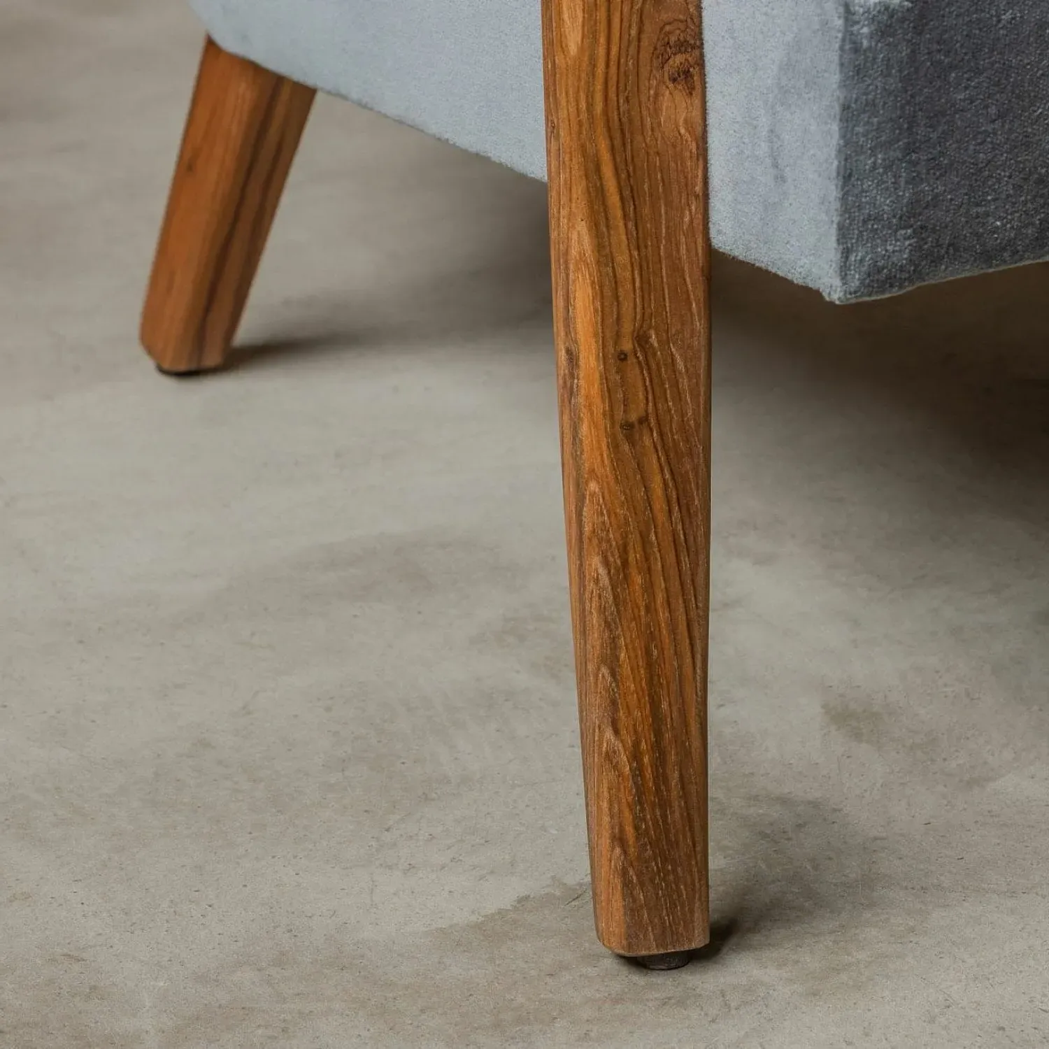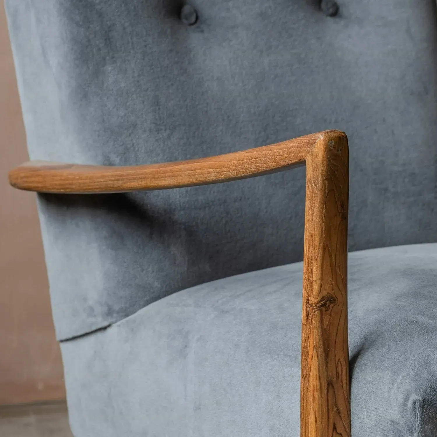 The Myles armchair provides sophisticated dining comfort with its cool grey velvet upholstery and brass stud detailing. Its natural mango wood frame elegantly blends modern form with classic craftsmanship, while the upholstered design offers enhanced seating comfort. The handmade construction ensures quality and durability. W57 x D56 x H85 cm.