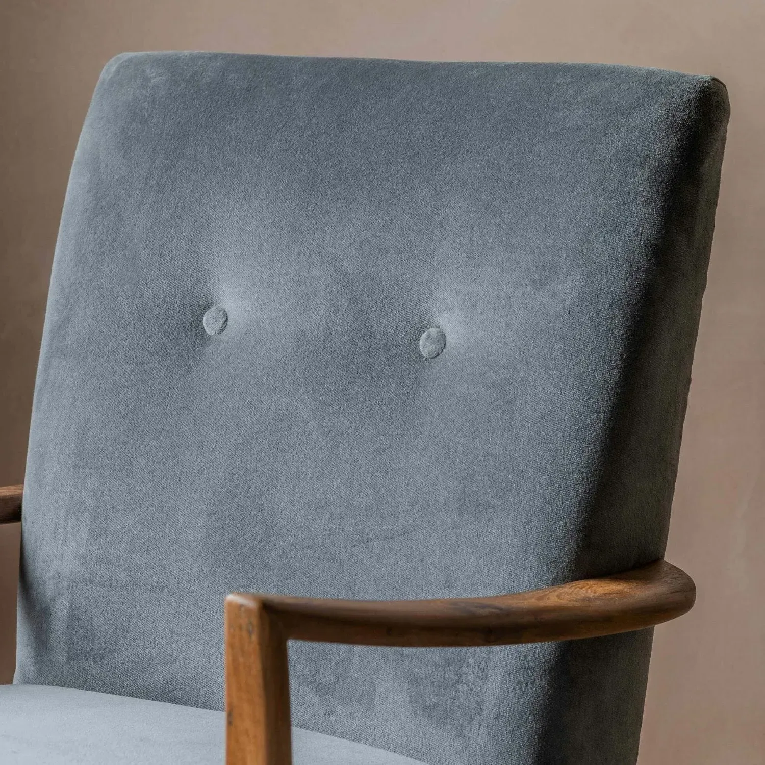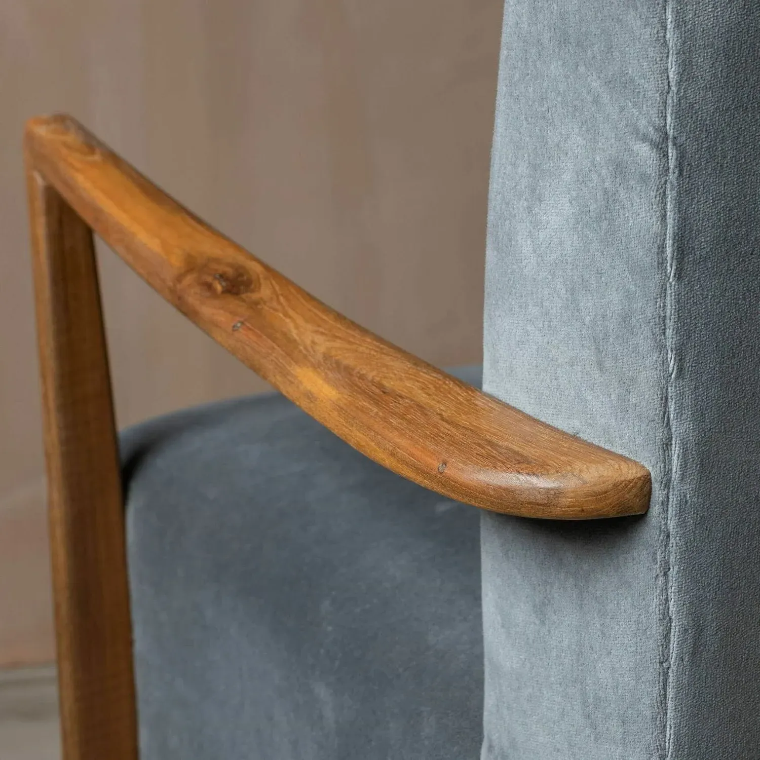 Whether styled alongside a mix of velvet and wooden dining chairs or neatly matched as a set, this upholstered dining armchair is a sophisticated choice. Finished in cool grey velvet with brass stud detailing, its natural mango wood frame elegantly blends modern form with classic craftsmanship. H85 x W57 x D56cm. Handmade from mango wood and upholstered in velvet. Wipe with a soft, dry cloth or velvet brush. The velvet colour may vary depending on the light.