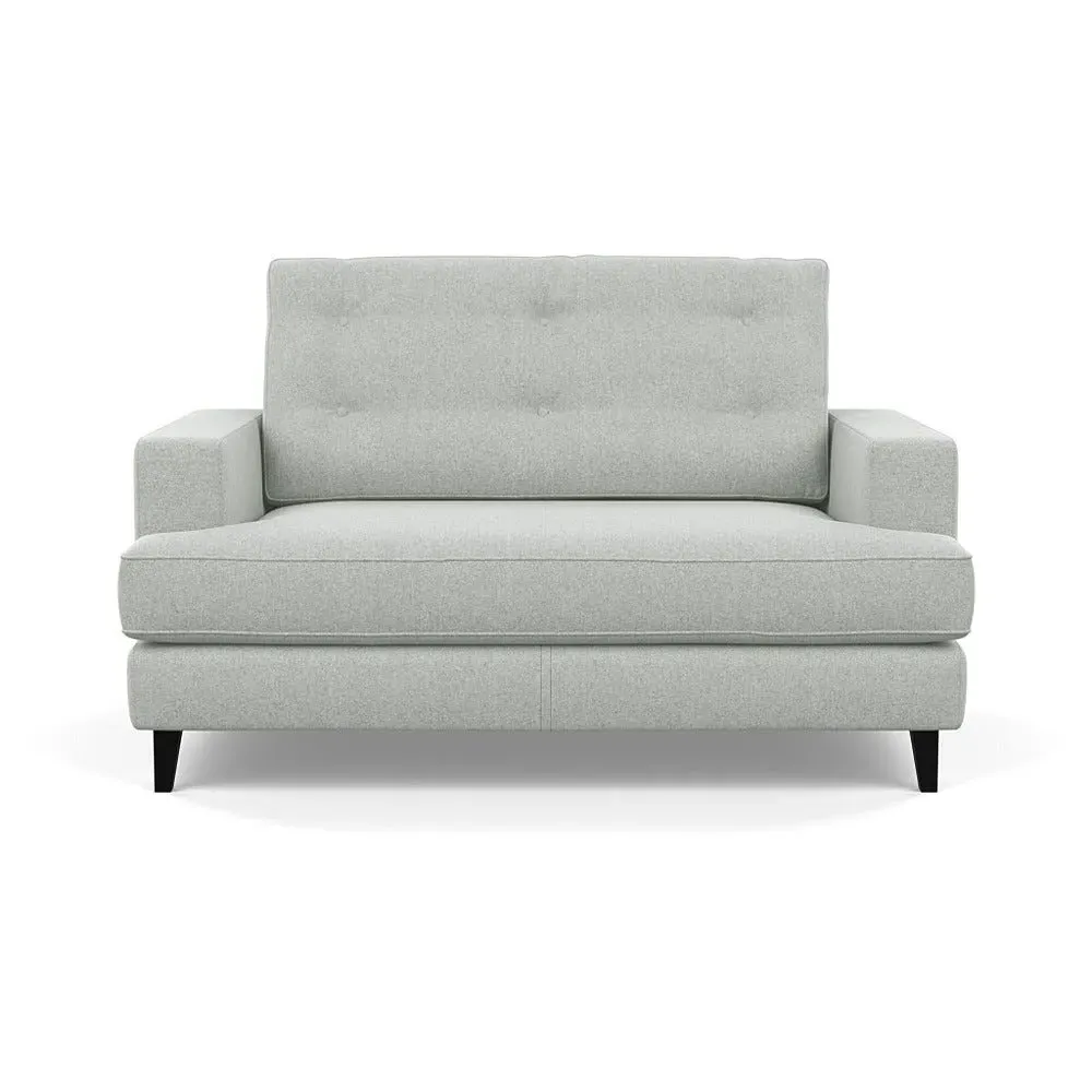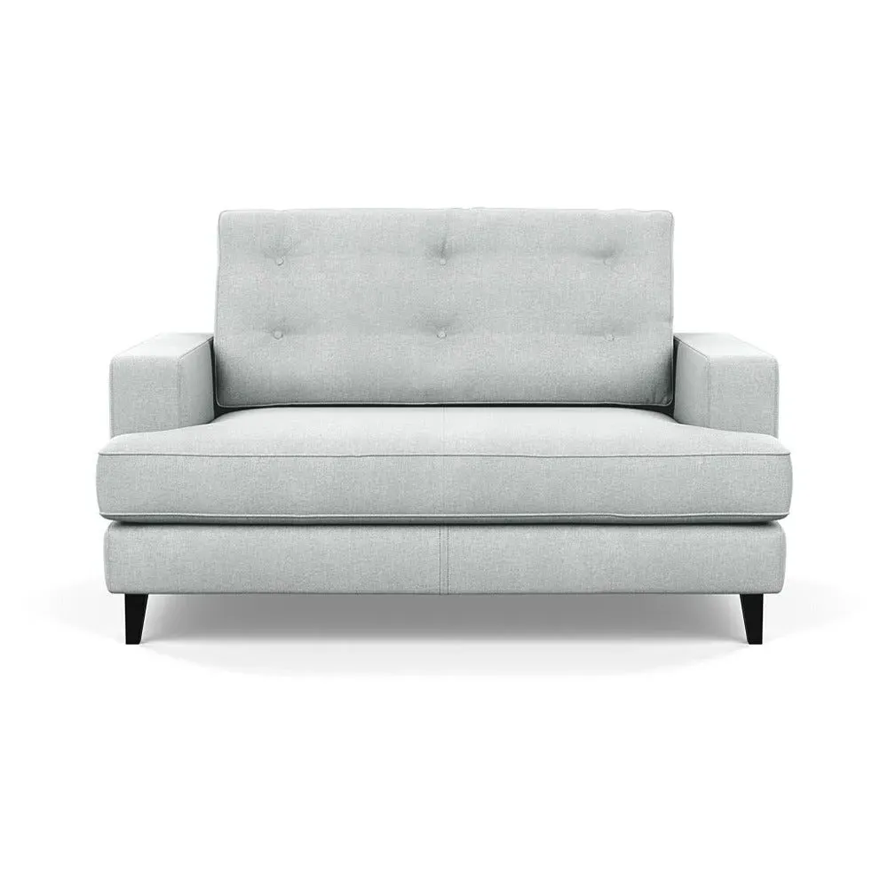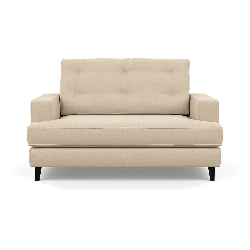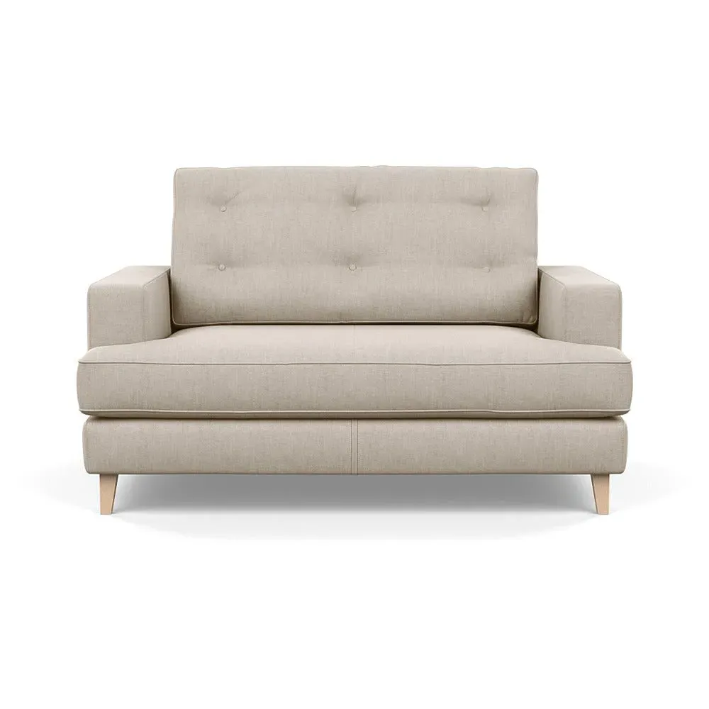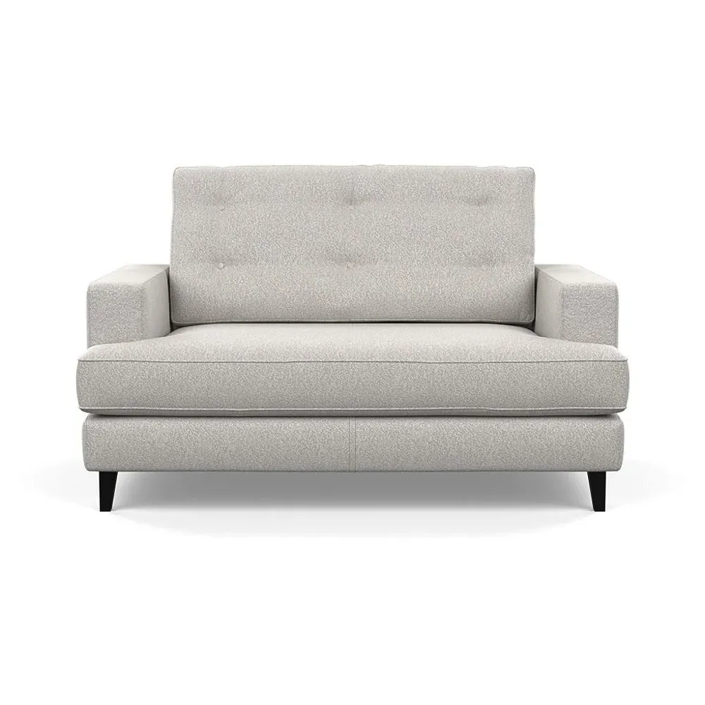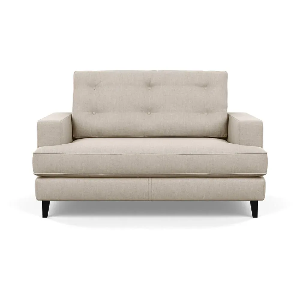 The loveseat combines mid-century design with contemporary comfort, featuring a fully-upholstered frame with matching piping detail. Its supportive padded seat and button-tufted cushion provide lasting comfort, while the bolstered backrest adds extra support. The sturdy birch wood frame offers durability with its webbed seat structure, and the sleek tapered beech wood feet complete the retro-inspired aesthetic.