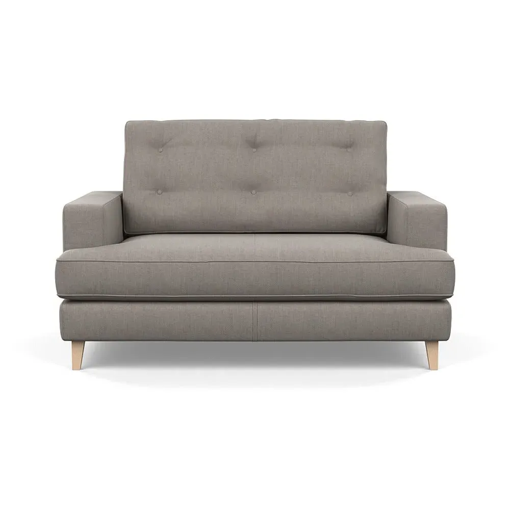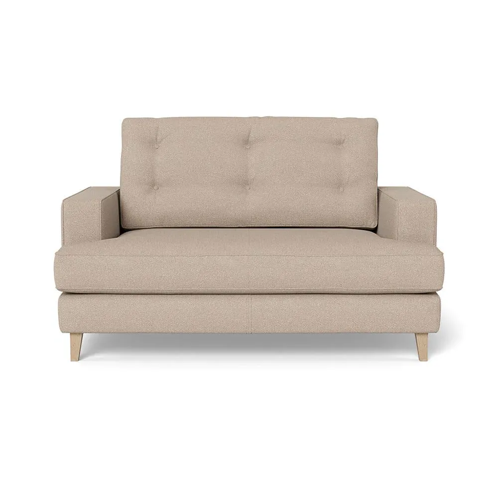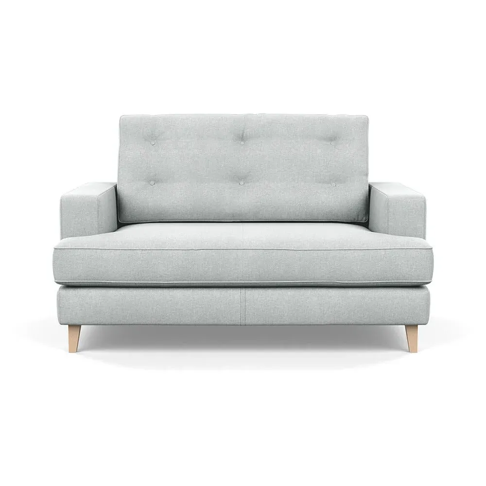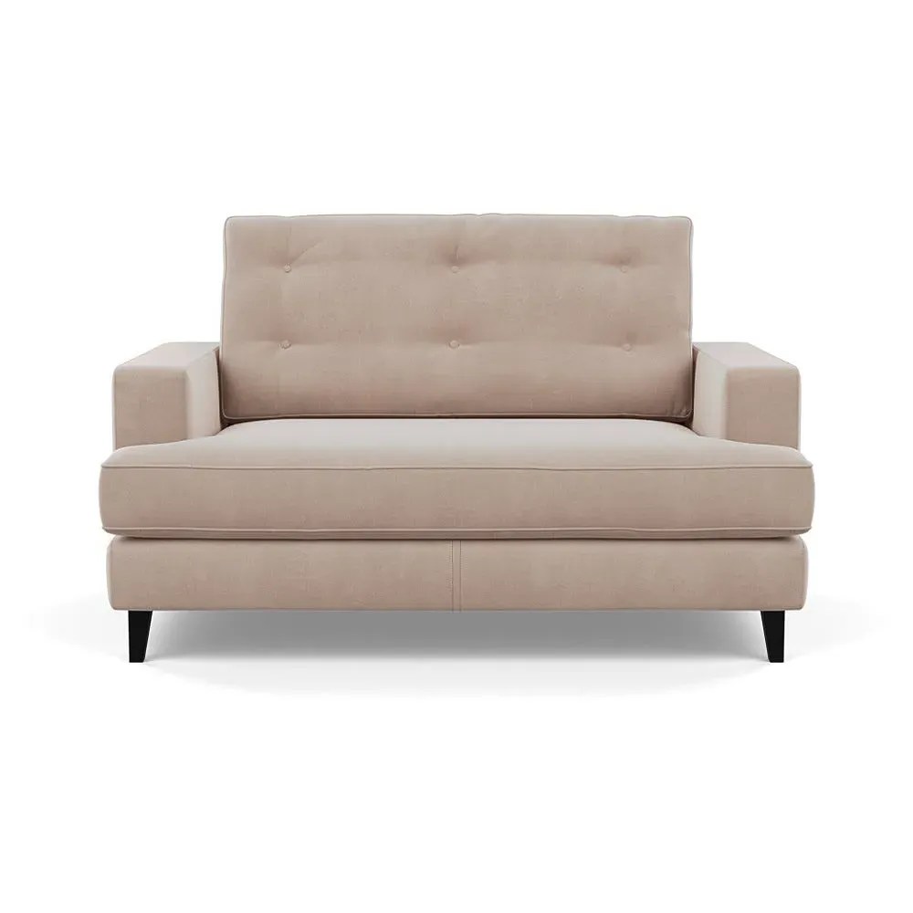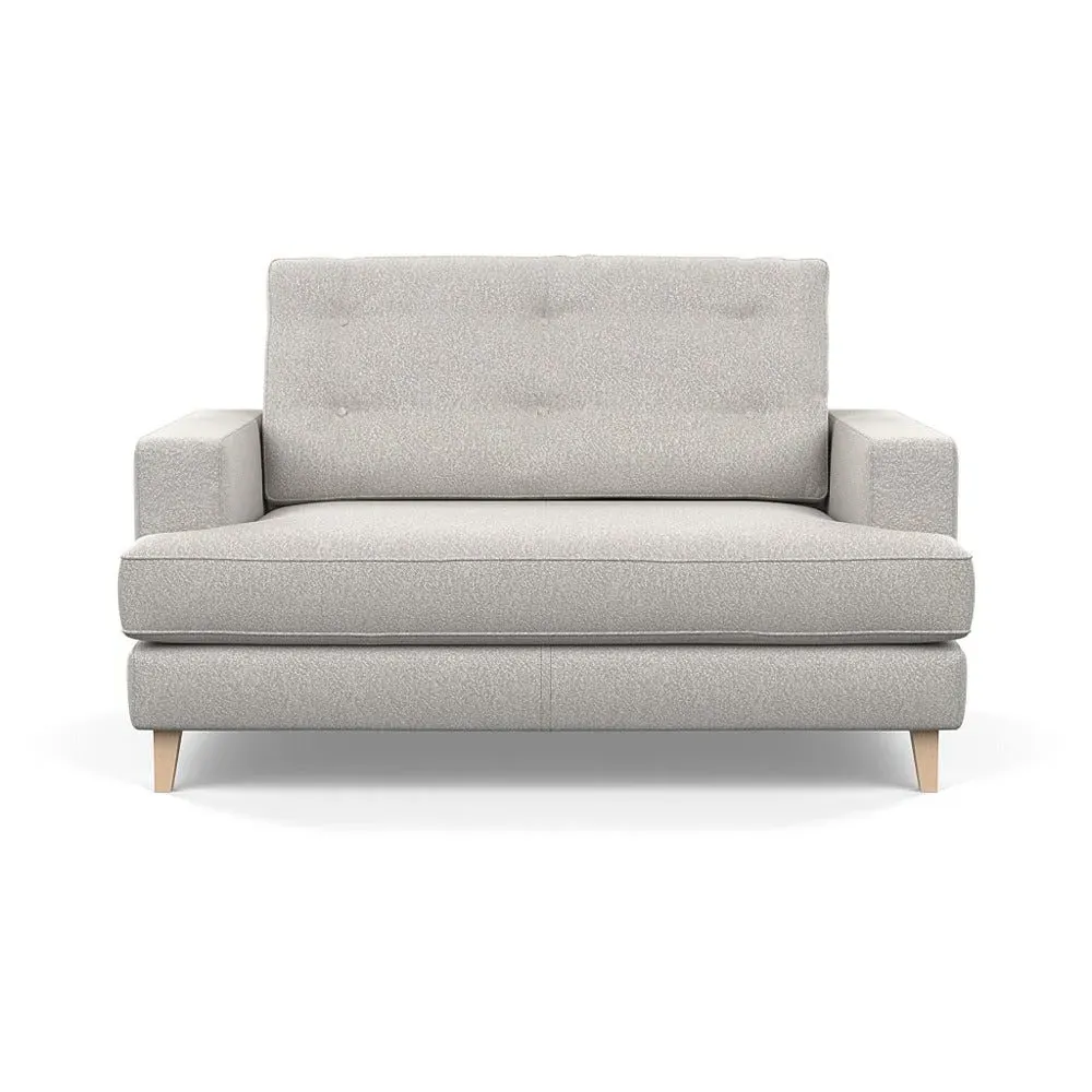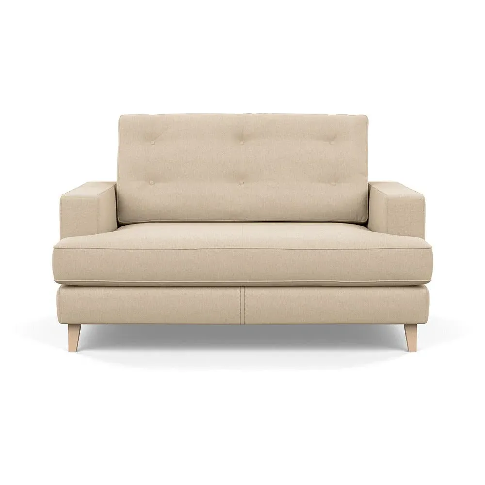The loveseat combines mid-century design with contemporary comfort, featuring a fully-upholstered frame with matching piping detail. Its supportive padded seat and button-tufted cushion provide lasting comfort, while the bolstered backrest adds extra support. The sturdy birch wood frame offers durability with its webbed seat structure, and the sleek tapered beech wood feet complete the retro-inspired aesthetic.