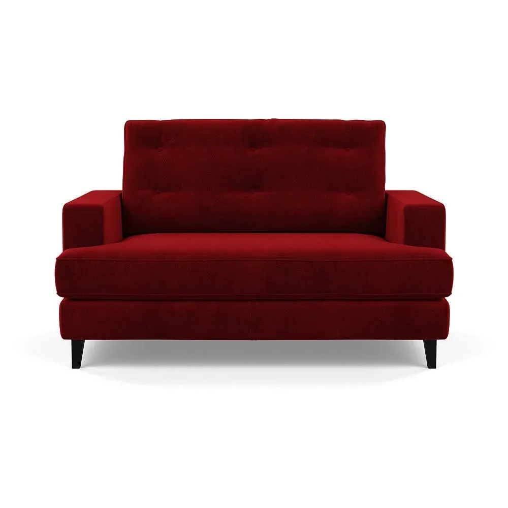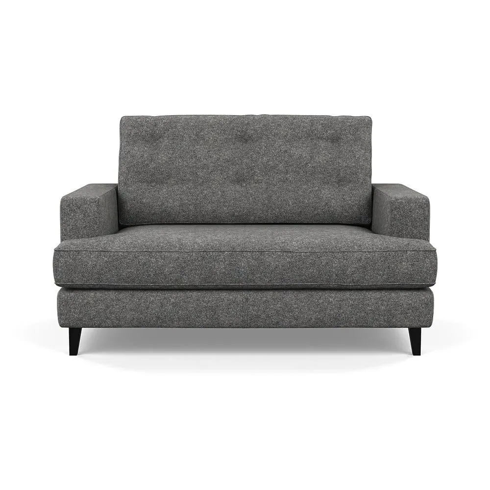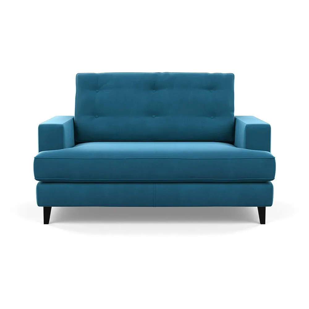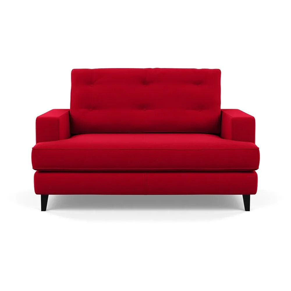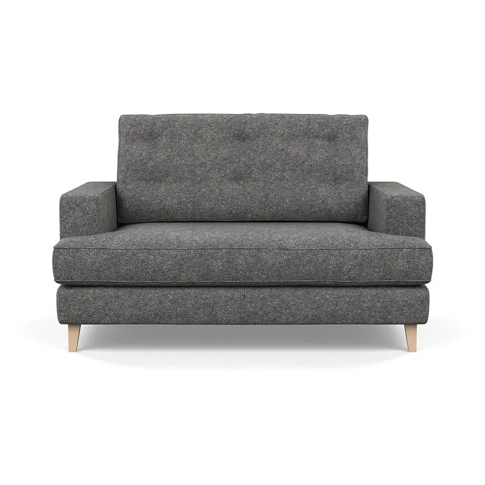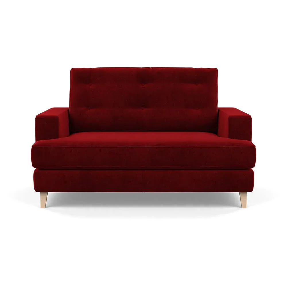 The loveseat combines mid-century design with contemporary comfort, featuring a fully-upholstered frame with matching piping detail. Its supportive padded seat and button-tufted cushion provide lasting comfort, while the bolstered backrest adds extra support. The sturdy birch wood frame offers durability with its webbed seat structure, and the sleek tapered beech wood feet complete the retro-inspired aesthetic.