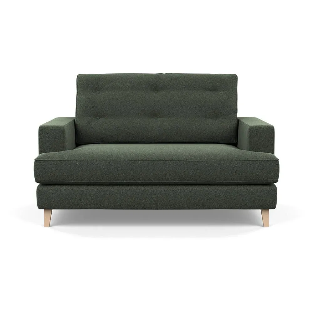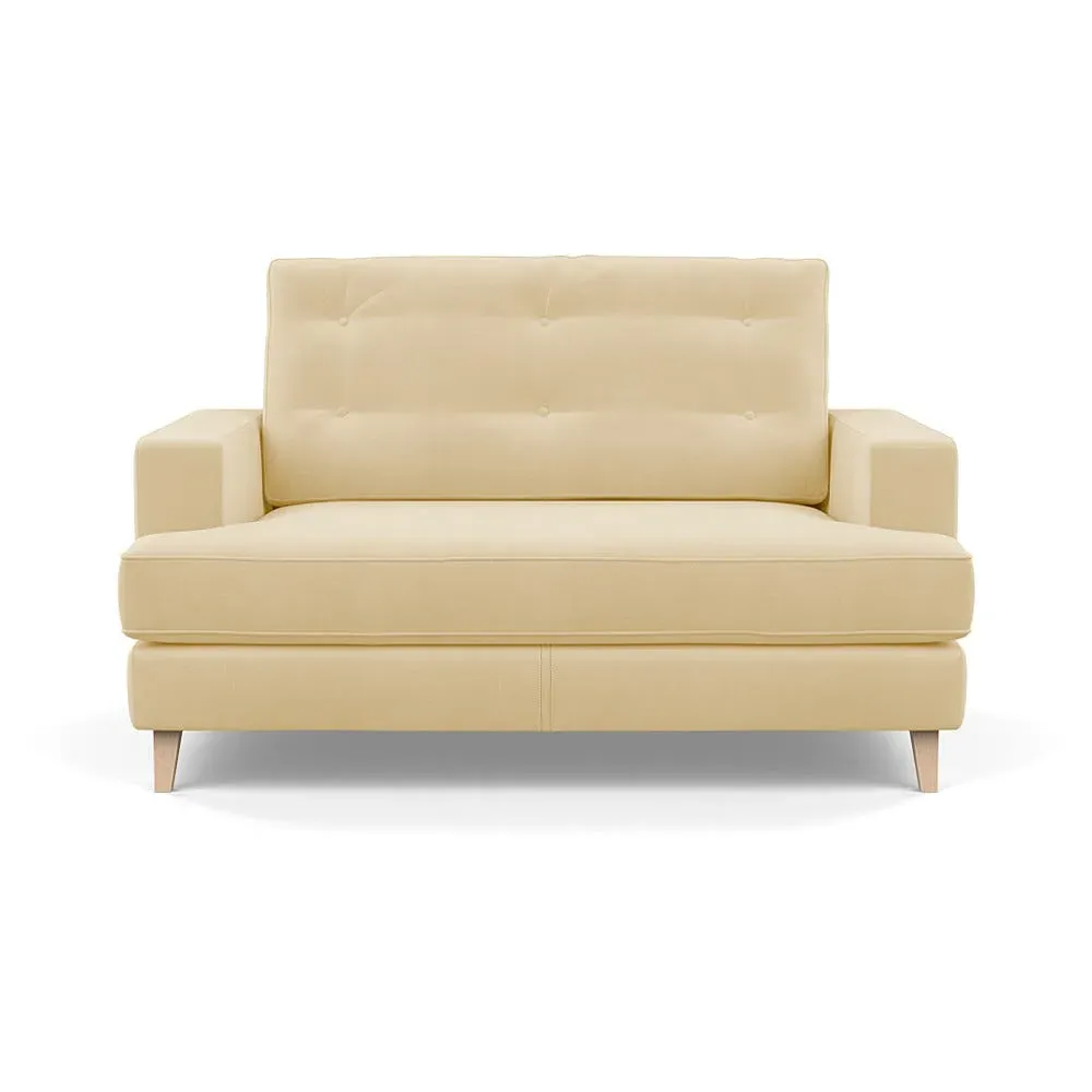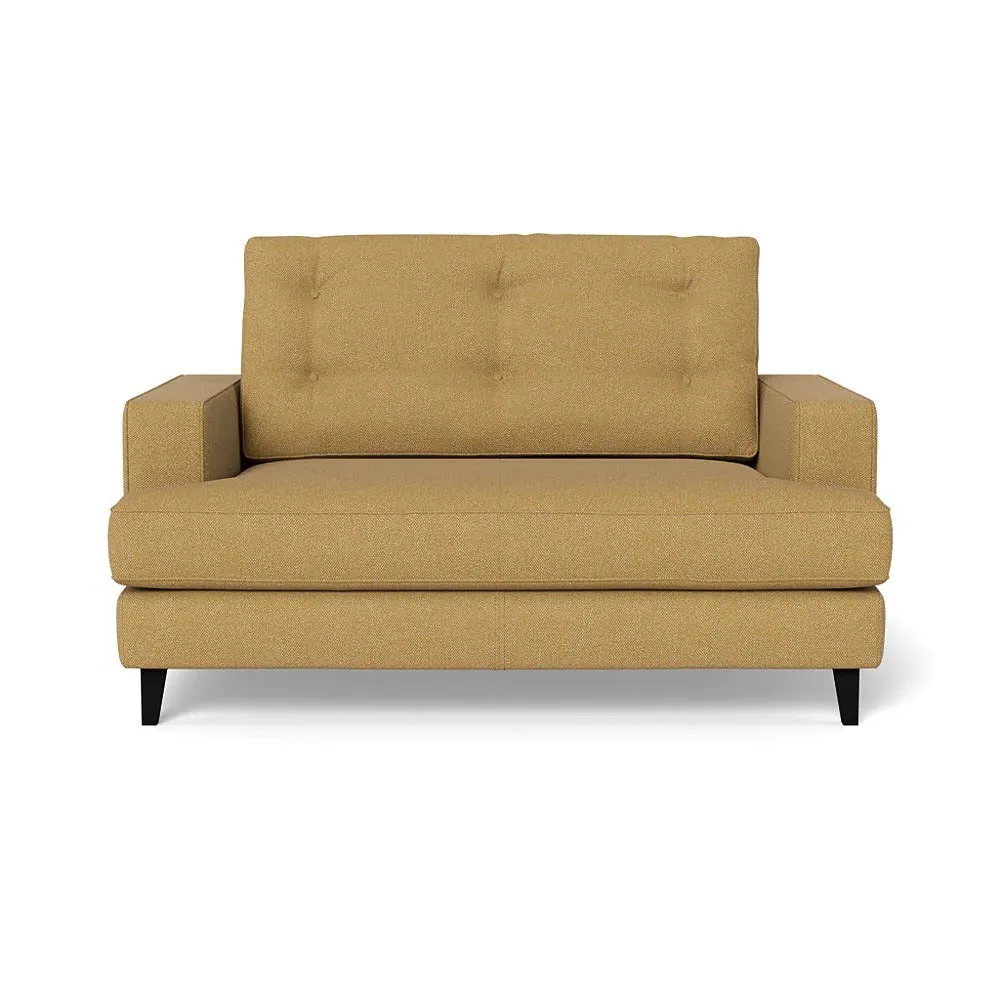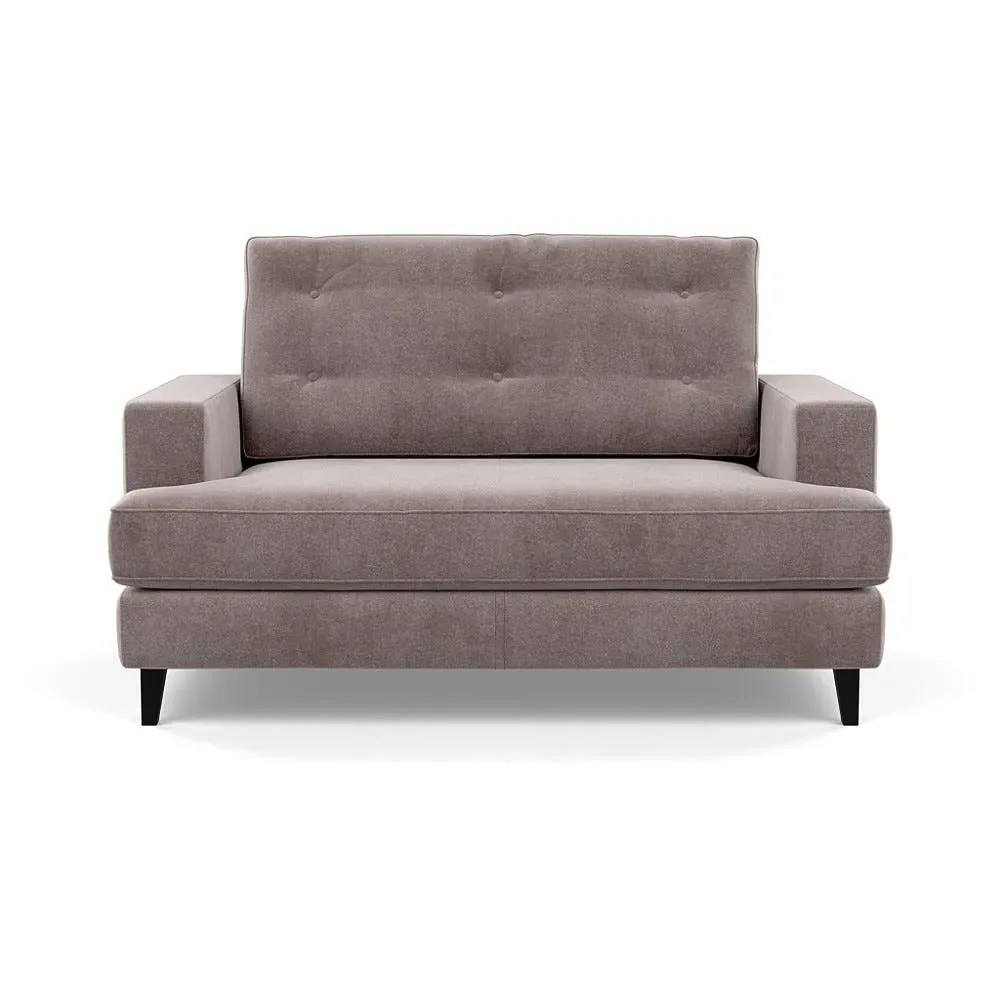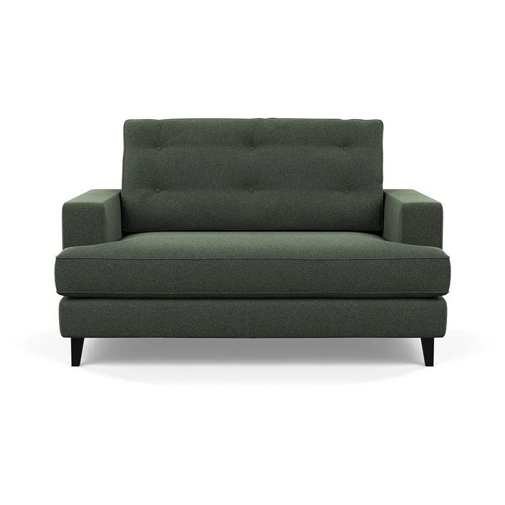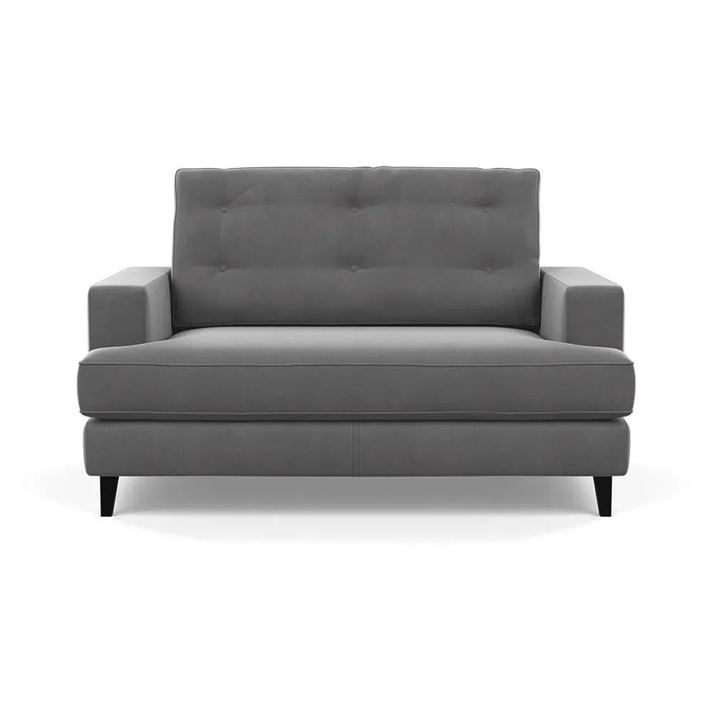 The loveseat combines mid-century design with contemporary comfort, featuring a fully-upholstered frame with matching piping detail. Its supportive padded seat and button-tufted cushion provide lasting comfort, while the bolstered backrest adds extra support. The sturdy birch wood frame offers durability with its webbed seat structure, and the sleek tapered beech wood feet complete the retro-inspired aesthetic.