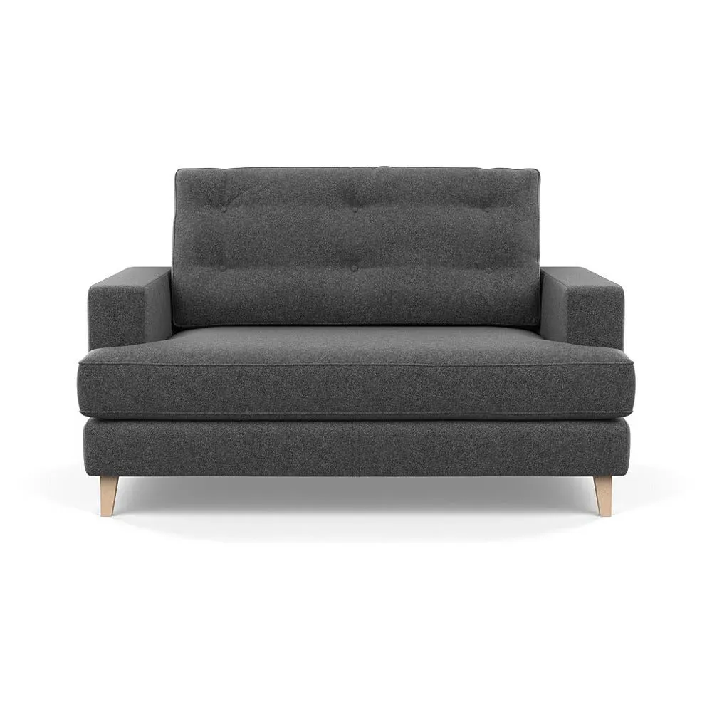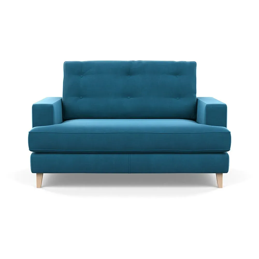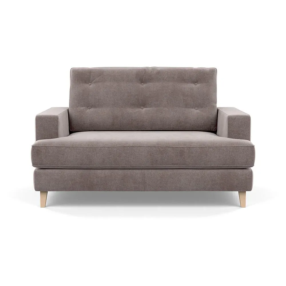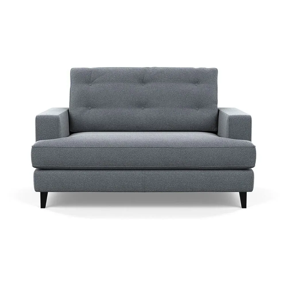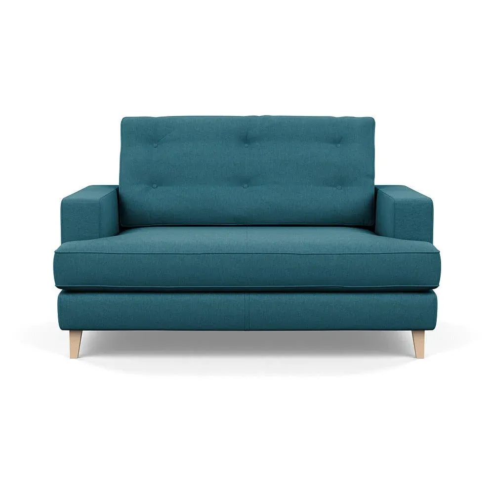 The loveseat combines mid-century design with contemporary comfort, featuring a fully-upholstered frame with matching piping detail. Its supportive padded seat and button-tufted cushion provide lasting comfort, while the bolstered backrest adds extra support. The sturdy birch wood frame offers durability with its webbed seat structure, and the sleek tapered beech wood feet complete the retro-inspired aesthetic.