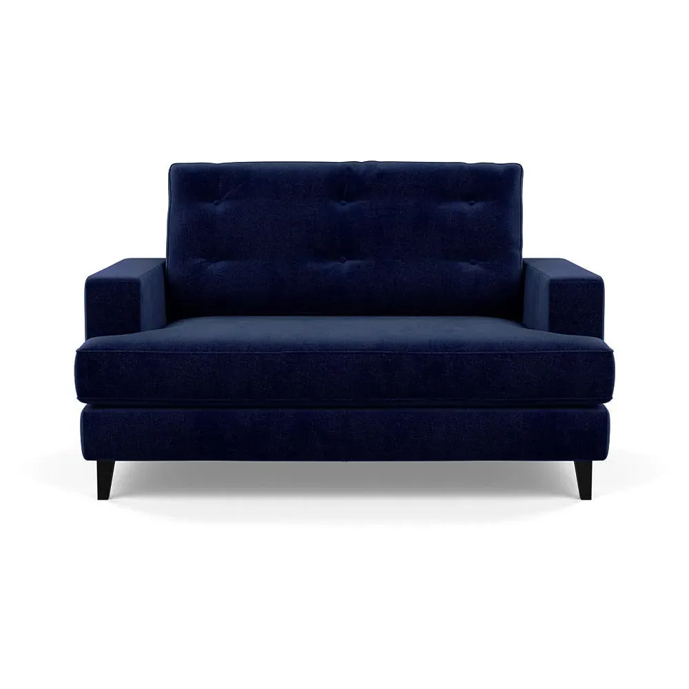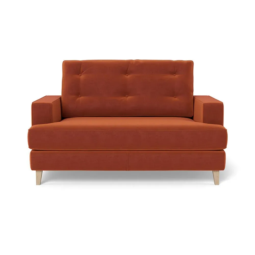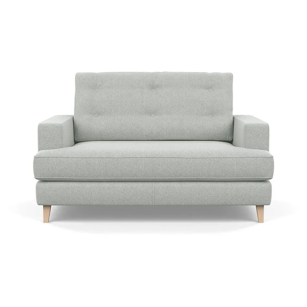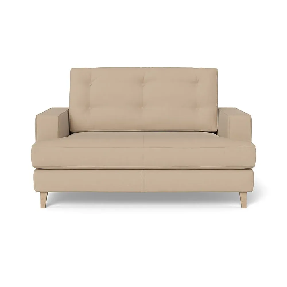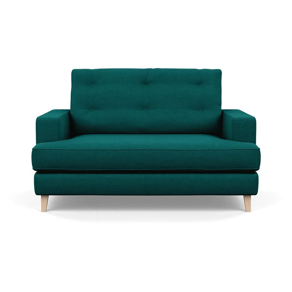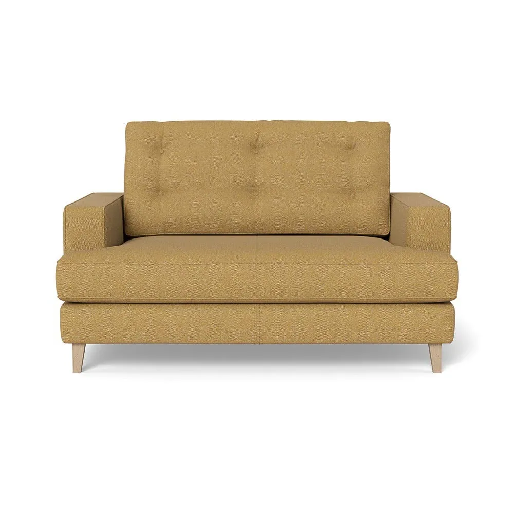 The loveseat combines mid-century design with contemporary comfort, featuring a fully-upholstered frame with matching piping detail. Its supportive padded seat and button-tufted cushion provide lasting comfort, while the bolstered backrest adds extra support. The sturdy birch wood frame offers durability with its webbed seat structure, and the sleek tapered beech wood feet complete the retro-inspired aesthetic.