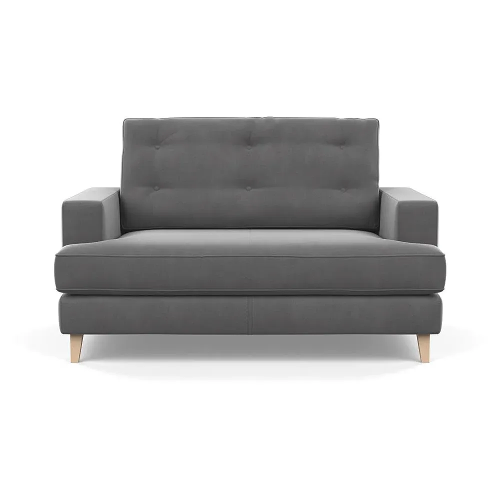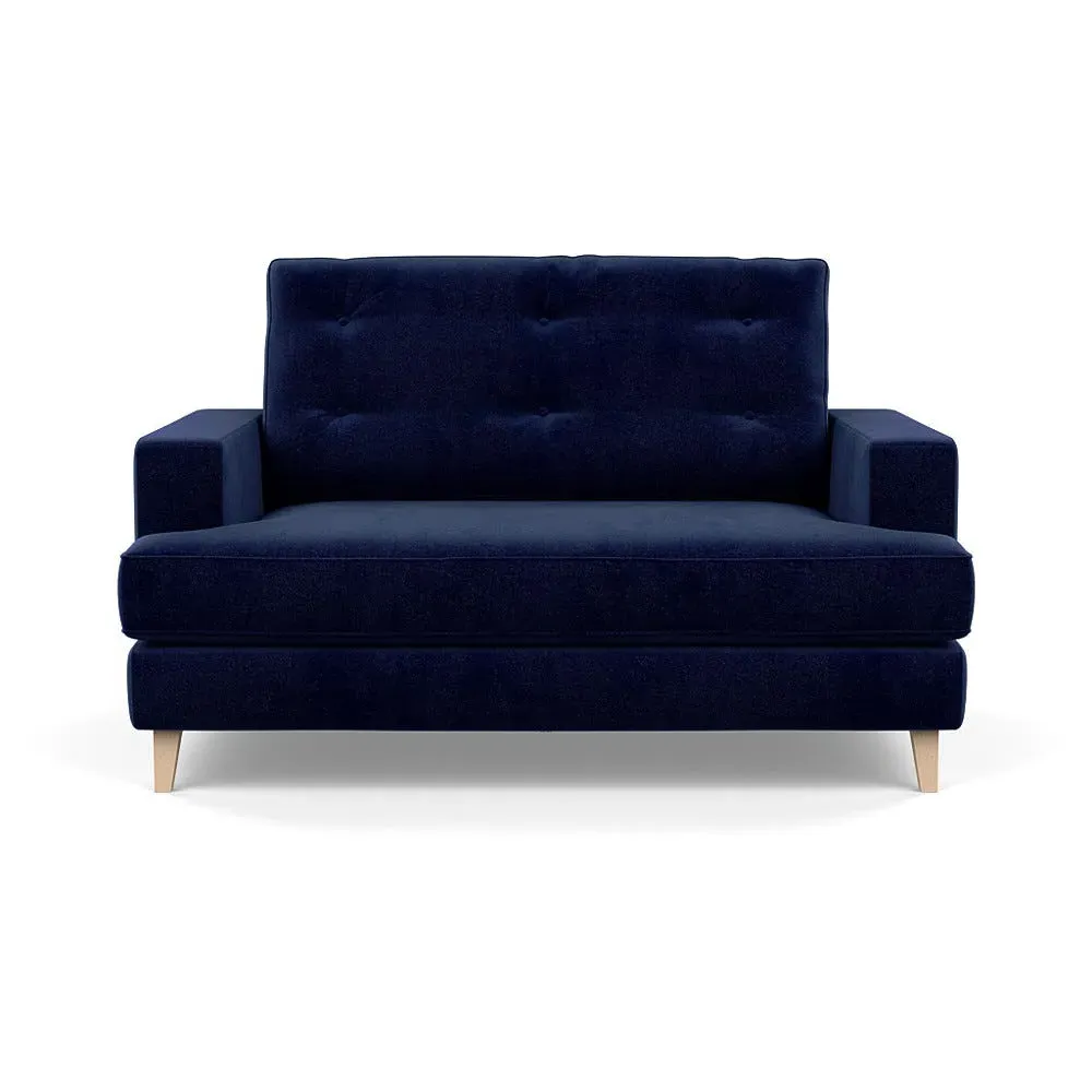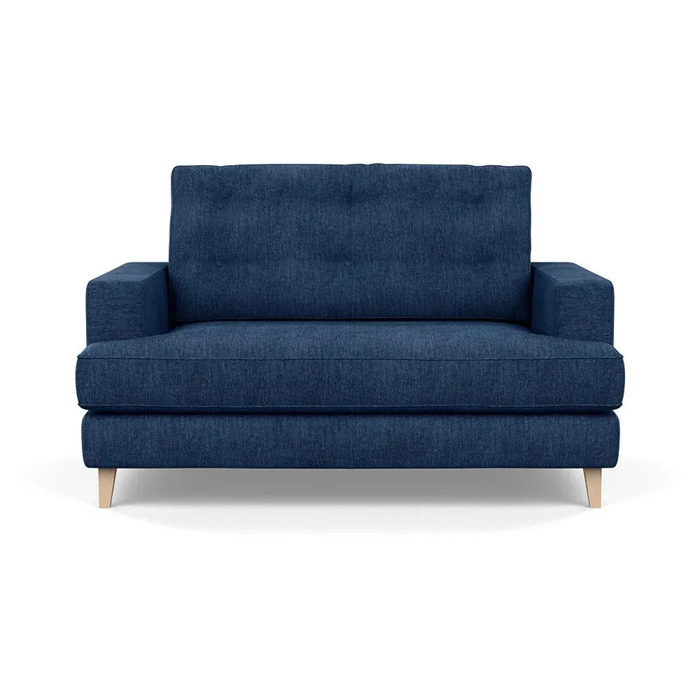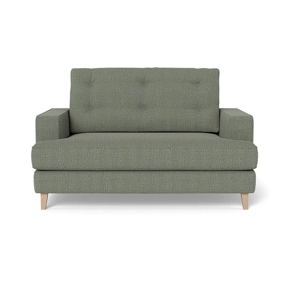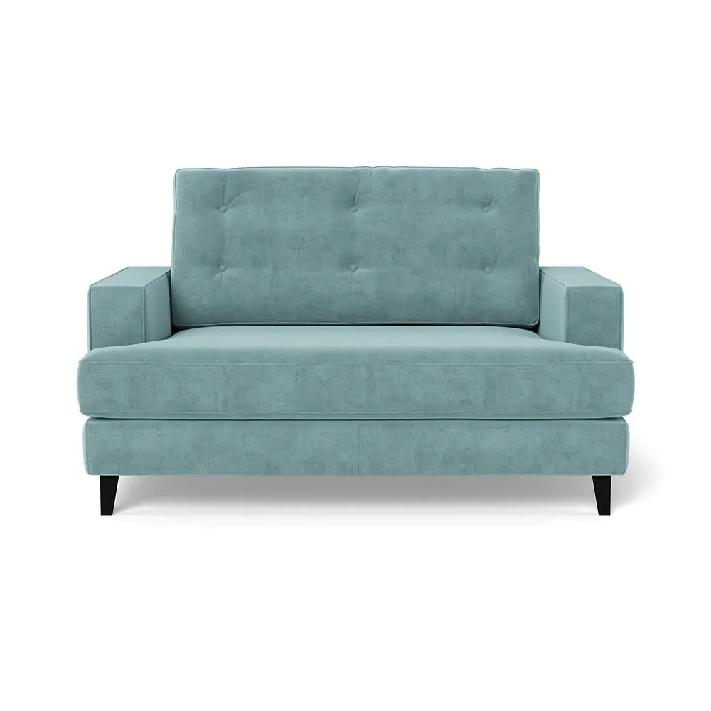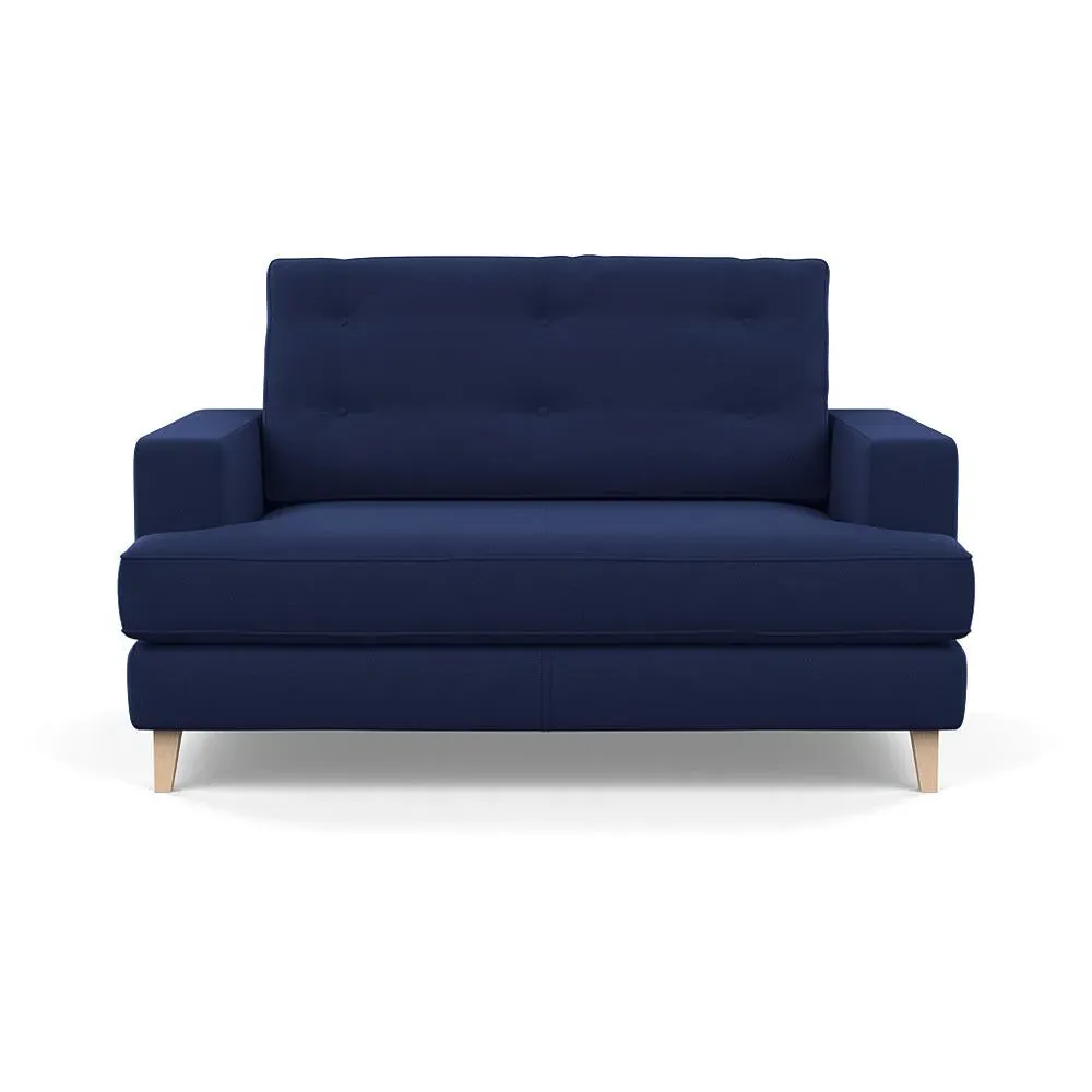 The loveseat combines mid-century design with contemporary comfort, featuring a fully-upholstered frame with matching piping detail. Its supportive padded seat and button-tufted cushion provide lasting comfort, while the bolstered backrest adds extra support. The sturdy birch wood frame offers durability with its webbed seat structure, and the sleek tapered beech wood feet complete the retro-inspired aesthetic.