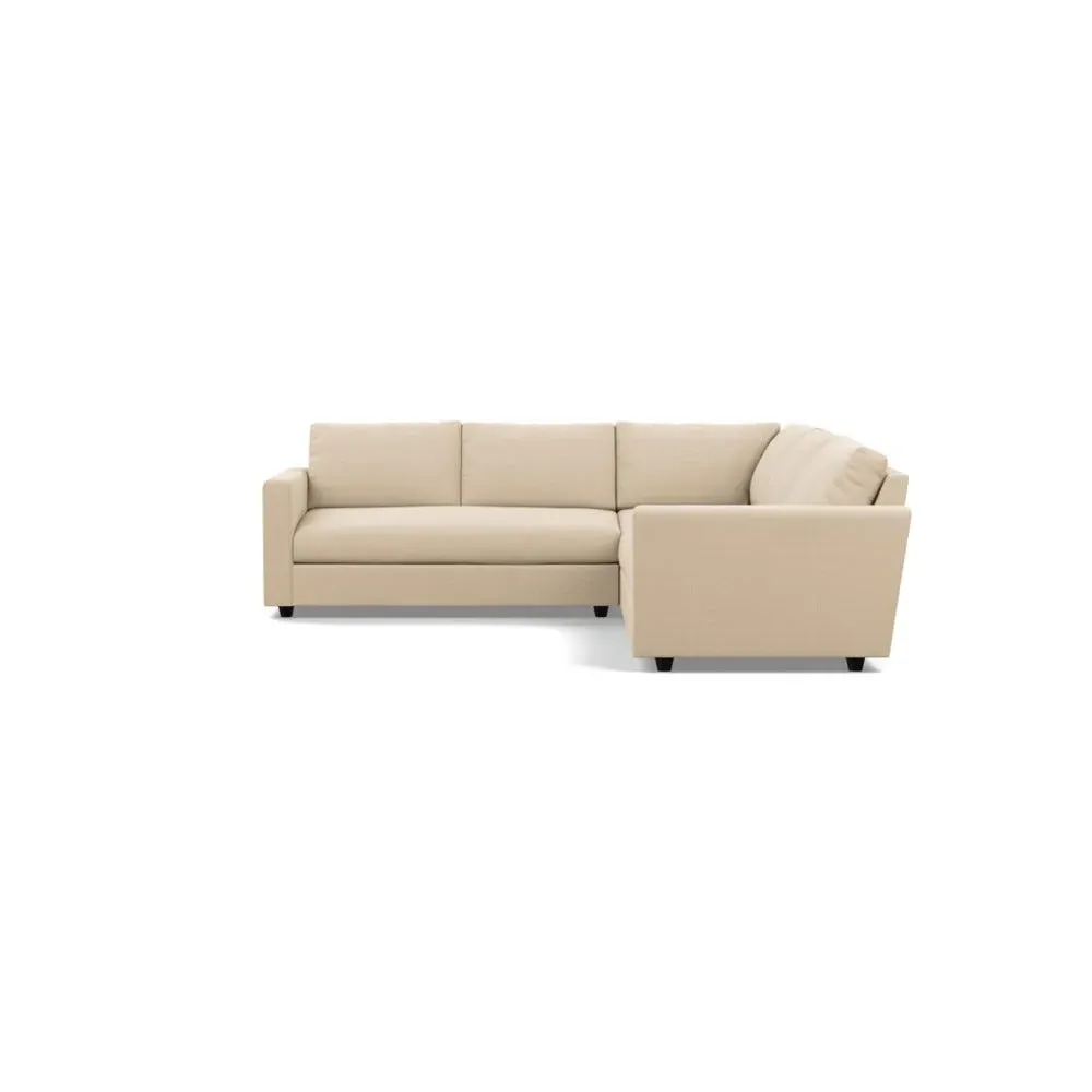 The corner sofa offers generous proportions with its spacious seats and deep, low sit design. Its oversized feather and fibre-foam seat cushions provide exceptional comfort, while the luxuriously soft fibre-filled back cushions add plush support. The sofa features traditional upholstery techniques with handcrafted construction, and the black feet ensure stable foundation.