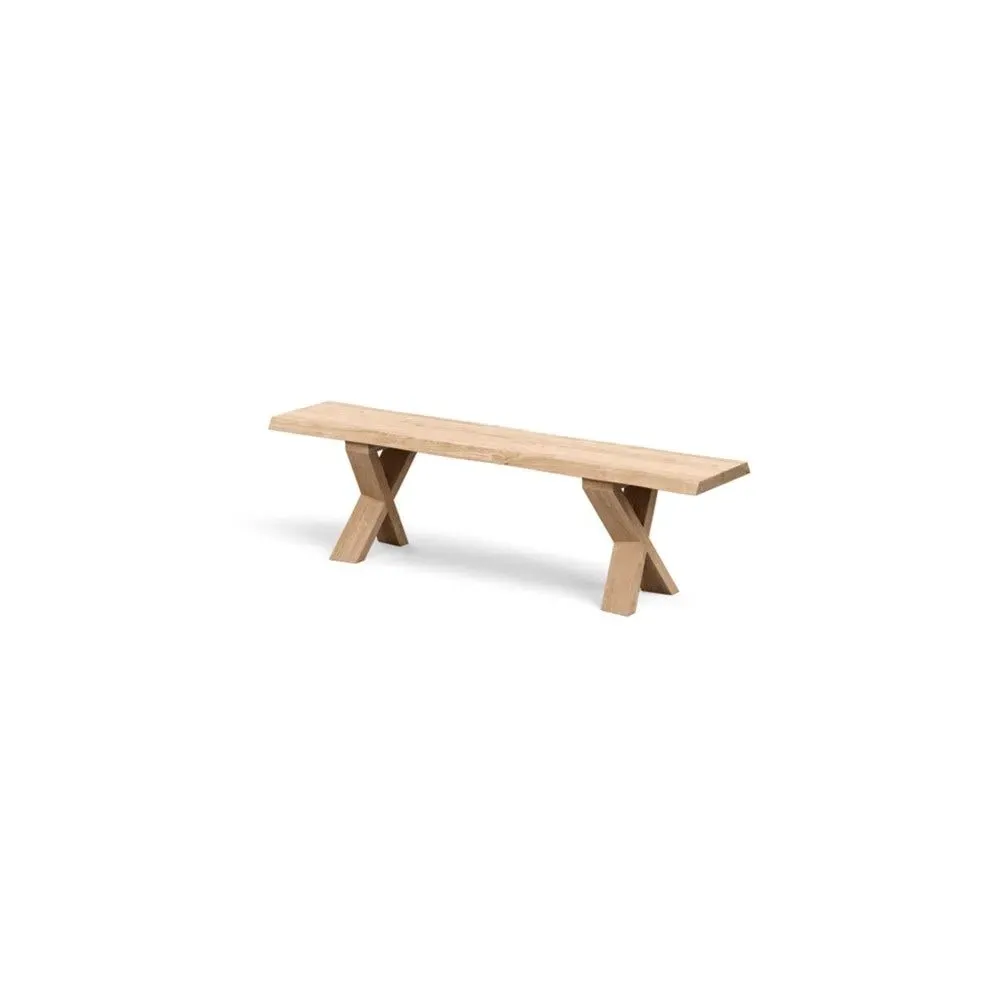 The Oslo Bench features solid oak construction with a natural edge profile and filled grain finish. Its organic edge design provides distinctive character, while the white oak finish adds contemporary appeal. The bench combines durability with visual interest through its natural wood grain and sturdy hardwood frame. Dimensions: W160 x D35 cm.