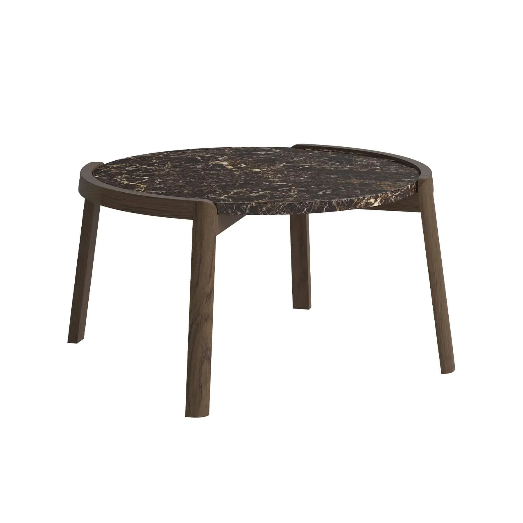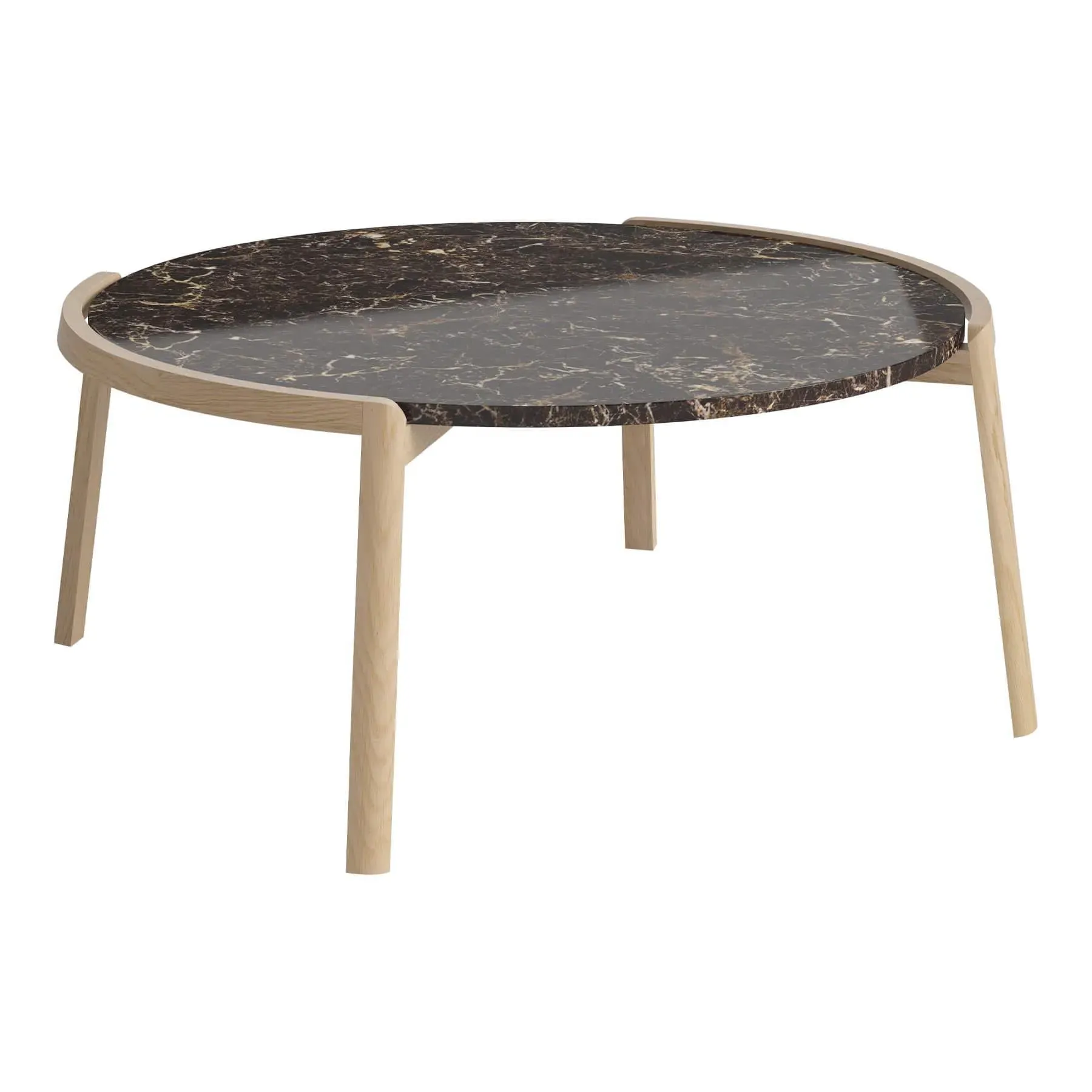 The coffee table features brown marble paired with white oiled oak for distinctive appeal. Its contrasting materials blend traditional craftsmanship with contemporary style, while the marble top offers durability for everyday use. The white oak base provides sturdy support and adds natural texture to the design.
