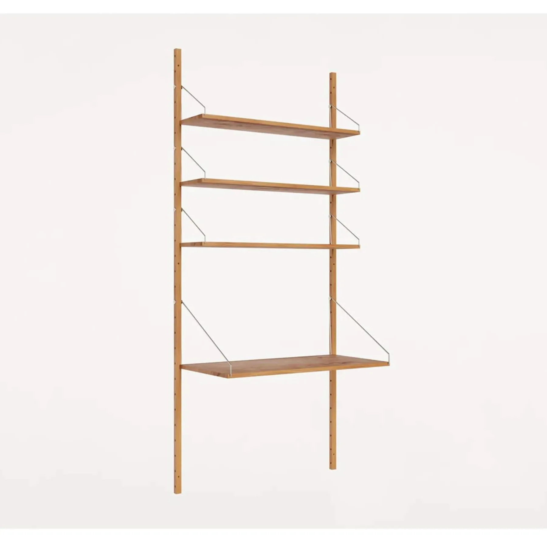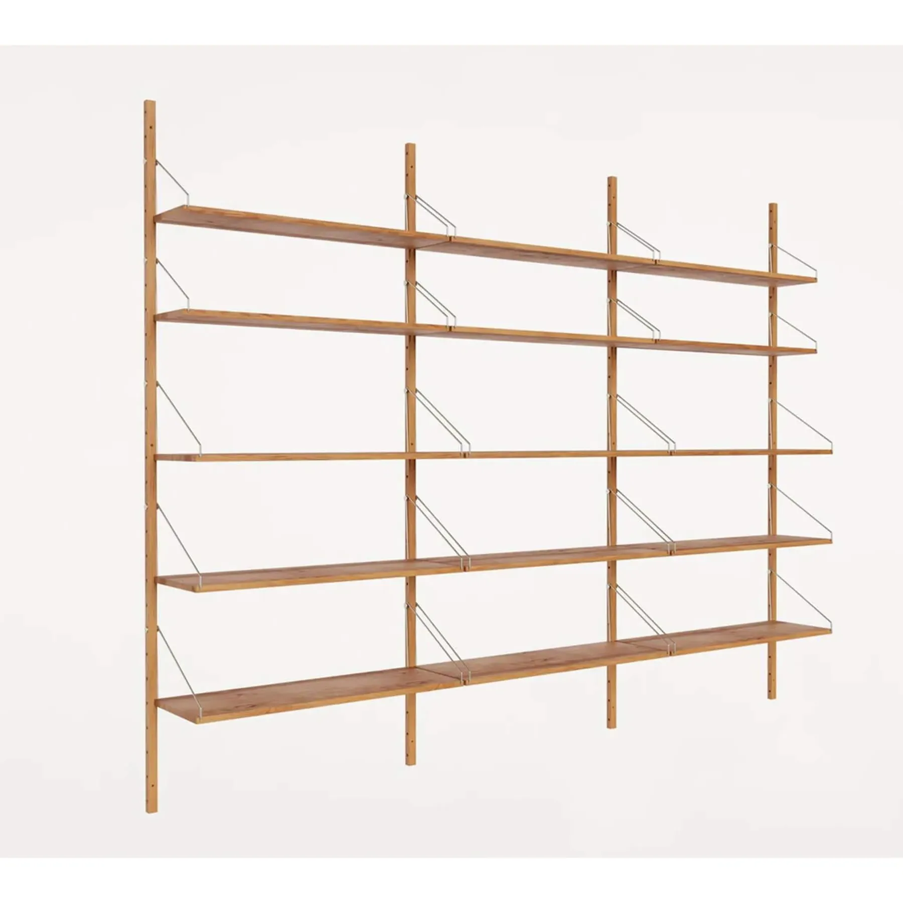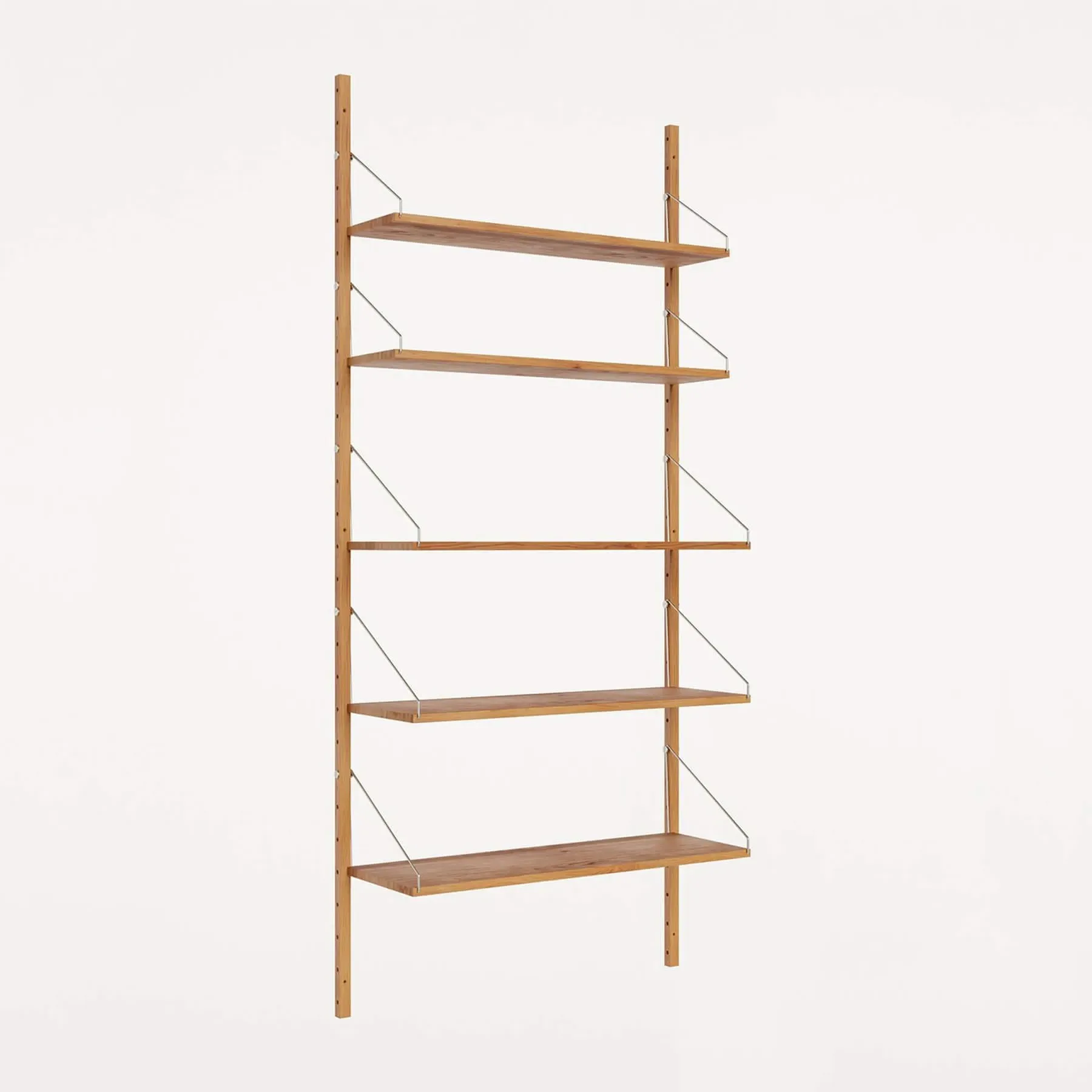 The shelving system offers modular flexibility with its rail-mounted design, featuring four natural oak shelves that provide versatile storage solutions. Its mid-century inspired construction supports up to 15kg per shelf, while the ready-to-mount configuration adapts seamlessly to various spaces. The natural oak finish adds warmth and character, and the thin profile maximizes storage without overwhelming the wall space.