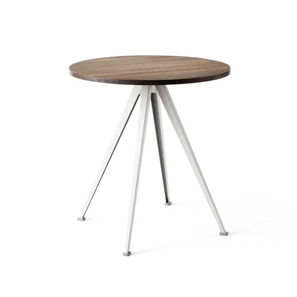 The cafe table combines a clear lacquered oak tabletop with bold sheet-steel legs that slant outwards for a functional expression. Its beige powder-coated steel base provides stability while maintaining an uncluttered aesthetic. The round design suits various settings, and the durable construction ensures long-lasting use.