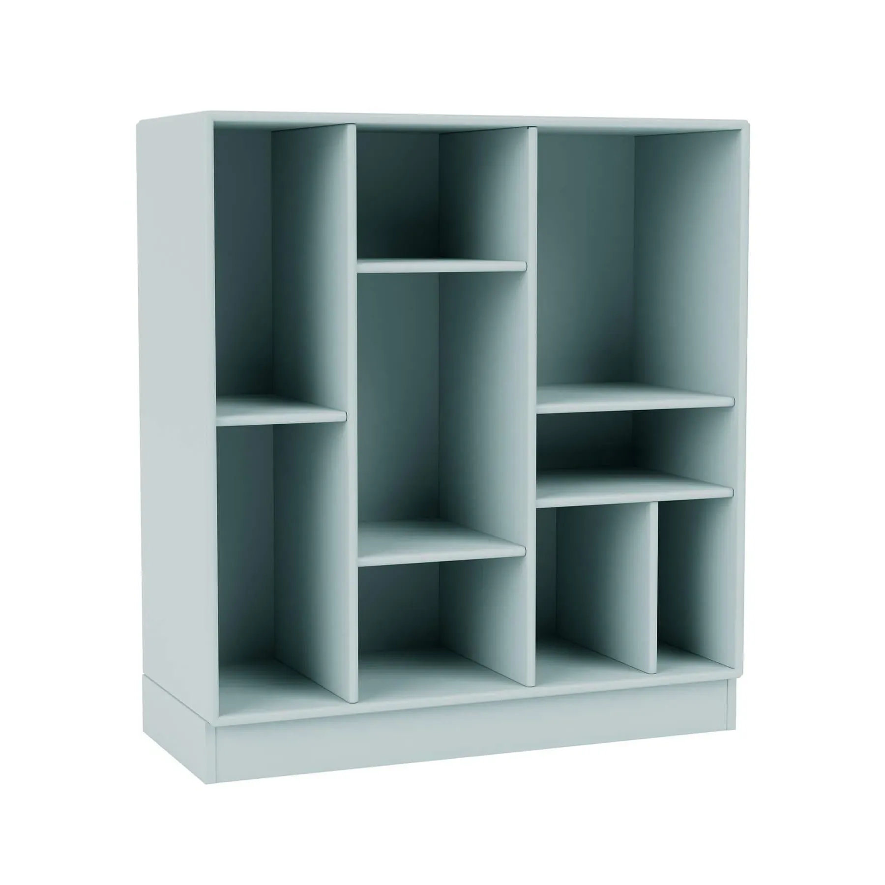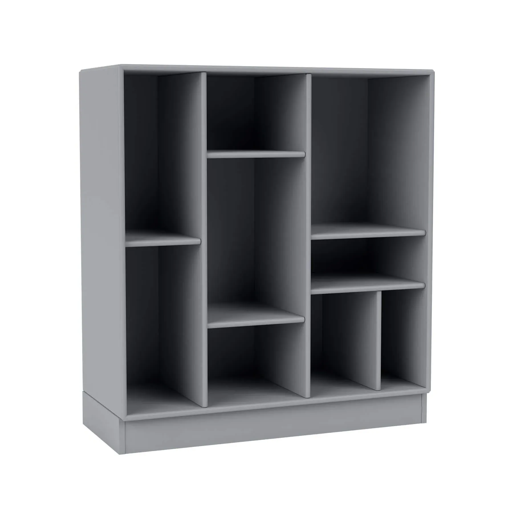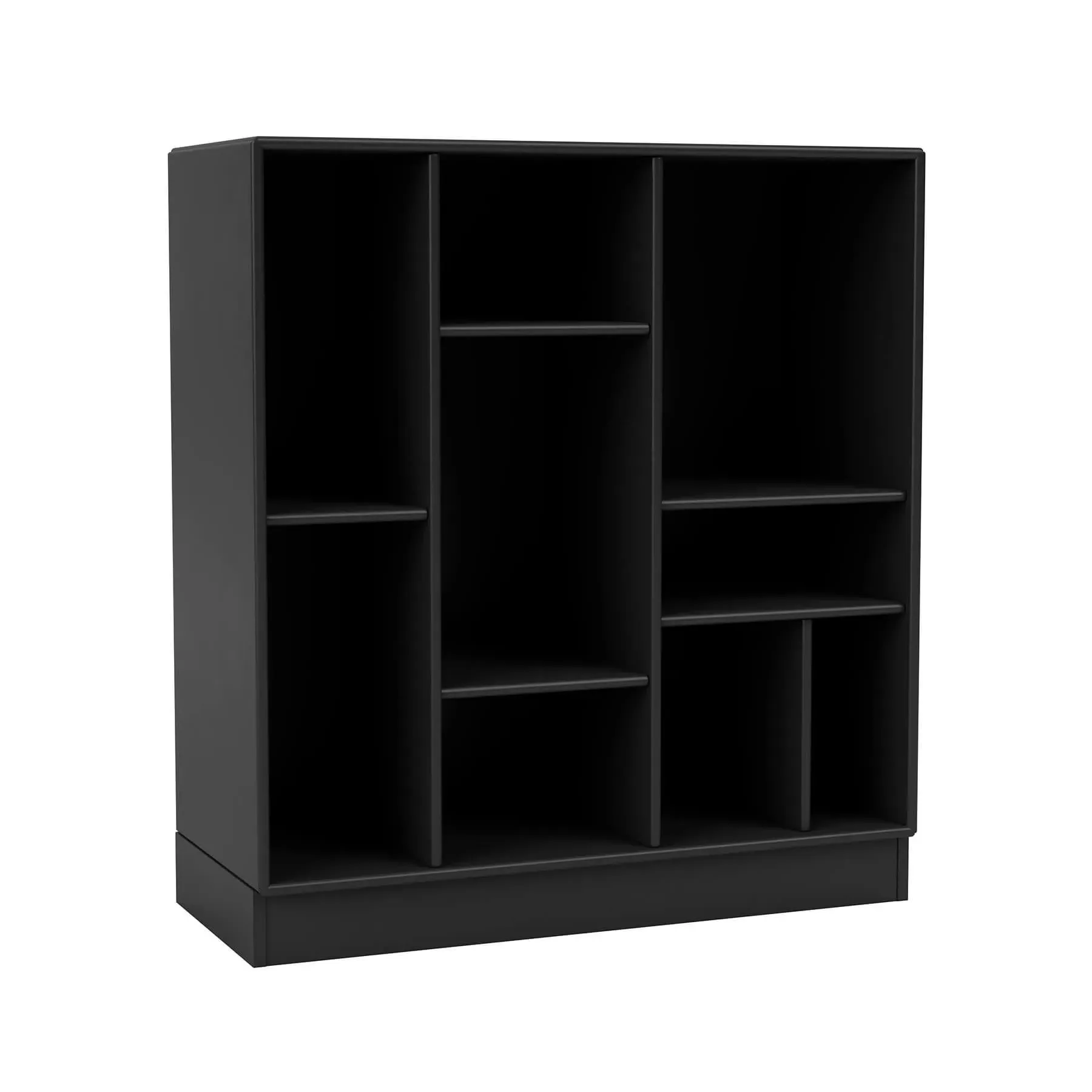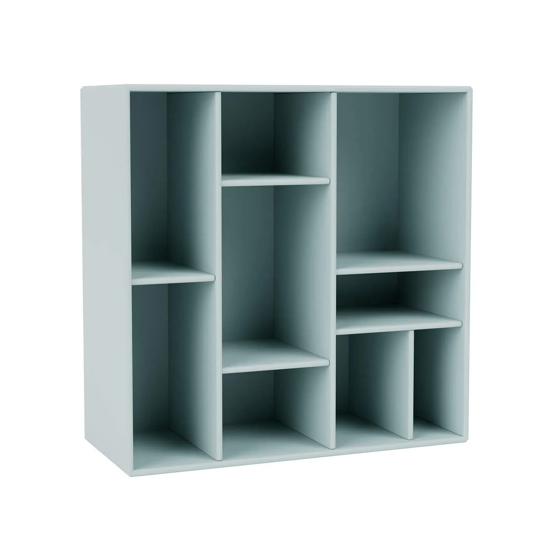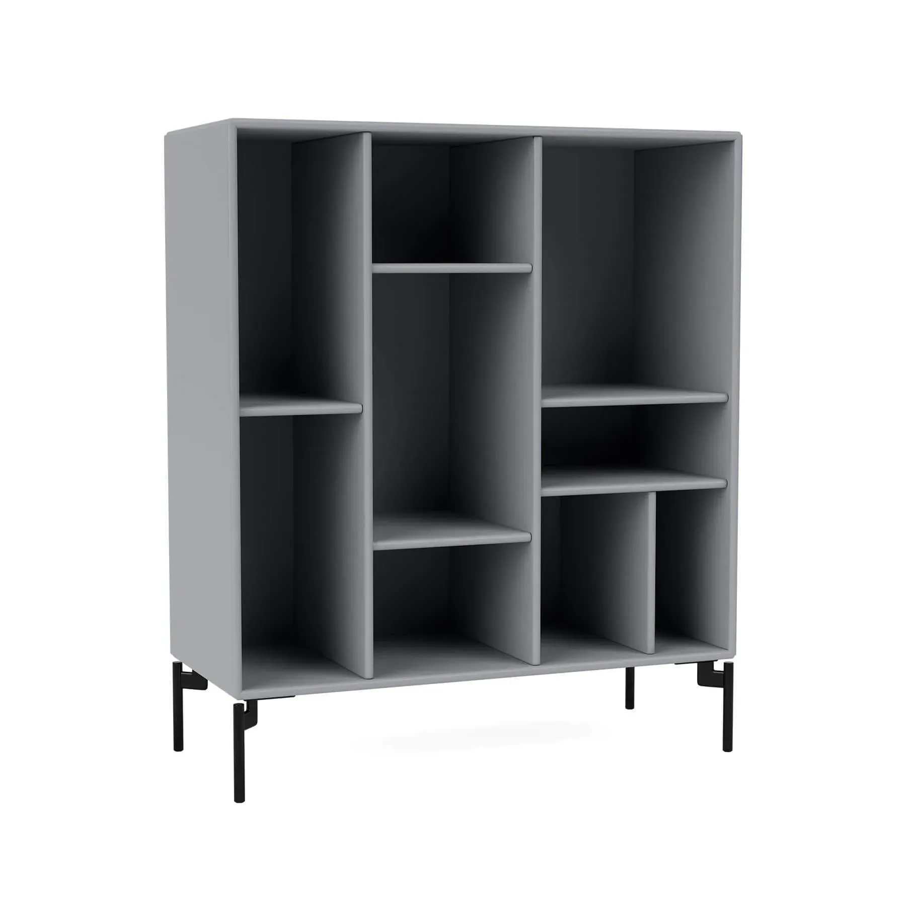 The shelving unit offers versatile storage with its modular compartment design, featuring wall-mounted rails for space-saving installation. Its varying compartments provide flexible display options for books and belongings, while the customizable configuration adapts to different spaces. The unit accommodates multiple mounting options including legs, wall rails, or plinth base, and the graphic finish adds contemporary style to any interior.