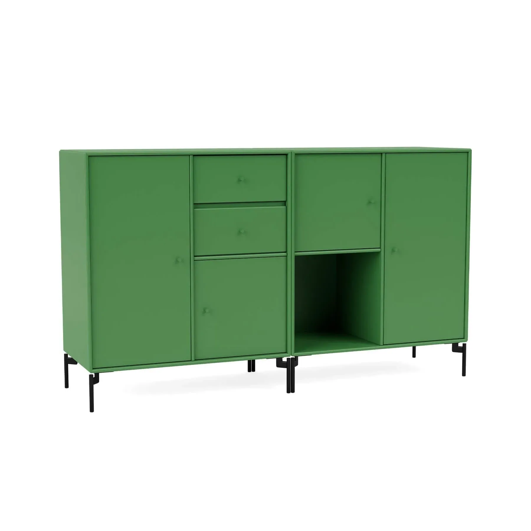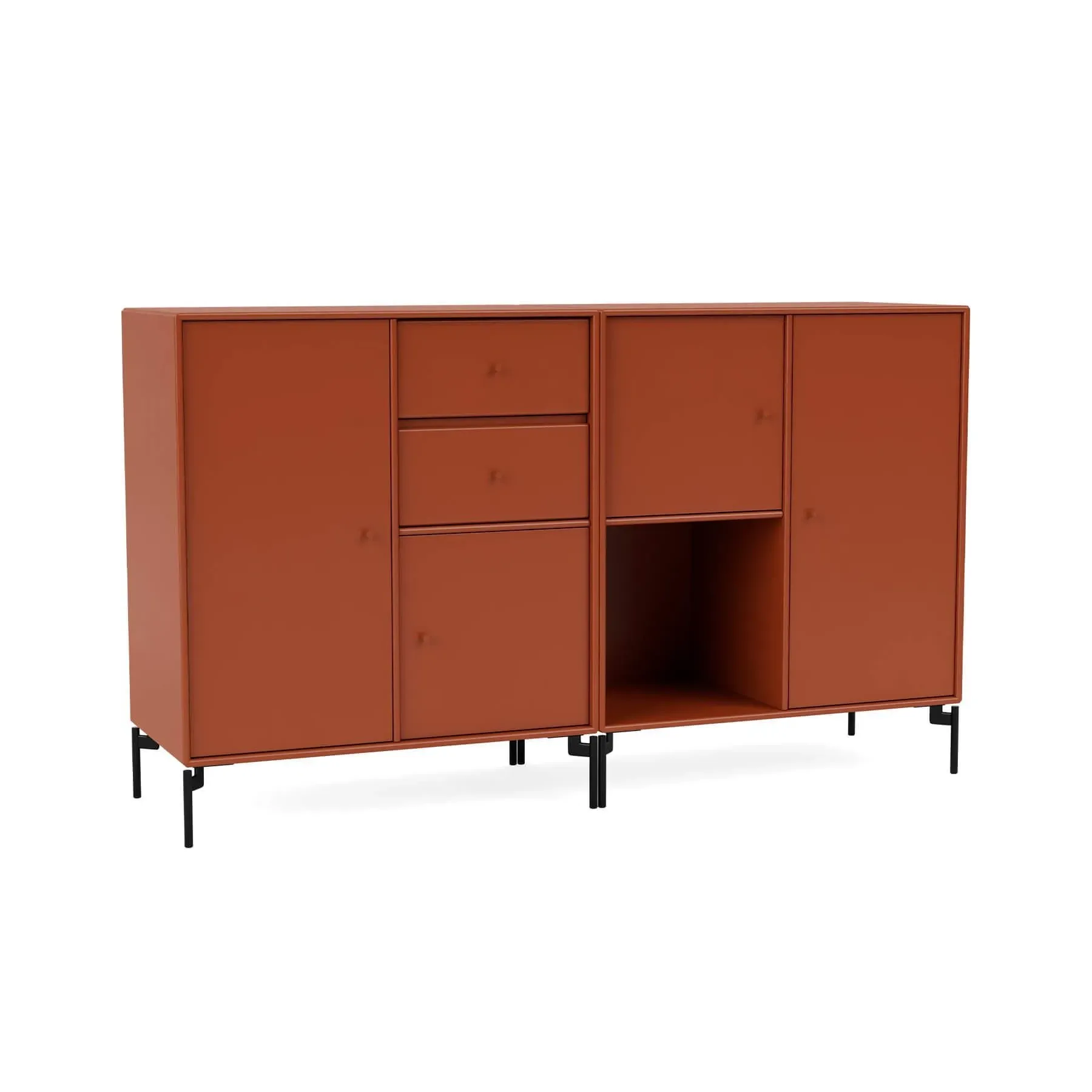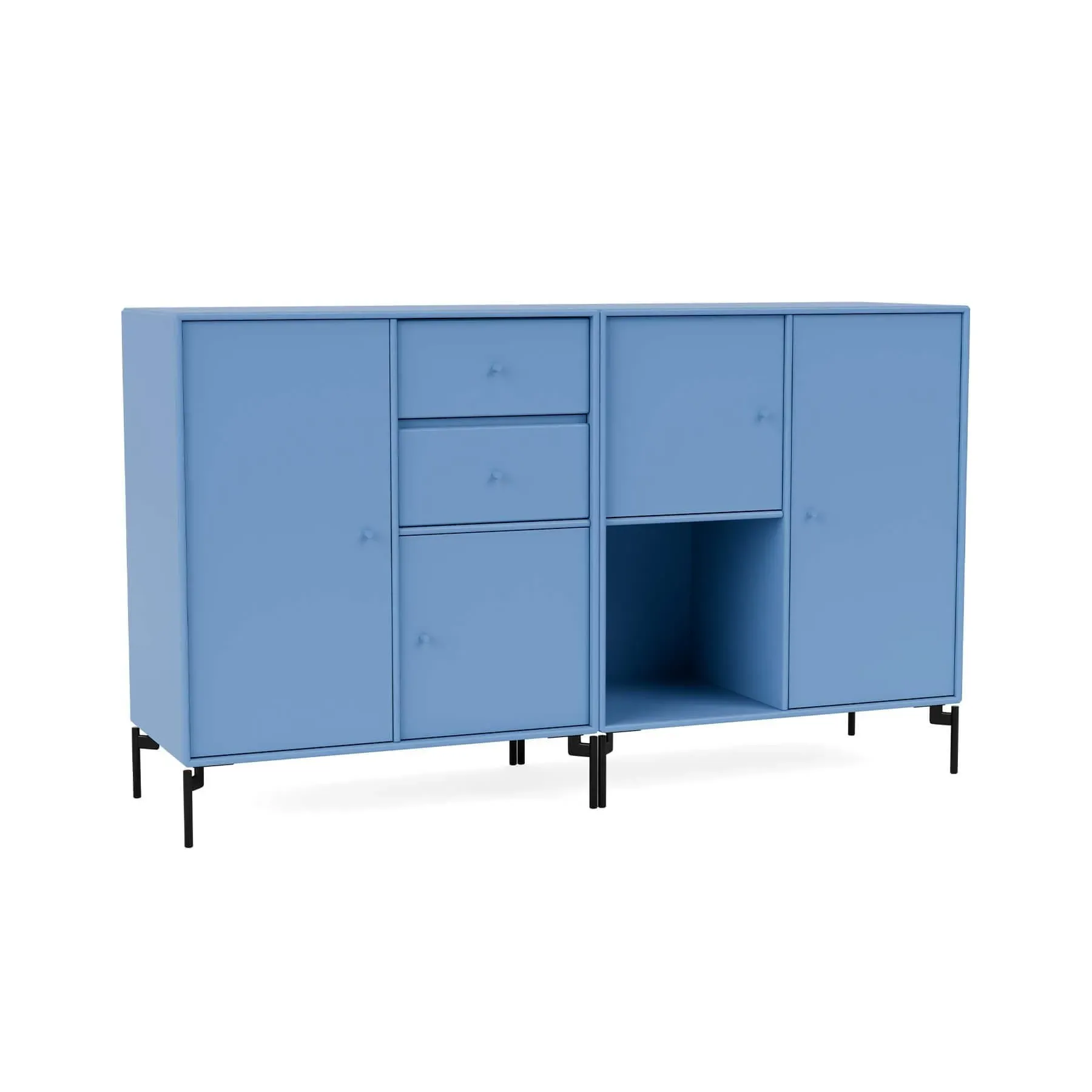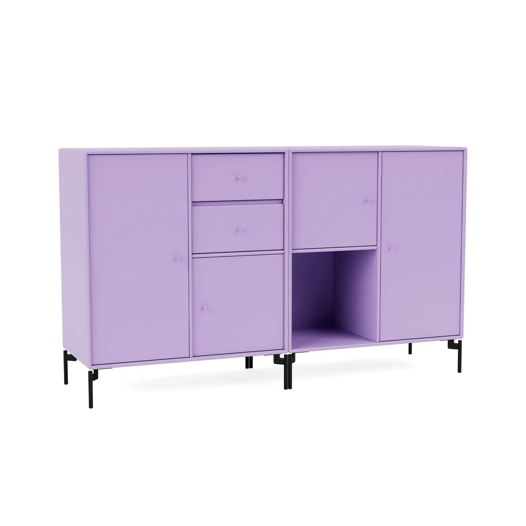 Immerse your living space in contemporary allure with the Montana Couple Sideboard, a modern design that seamlessly balances storage and display in the living room, hallway, or kitchen. Boasting a spacious layout comprising two drawers, an open shelf, and various cabinets of varying sizes, the Couple Sideboard offers a creative storage solution that caters to your every need. Crafted for both style and functionality, Couple comes with the option of legs, suspension rails for wall mounting or a plinth, providing versatility in its placement. Elevate your home with this desirable sideboard, where each drawer and cabinet becomes a canvas for organisation, transforming your space into a captivating blend of practicality and modern design.