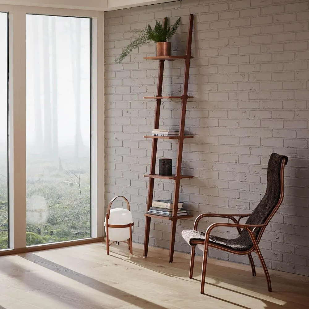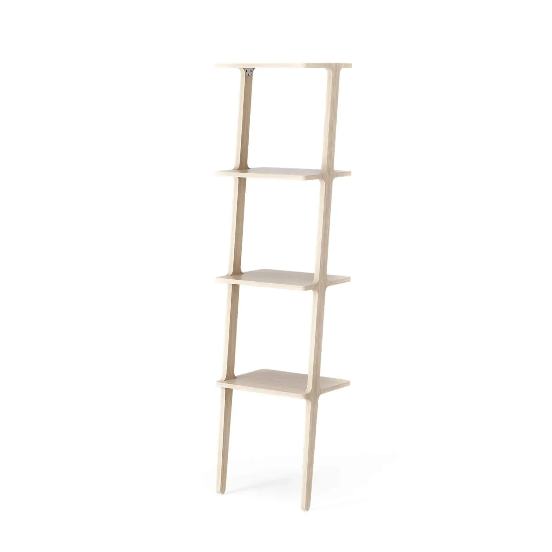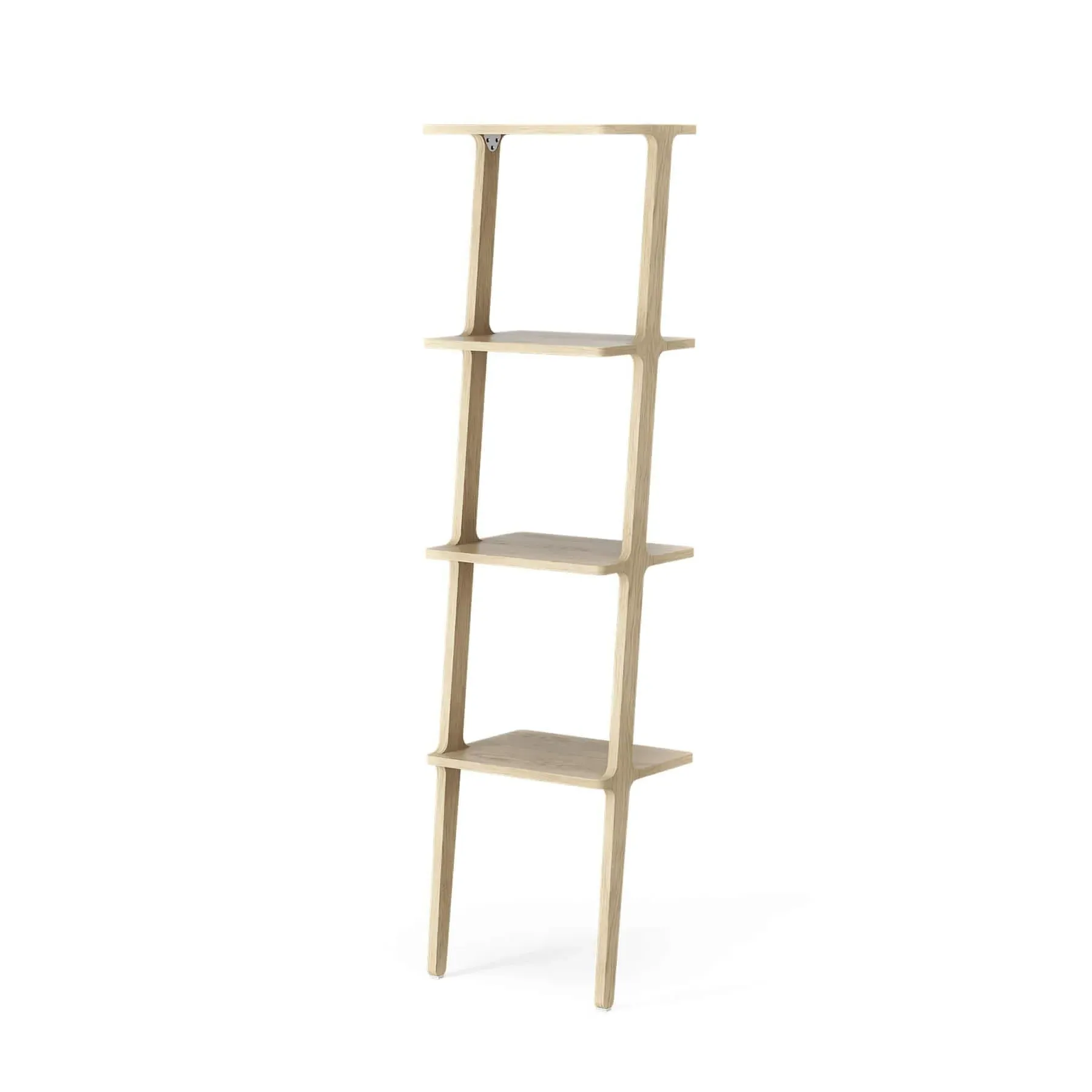 The leaning bookshelf offers versatile storage with its innovative wall-leaning design that requires no mounting. Its adjustable legs allow customisation of height and angle, while the modular construction enables side-by-side placement or back-to-back positioning as freestanding units. The ash wood construction provides durability and natural beauty, and the included fixings allow for secure wall attachment when desired. The four-shelf configuration accommodates books, decor, and essentials with stable support.