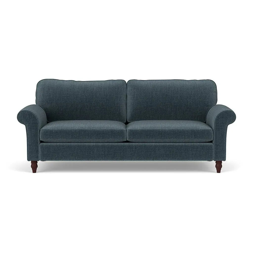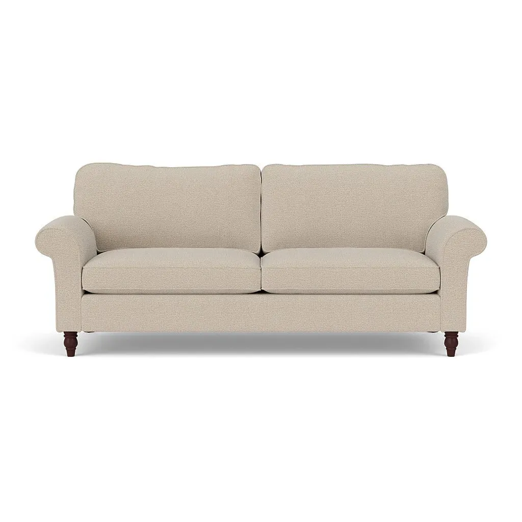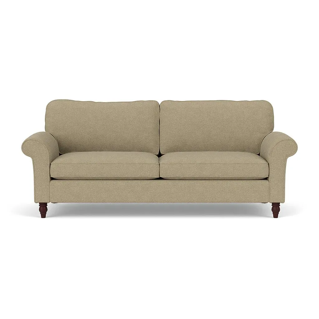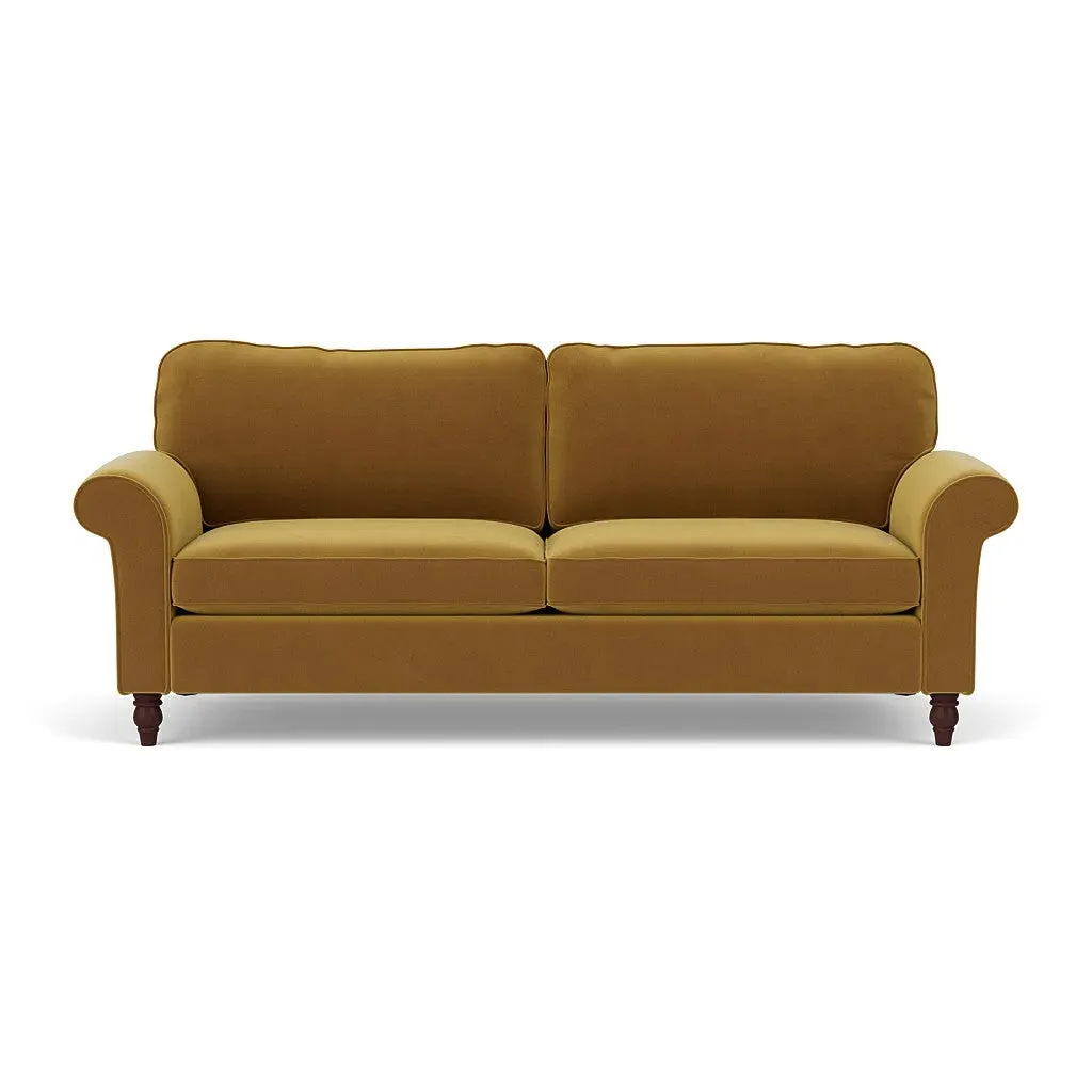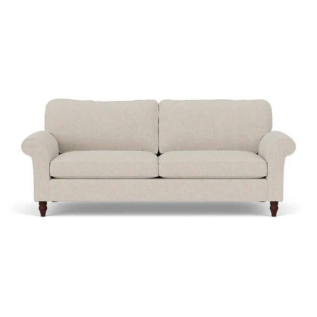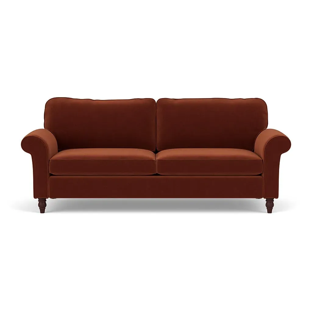 The sofa offers comforting support with its tall, scrolled arms and deep seat cushions. Its beautifully turned feet add character, while the generous seating provides ample space for relaxation. The design features both luxurious feather and low maintenance interior options to suit different preferences.