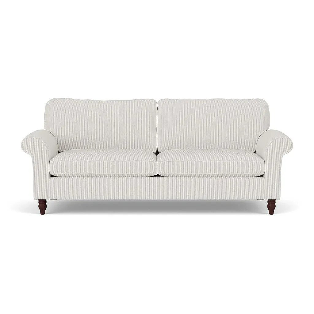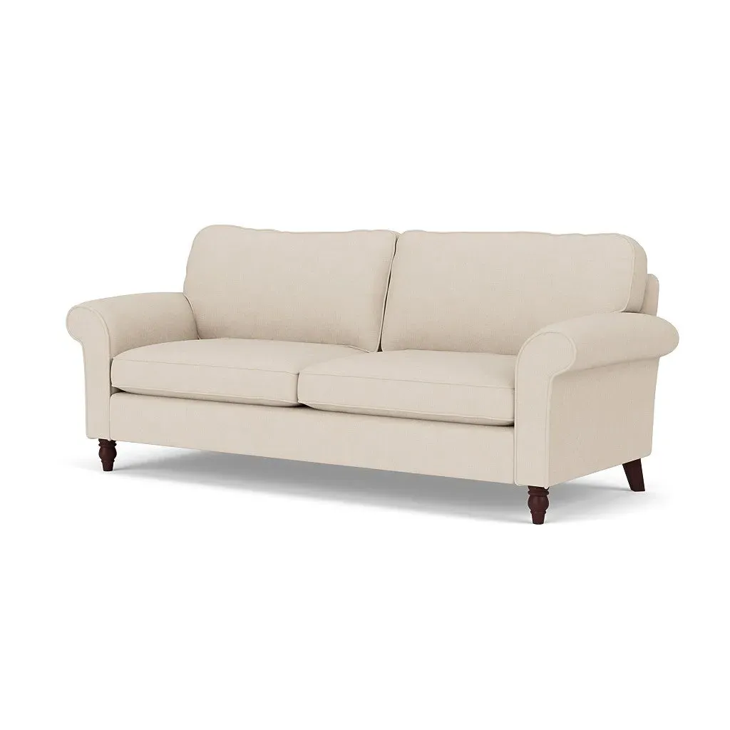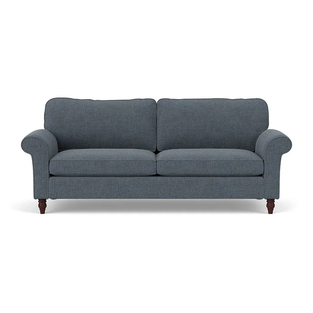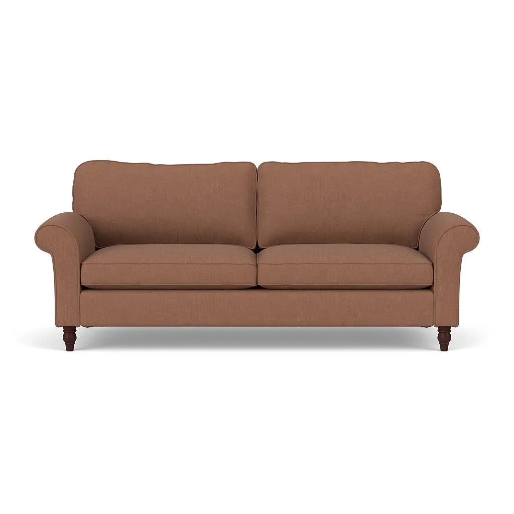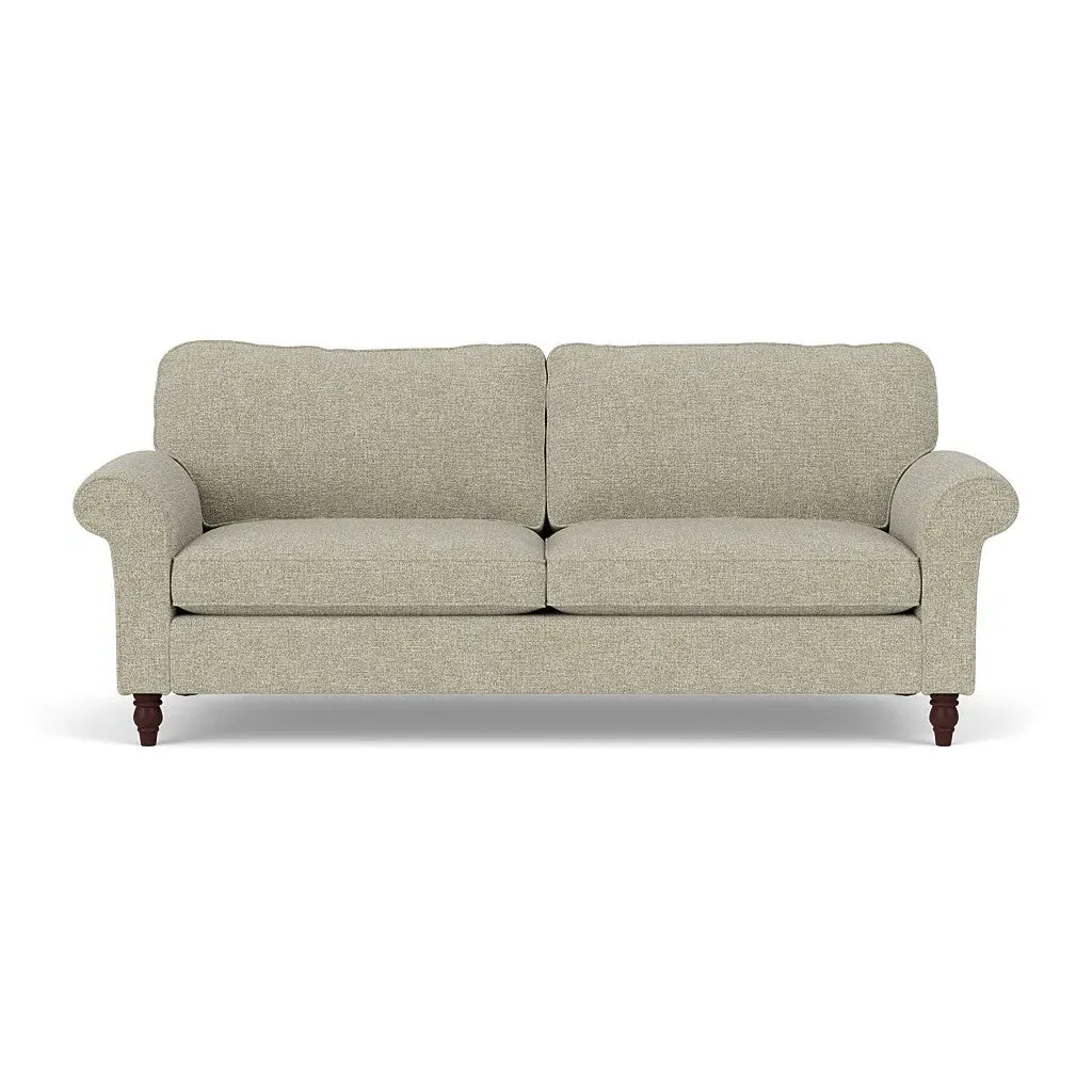 The sofa offers comforting support with its tall, scrolled arms and deep seat cushions. Its beautifully turned feet add character, while the generous seating provides ample space for relaxation. The design features both luxurious feather and low maintenance interior options to suit different preferences.