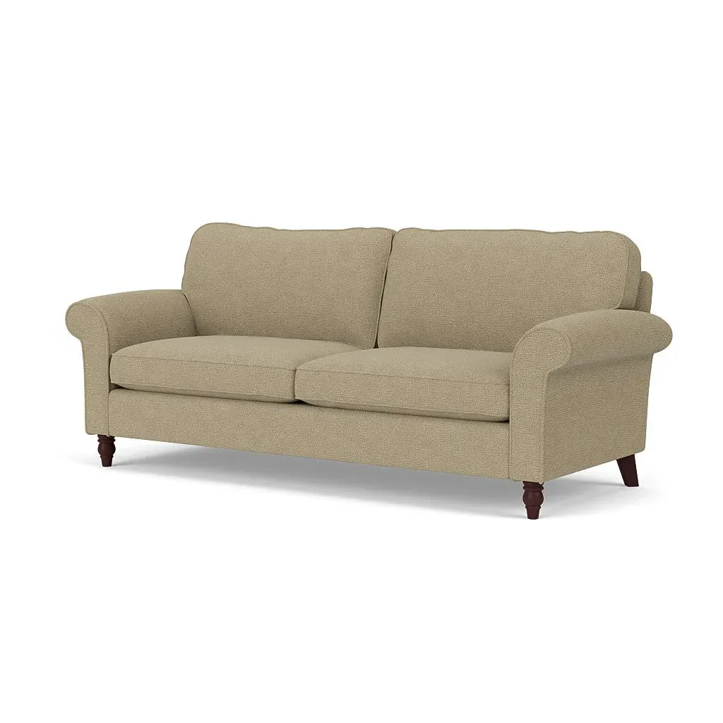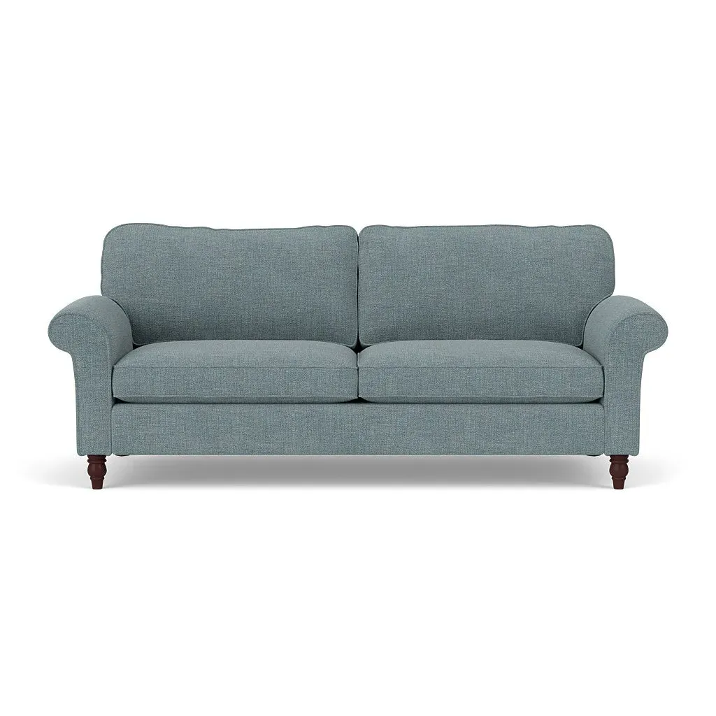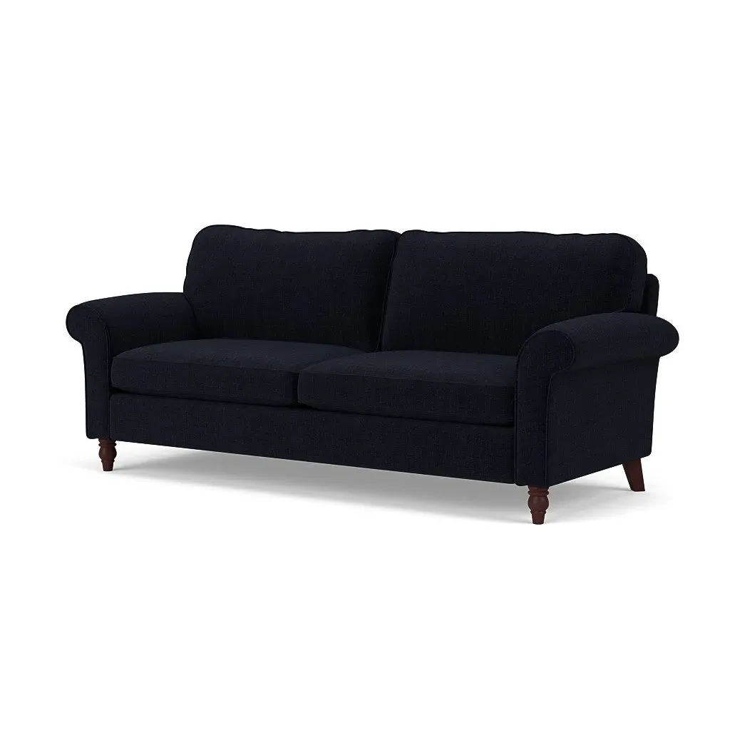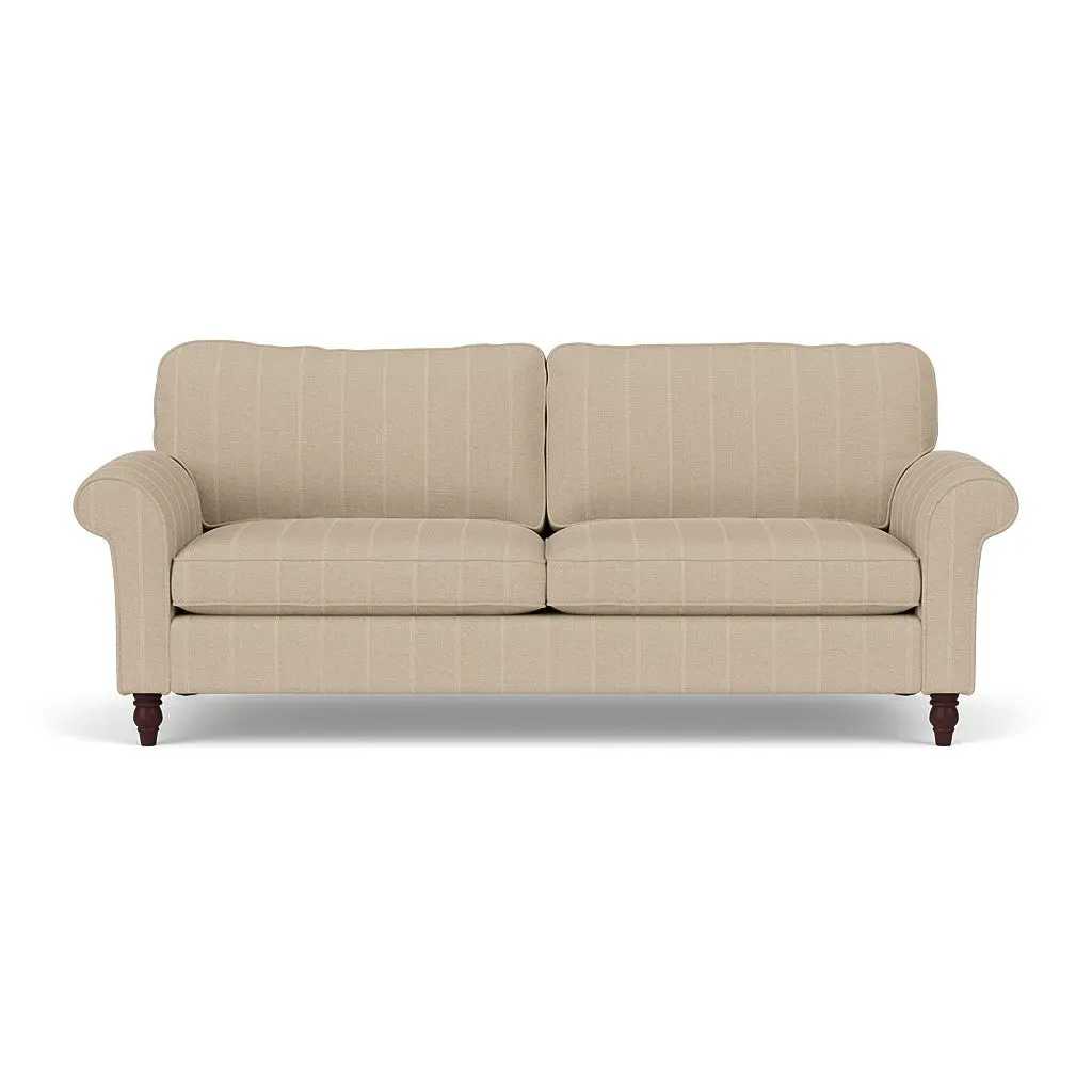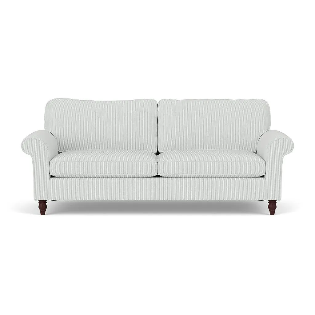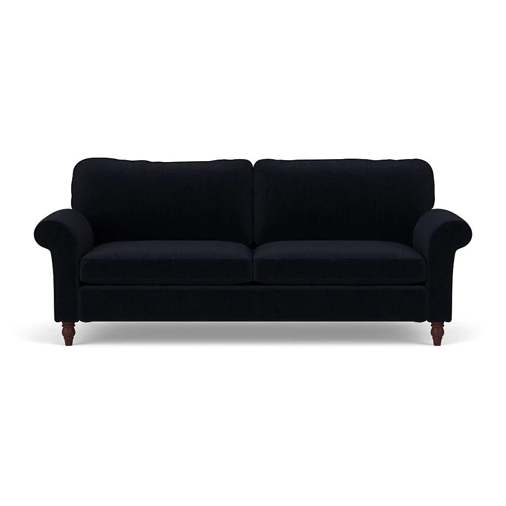 The sofa offers comforting support with its tall, scrolled arms and deep seat cushions. Its beautifully turned feet add character, while the generous seating provides ample space for relaxation. The design features both luxurious feather and low maintenance interior options to suit different preferences.