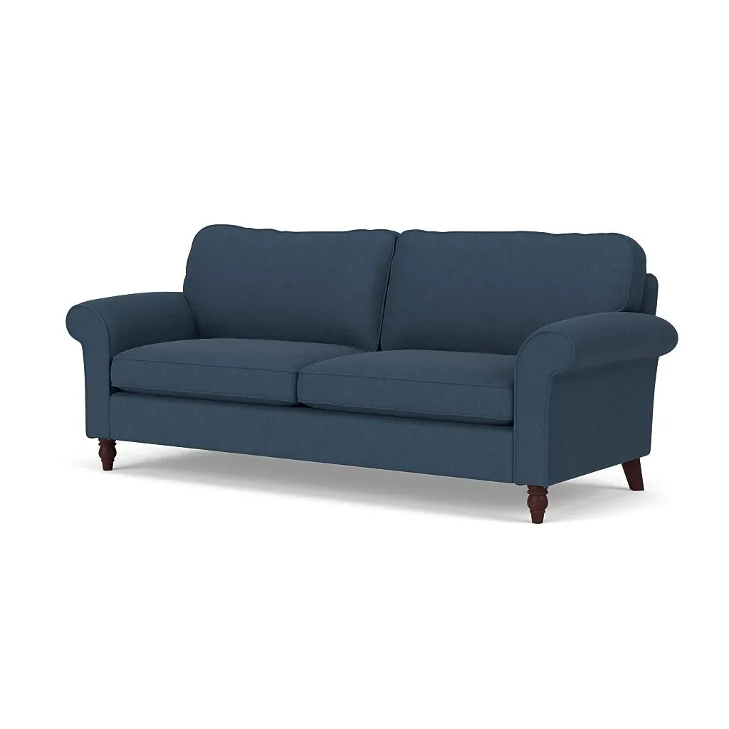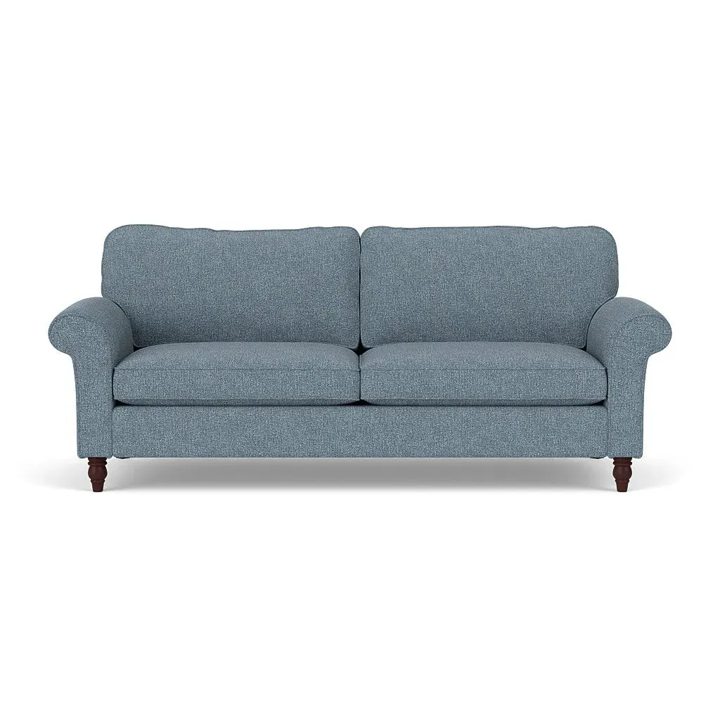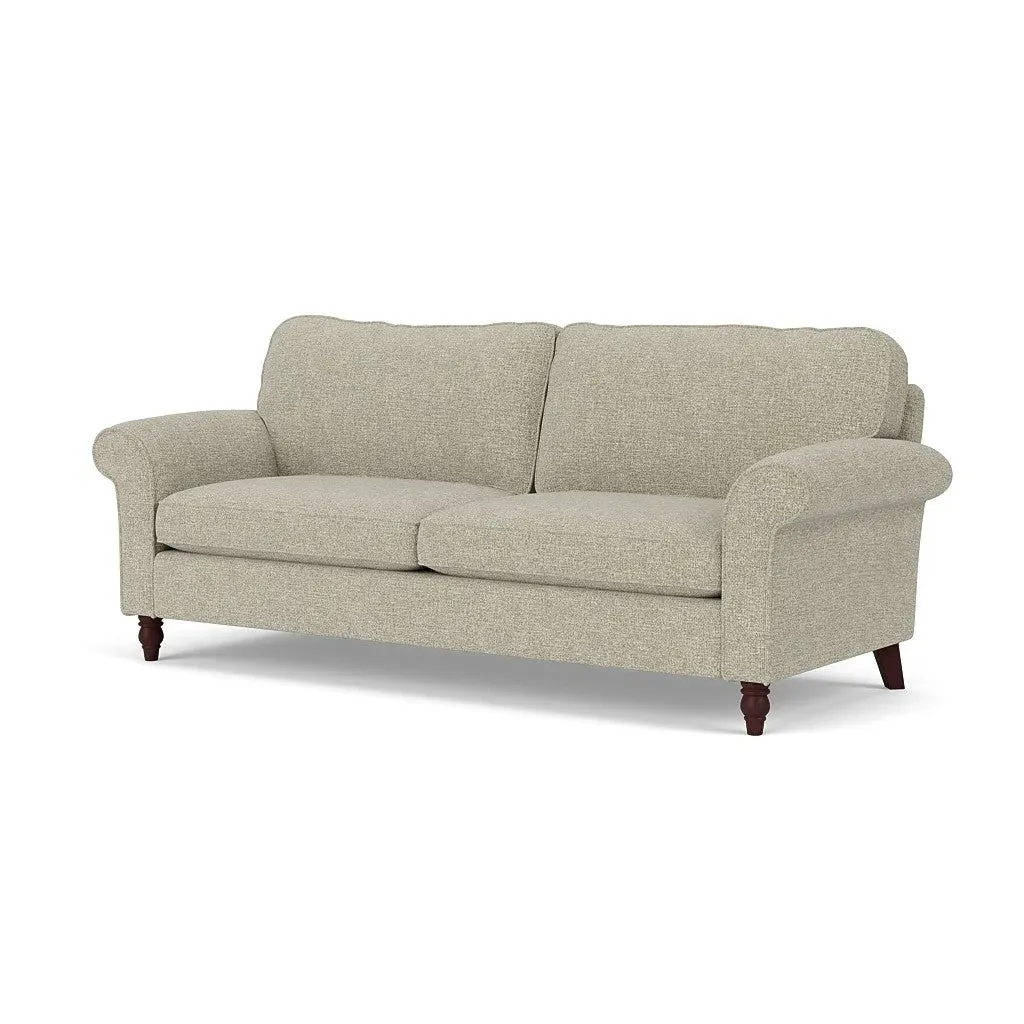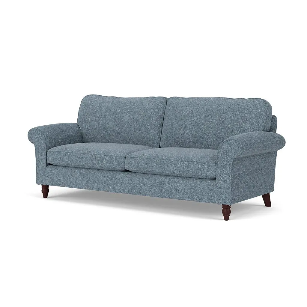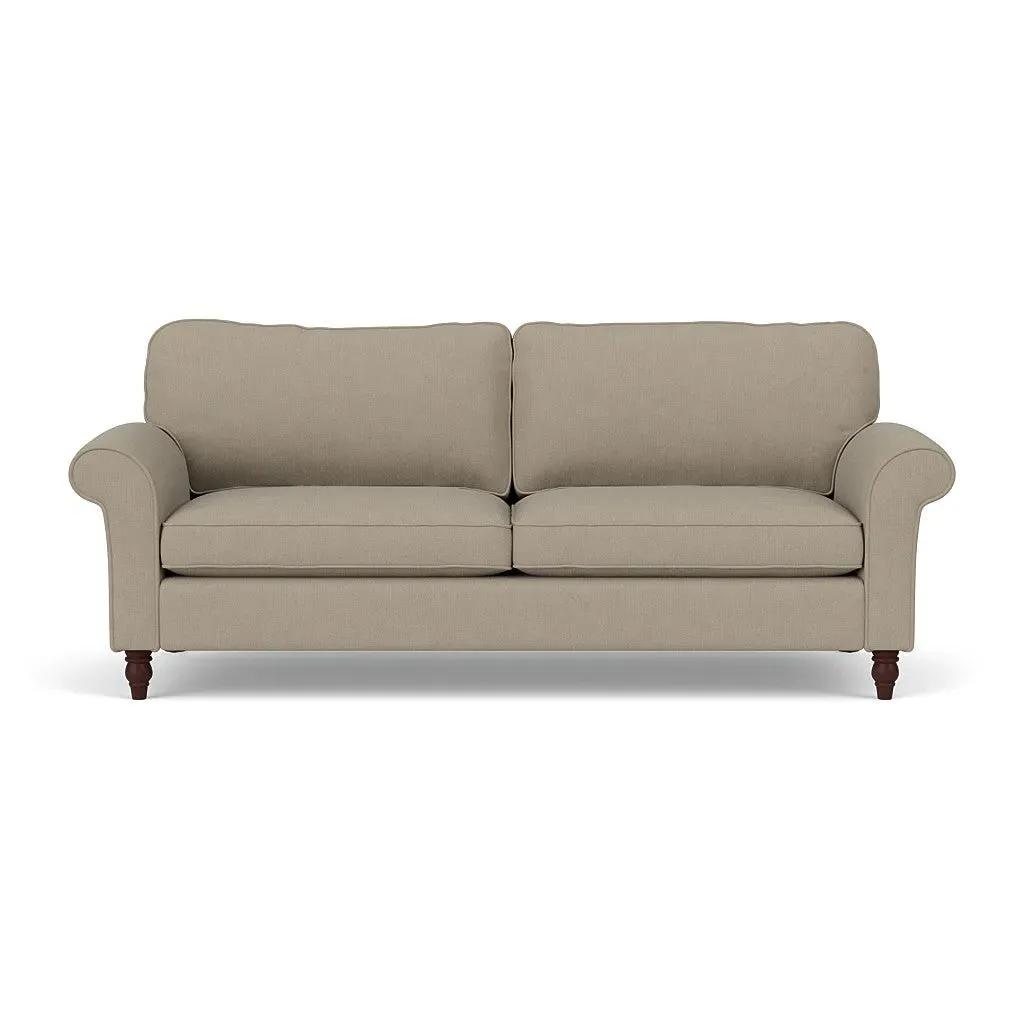 The sofa offers comforting support with its tall, scrolled arms and deep seat cushions. Its beautifully turned feet add character, while the generous seating provides ample space for relaxation. The design features both luxurious feather and low maintenance interior options to suit different preferences.