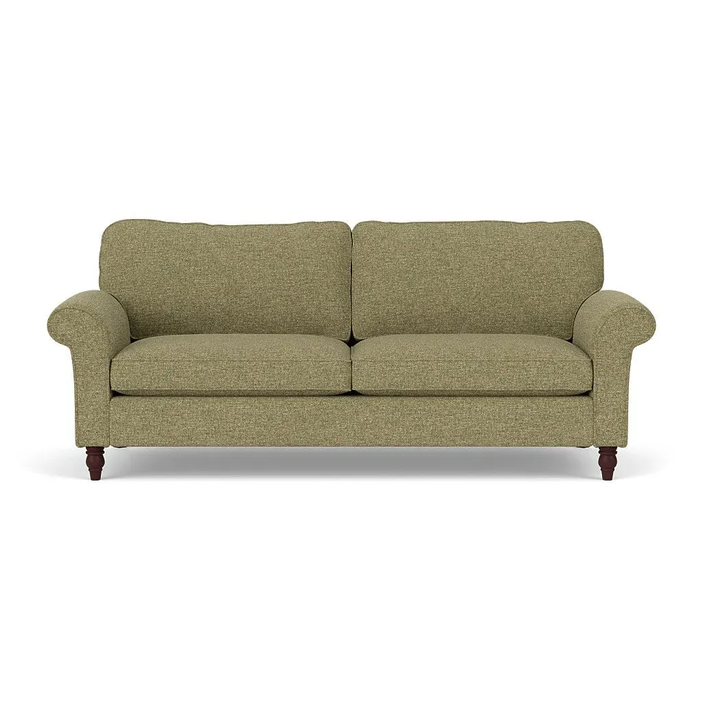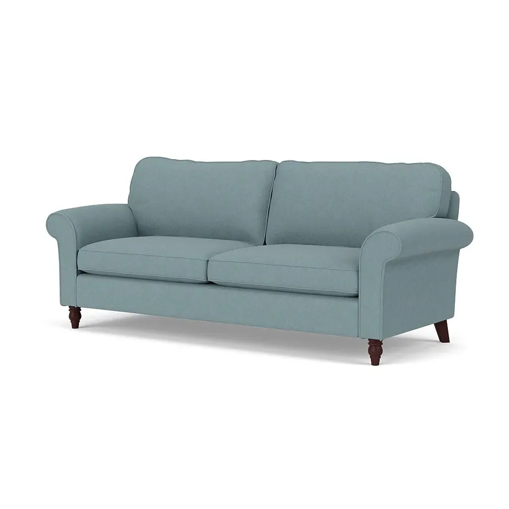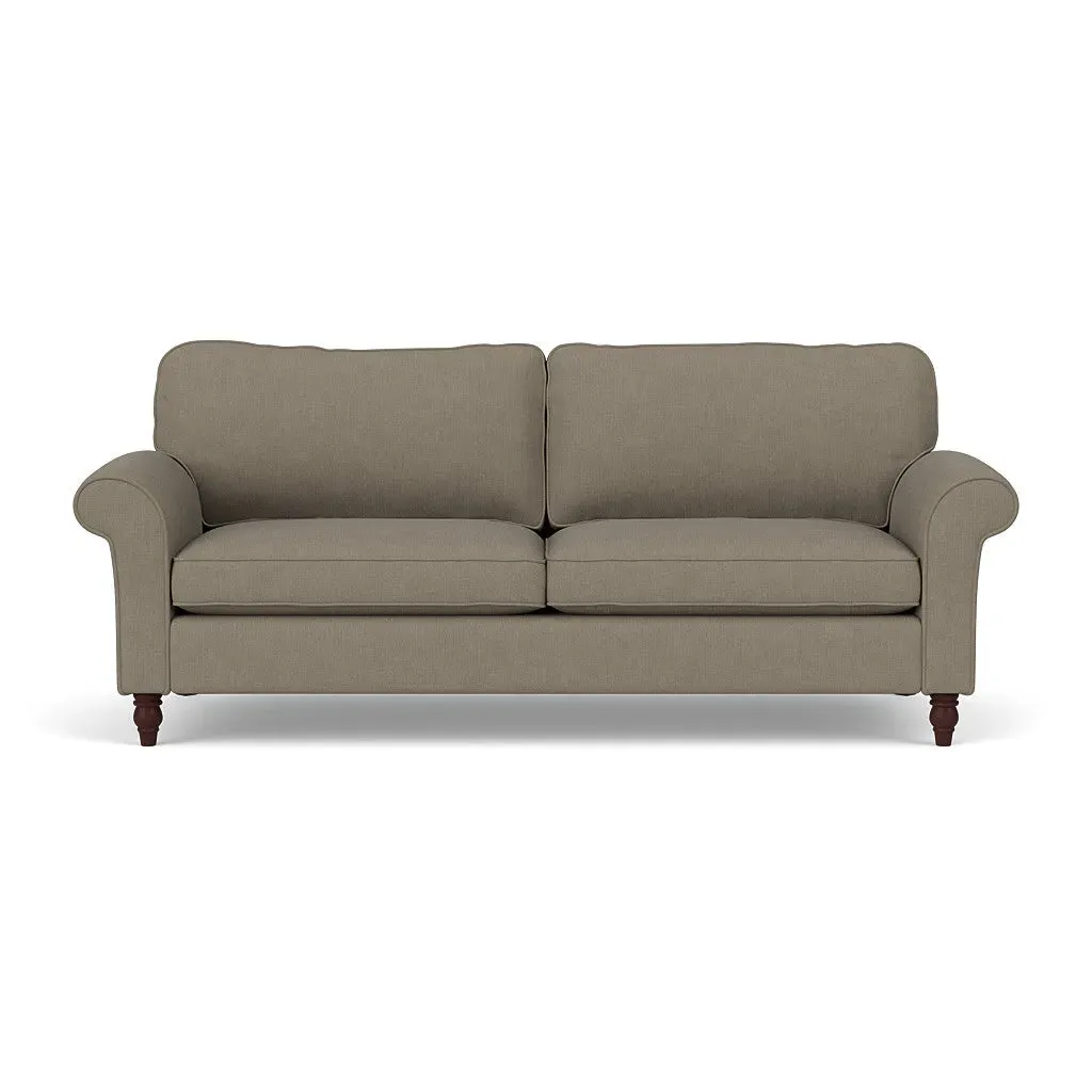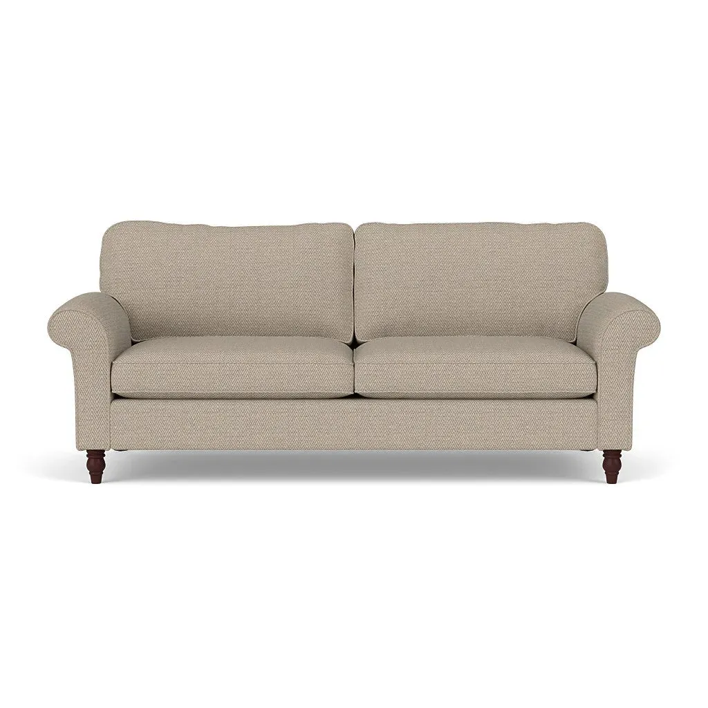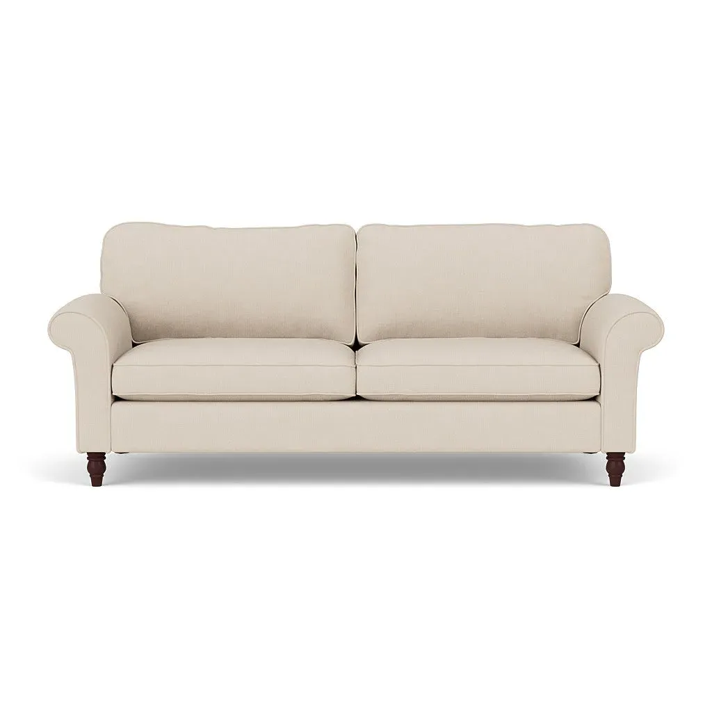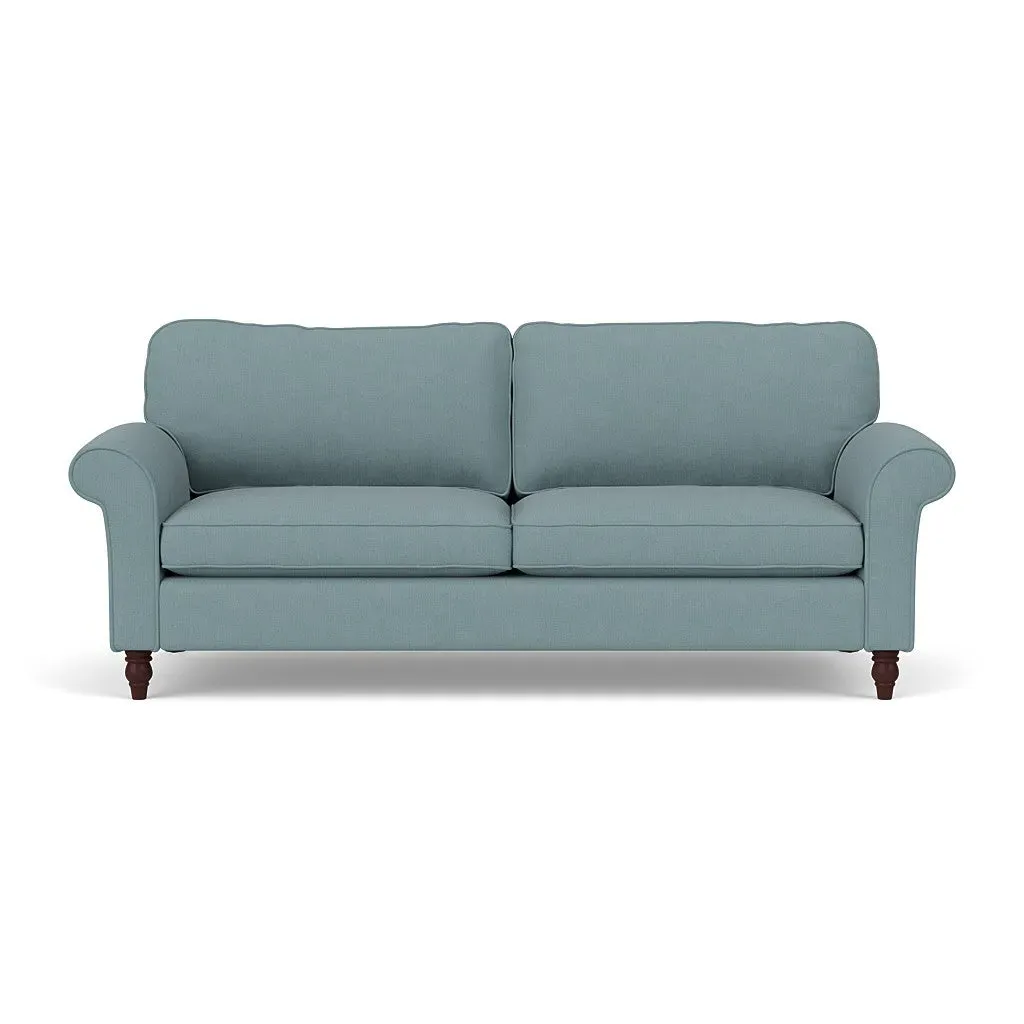 The sofa offers comforting support with its tall, scrolled arms and deep seat cushions. Its beautifully turned feet add character, while the generous seating provides ample space for relaxation. The design features both luxurious feather and low maintenance interior options to suit different preferences.