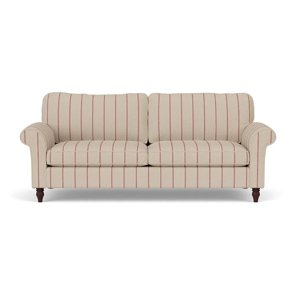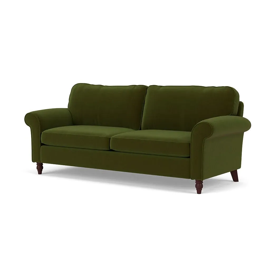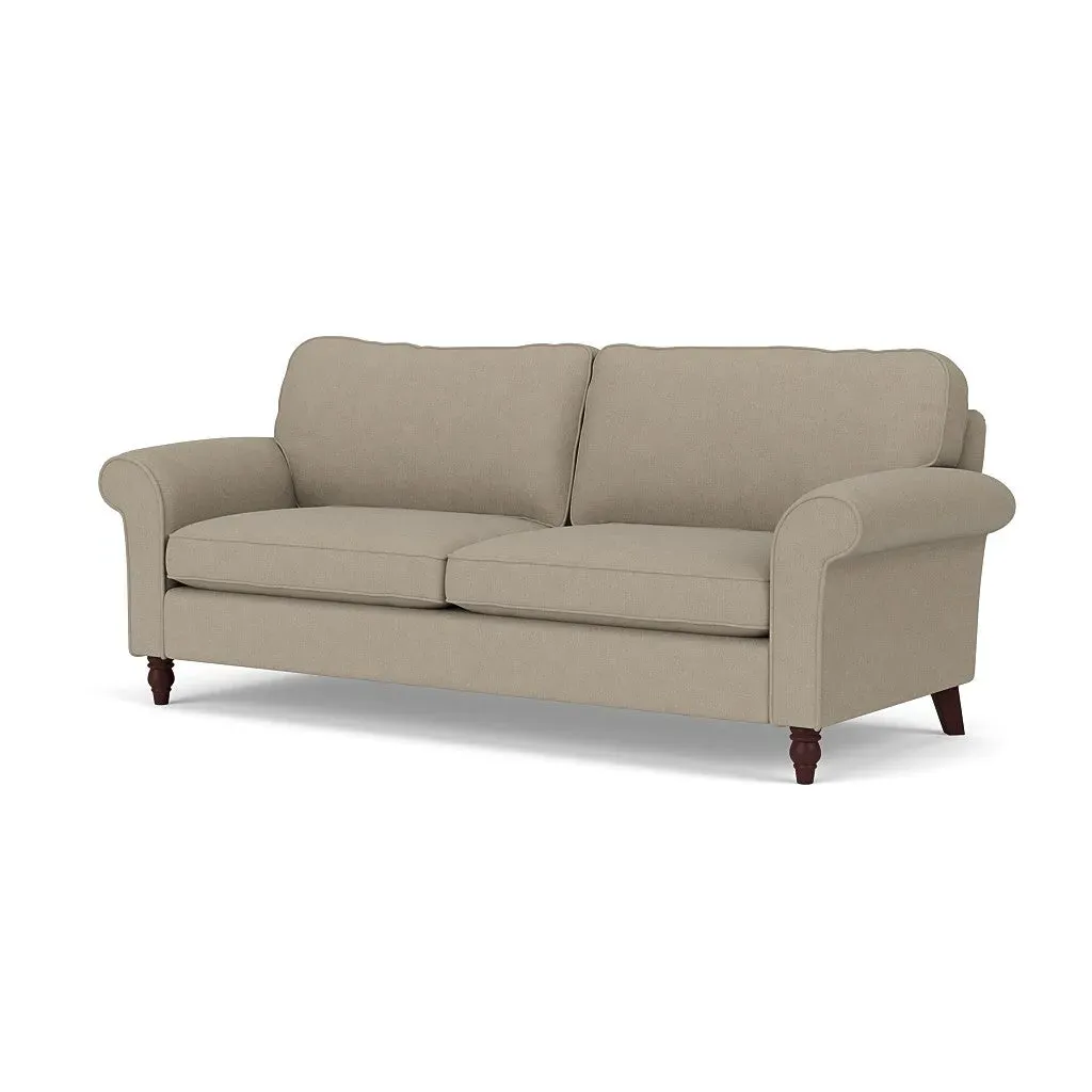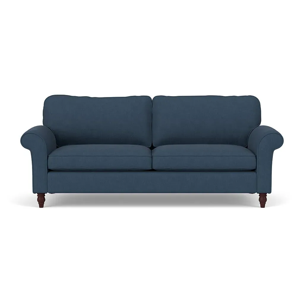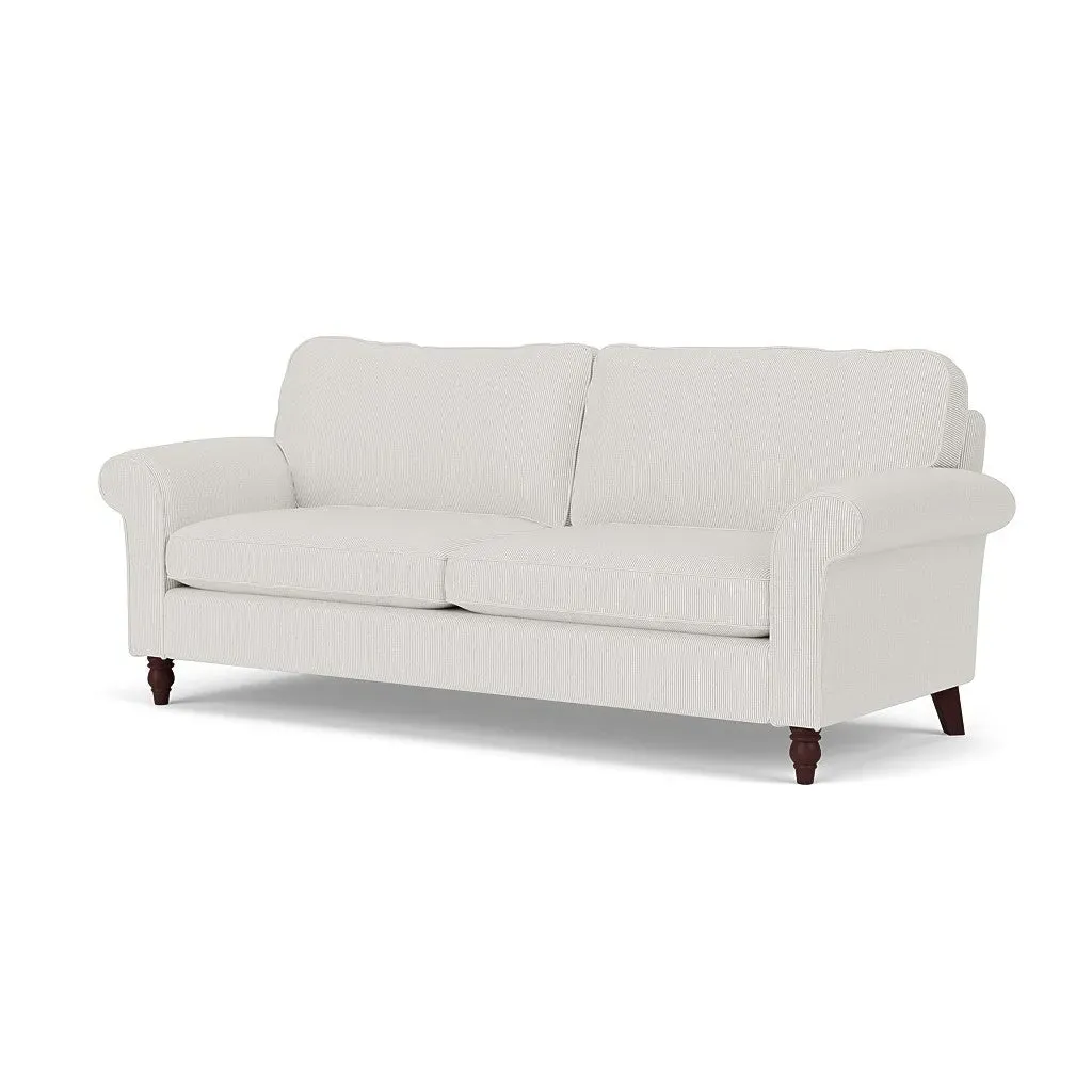 The sofa offers comforting support with its tall, scrolled arms and deep seat cushions. Its beautifully turned feet add character, while the generous seating provides ample space for relaxation. The design features both luxurious feather and low maintenance interior options to suit different preferences.