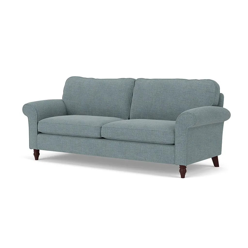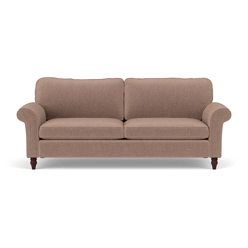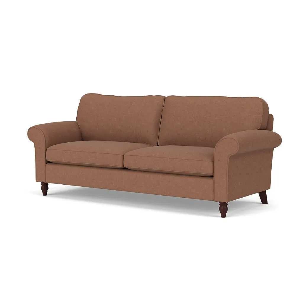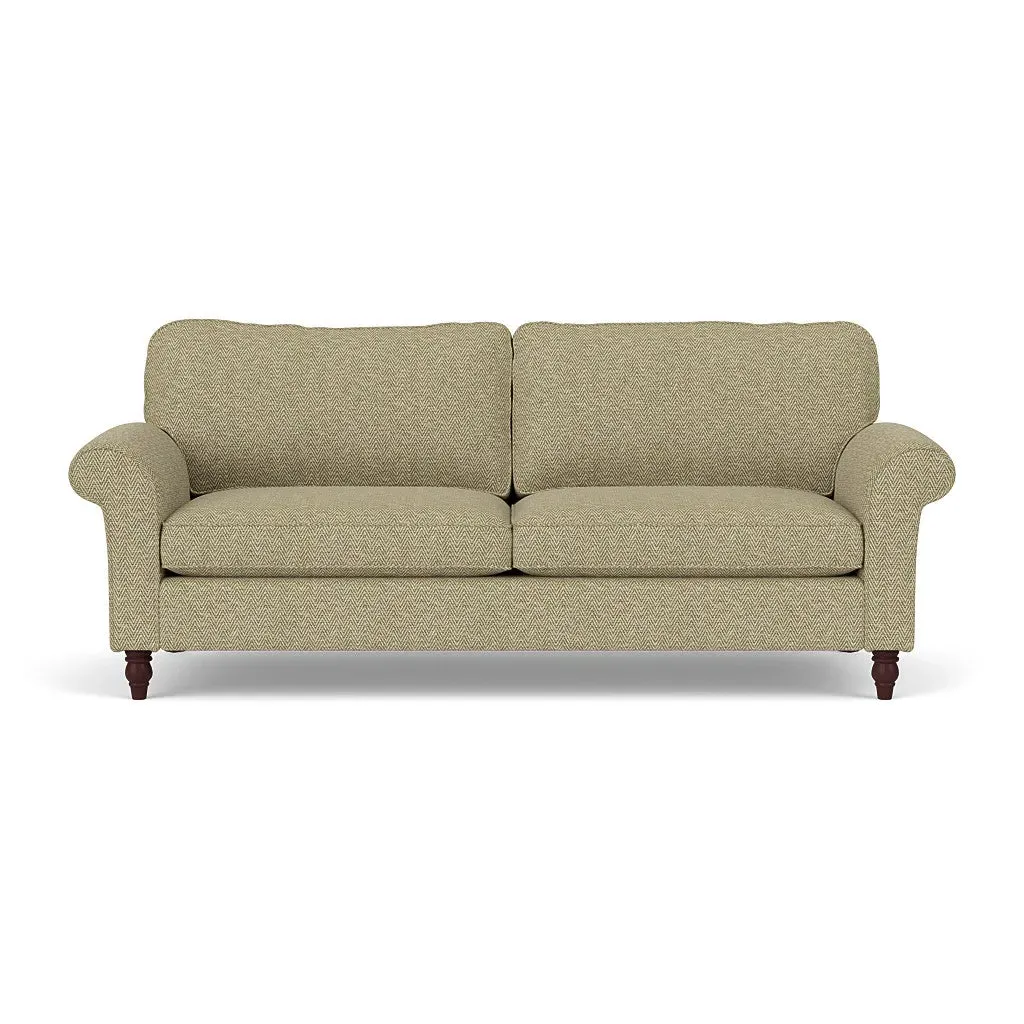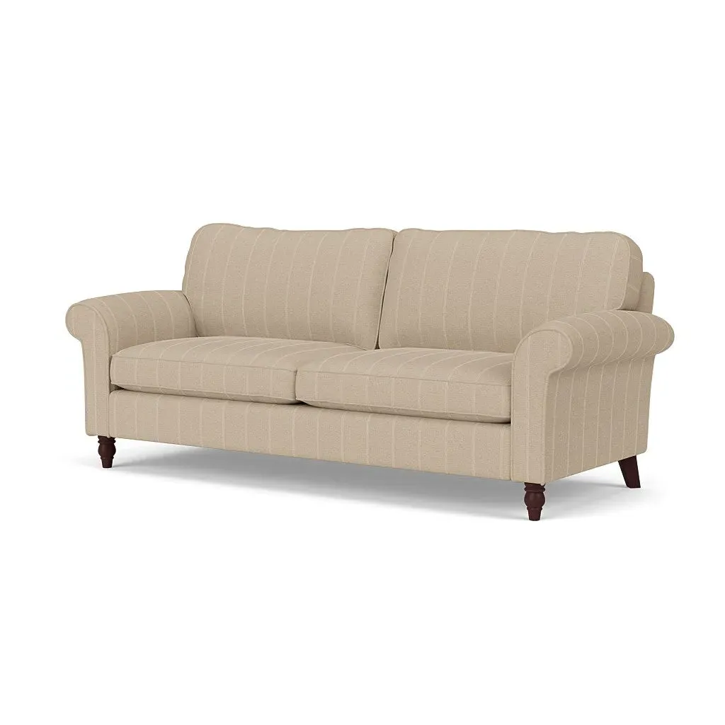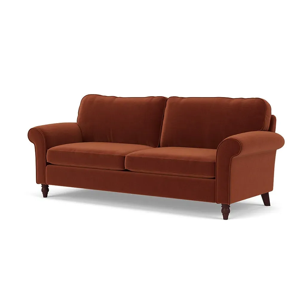 The sofa offers comforting support with its tall, scrolled arms and deep seat cushions. Its beautifully turned feet add character, while the generous seating provides ample space for relaxation. The design features both luxurious feather and low maintenance interior options to suit different preferences.