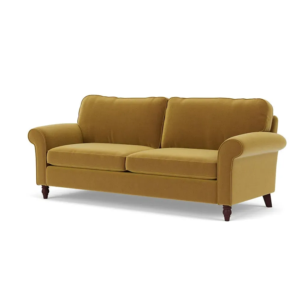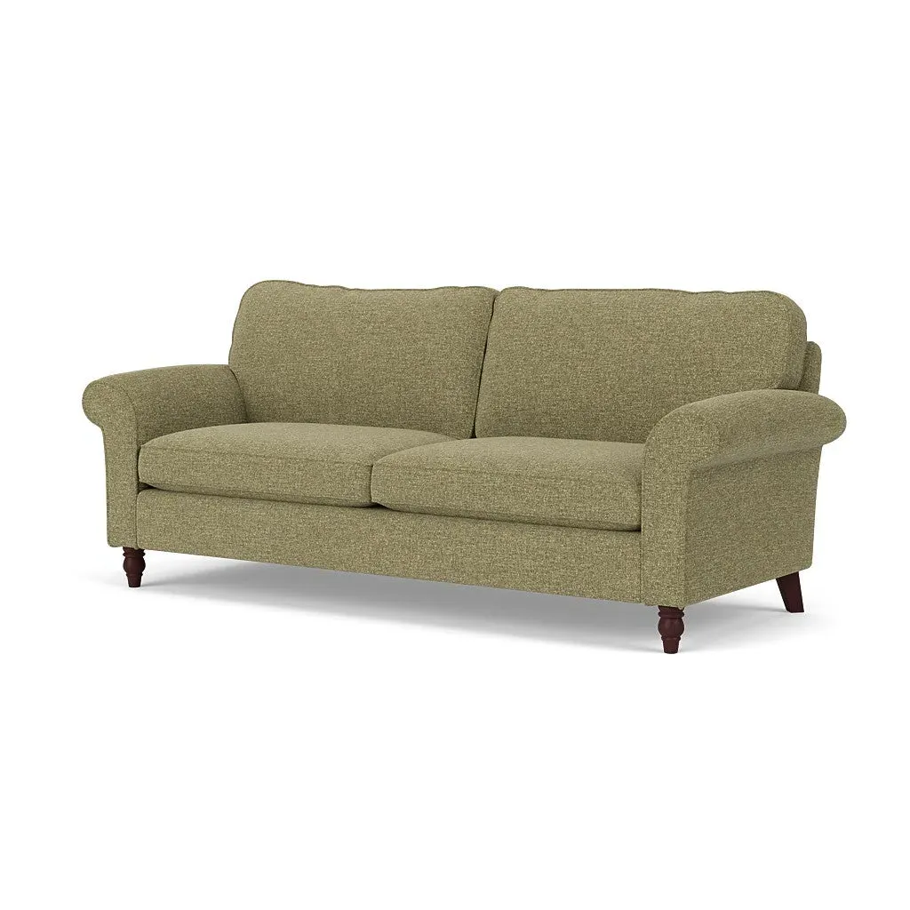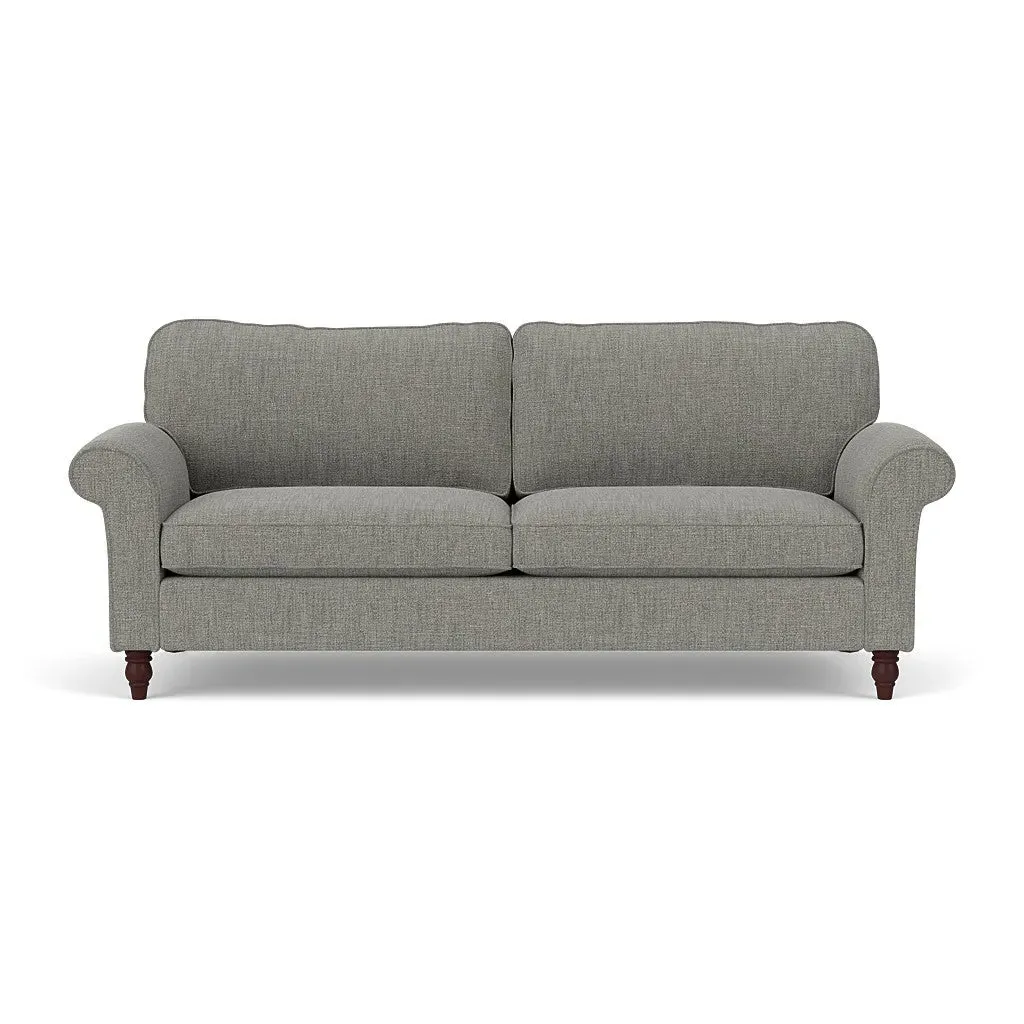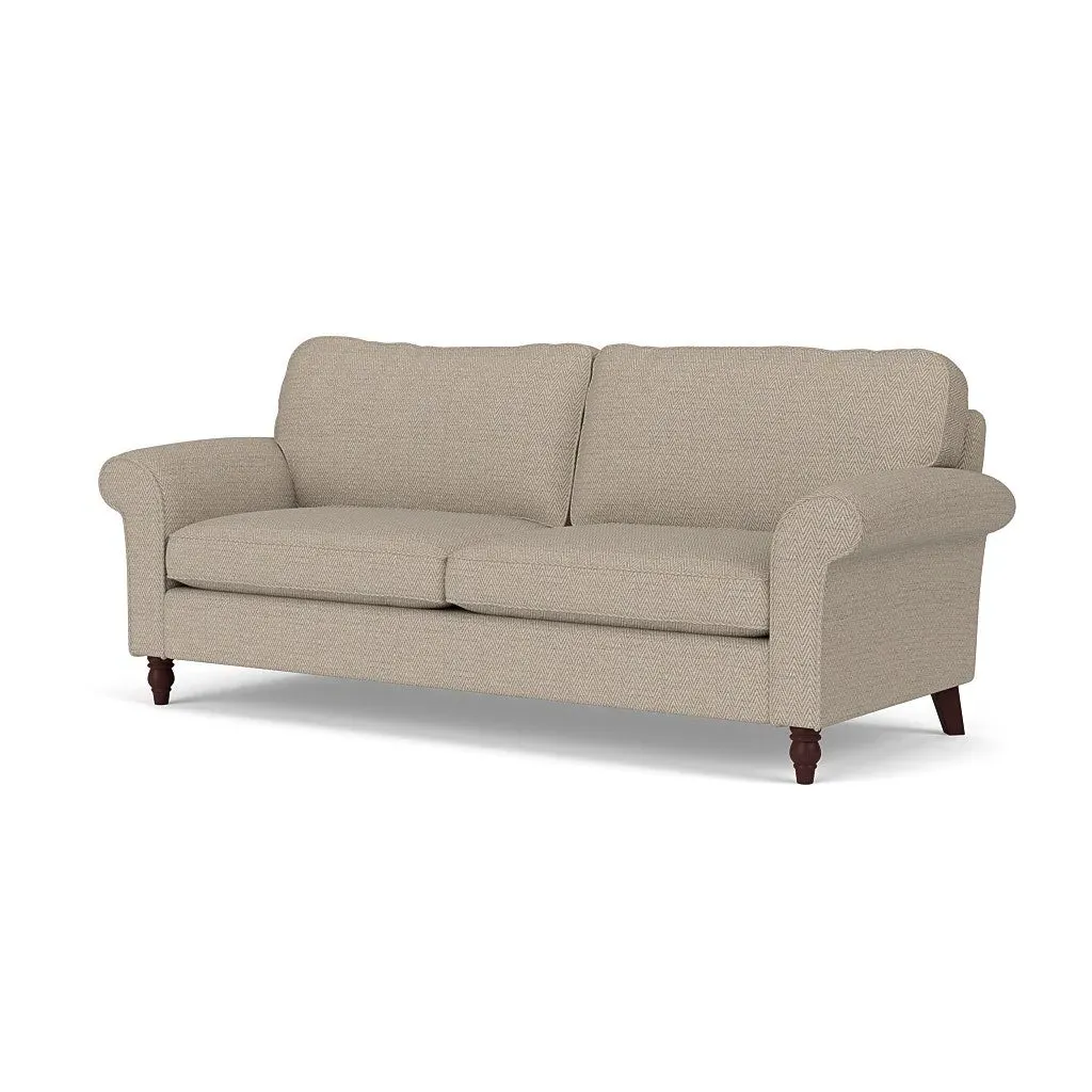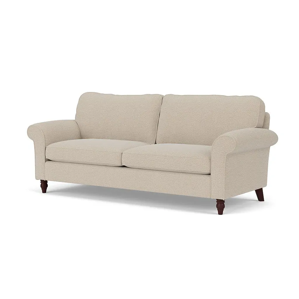 The sofa offers comforting support with its tall, scrolled arms and deep seat cushions. Its beautifully turned feet add character, while the generous seating provides ample space for relaxation. The design features both luxurious feather and low maintenance interior options to suit different preferences.