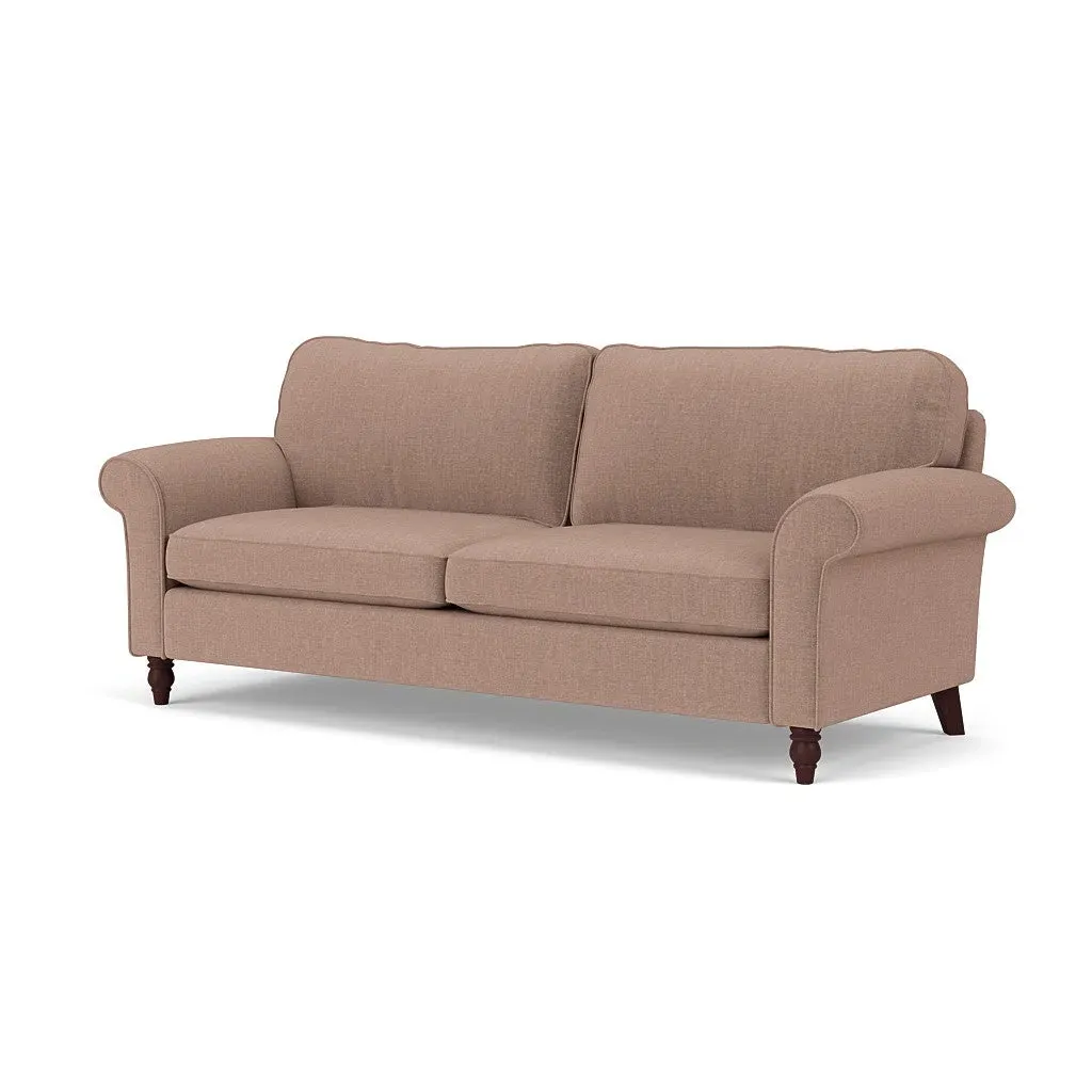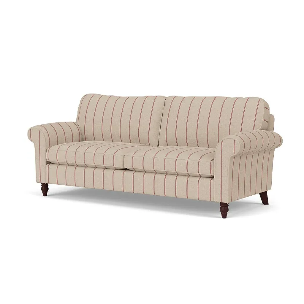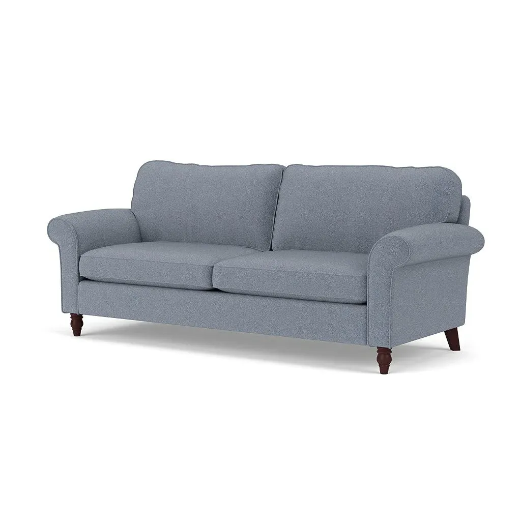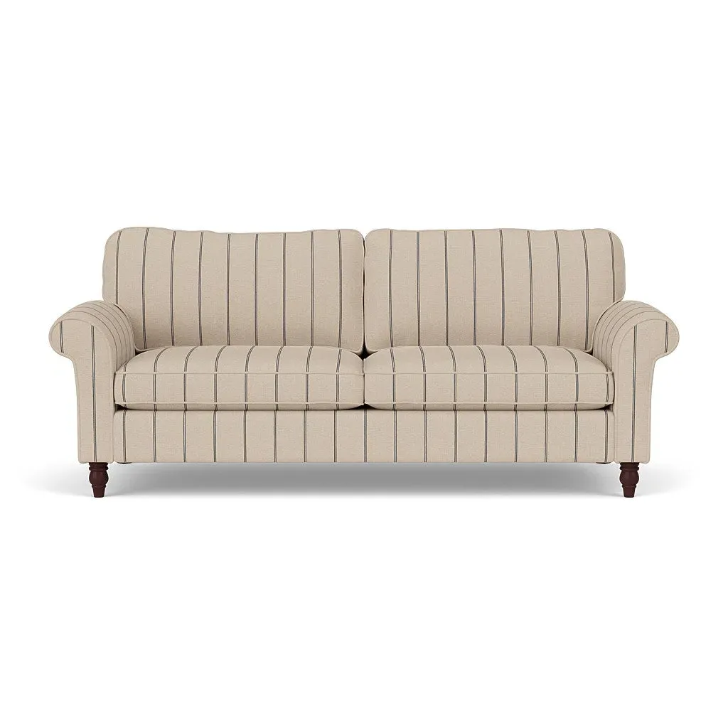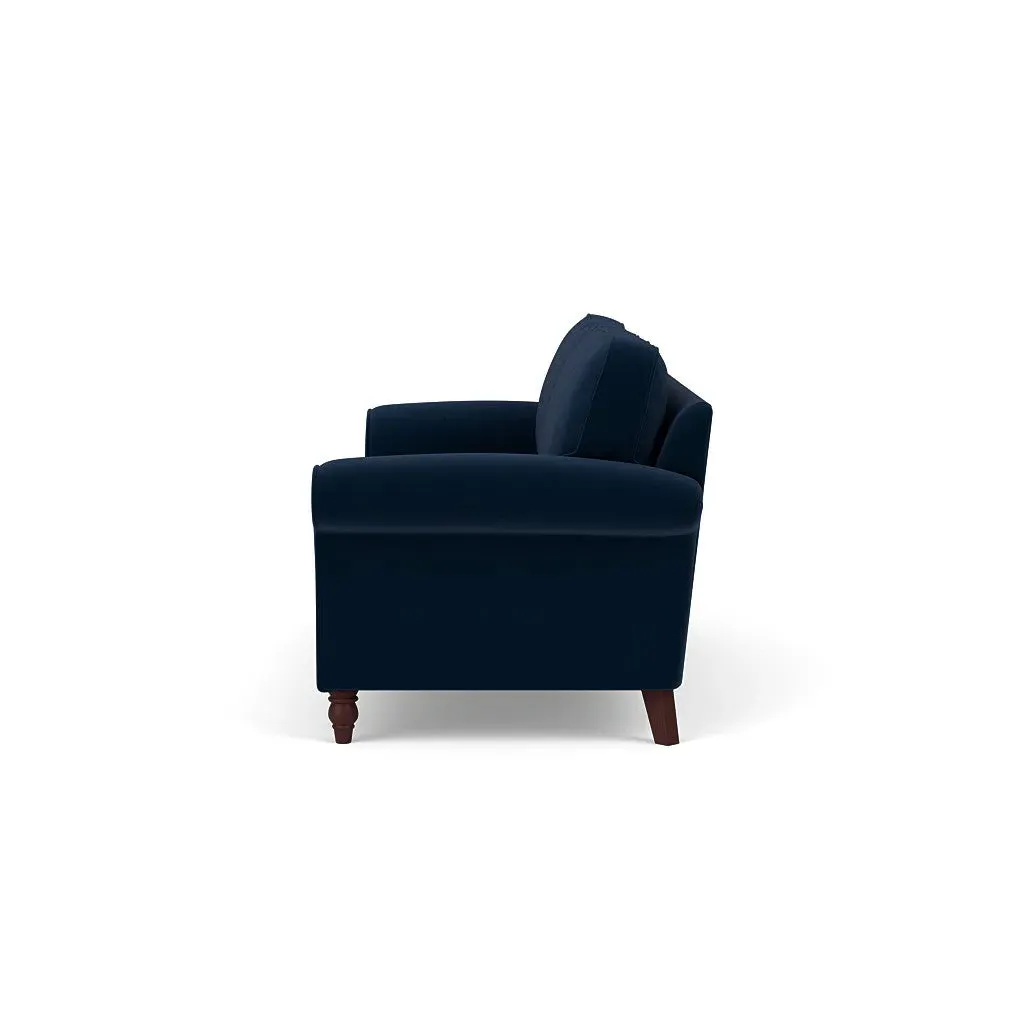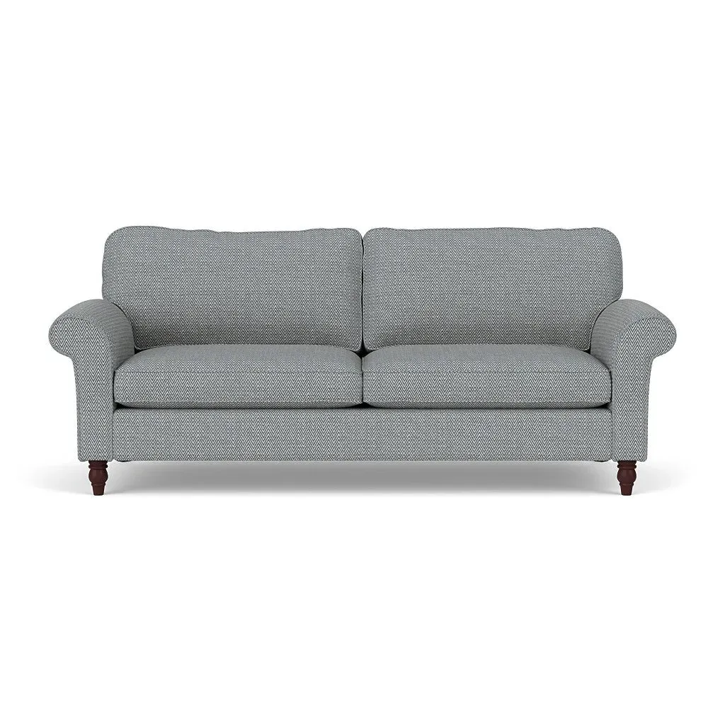 The sofa offers comforting support with its tall, scrolled arms and deep seat cushions. Its beautifully turned feet add character, while the generous seating provides ample space for relaxation. The design features both luxurious feather and low maintenance interior options to suit different preferences.