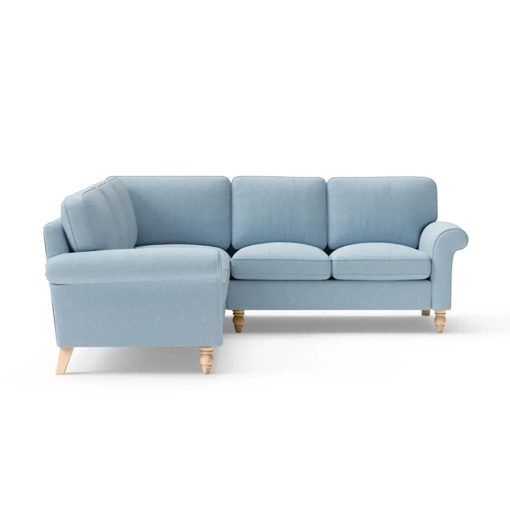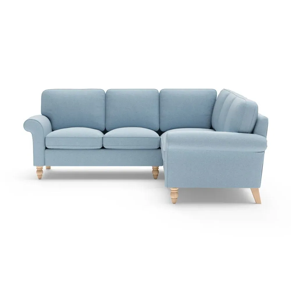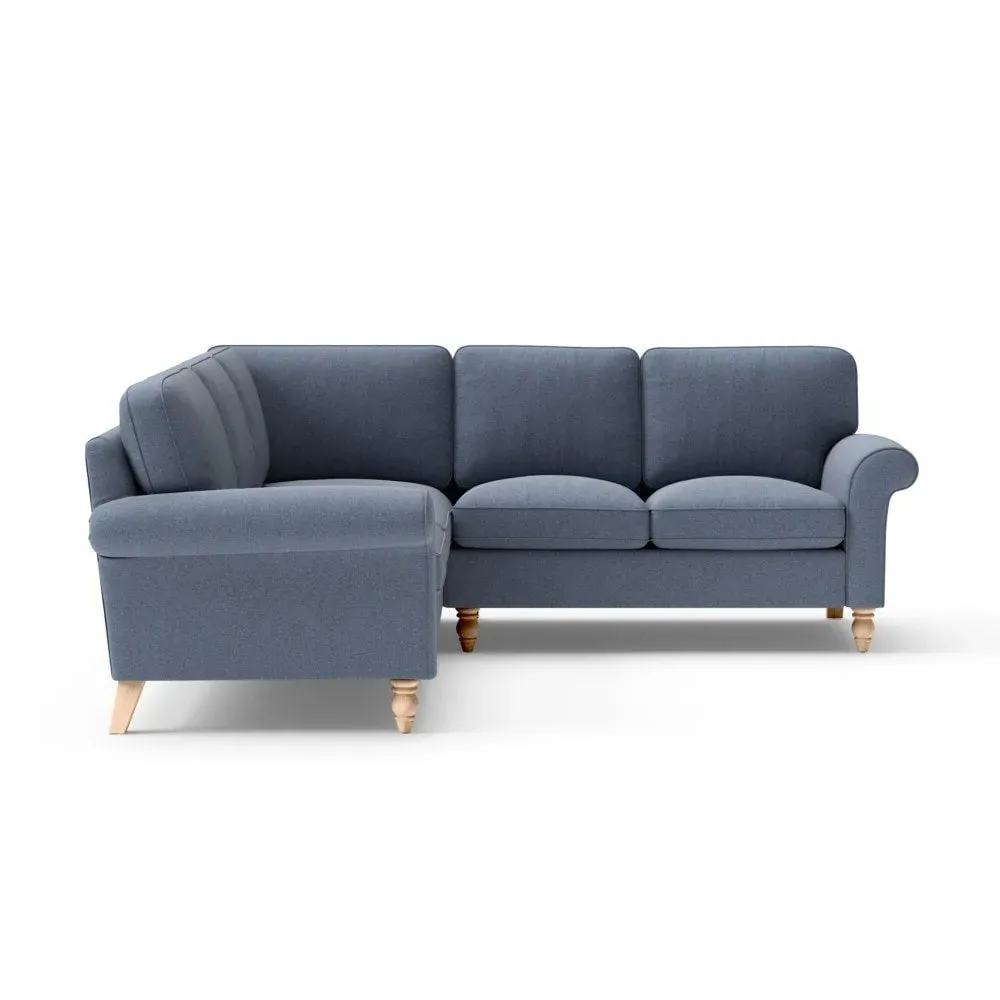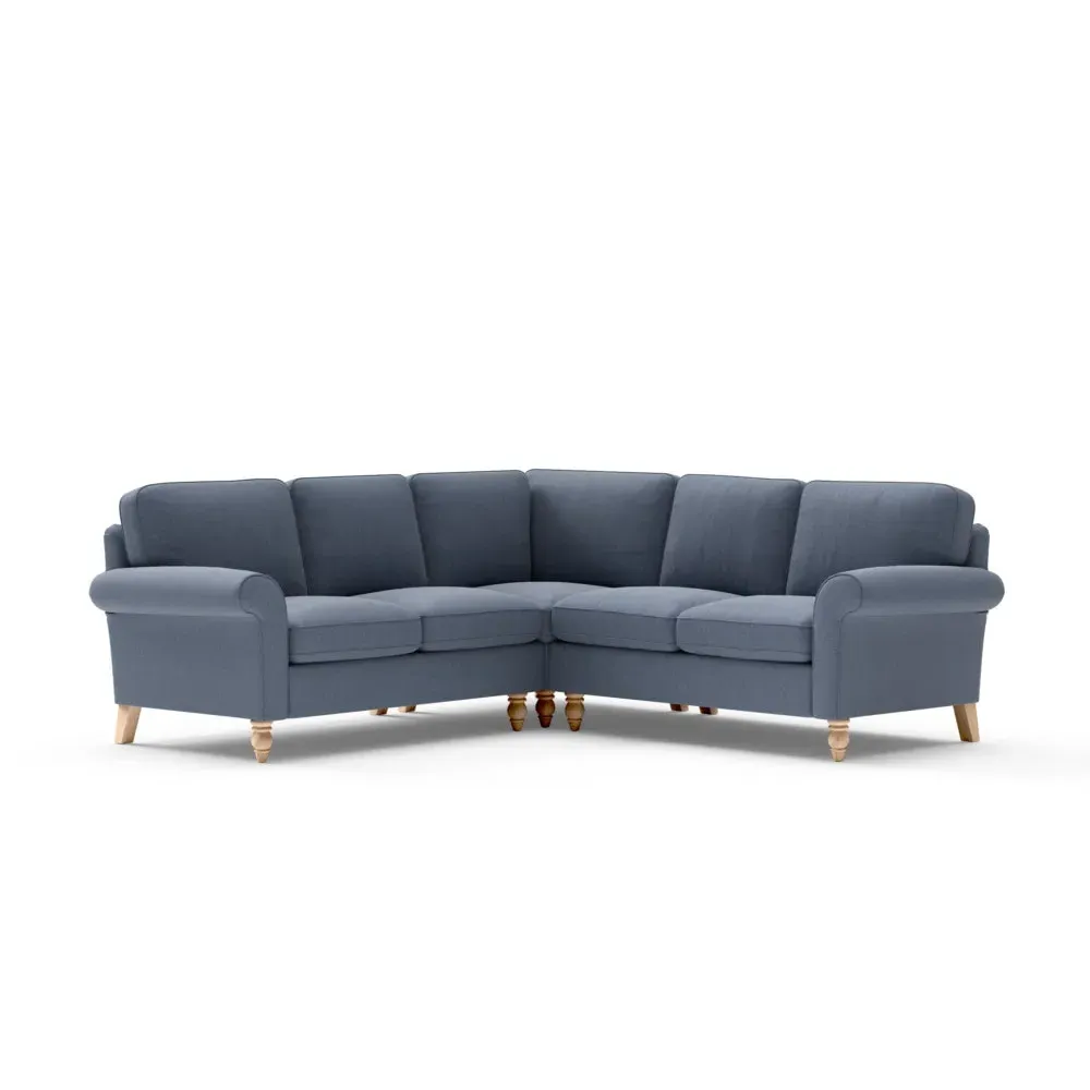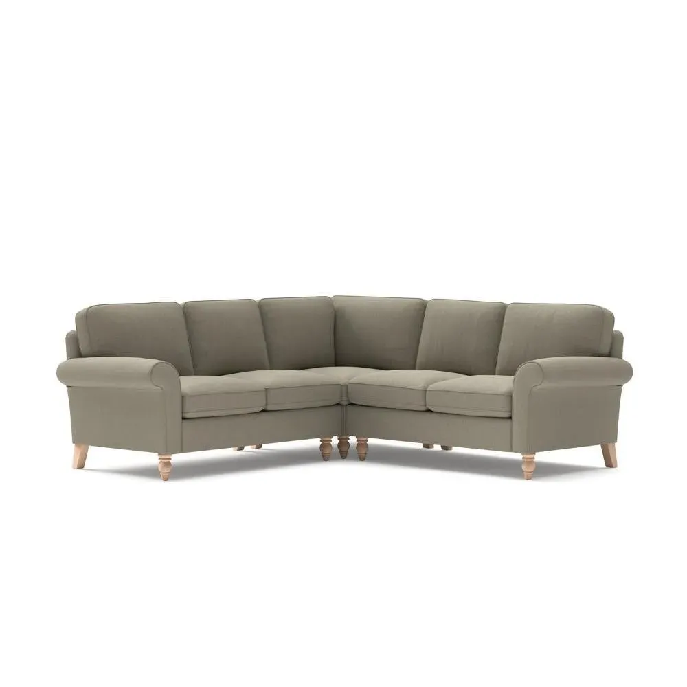 The corner sofa provides a comforting embrace with its tall, scrolled arms and deep seat cushions. Its beautifully turned feet add character, while the house linen mix fabric offers durability and texture. The design features both luxurious feather and low maintenance interior options to suit different preferences.