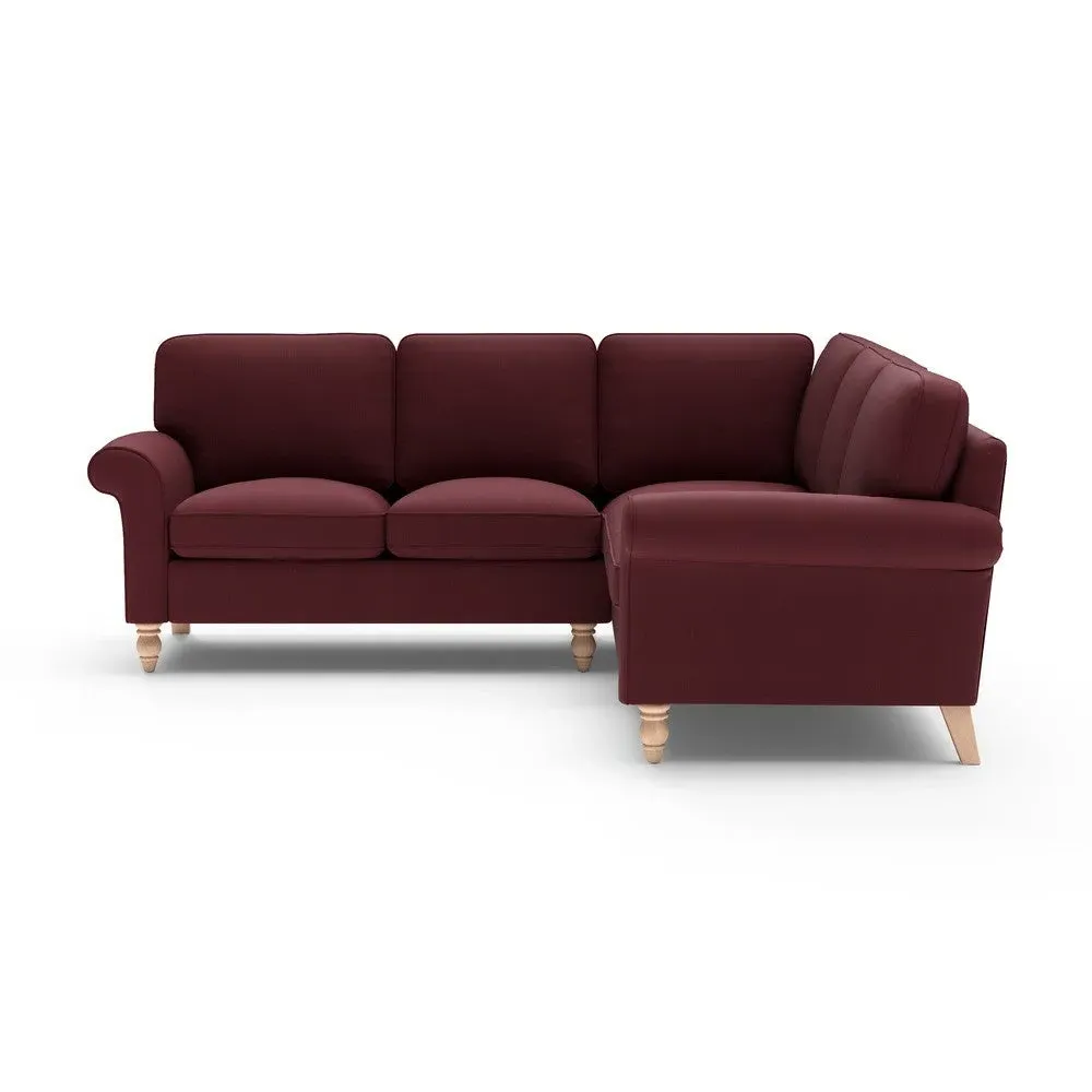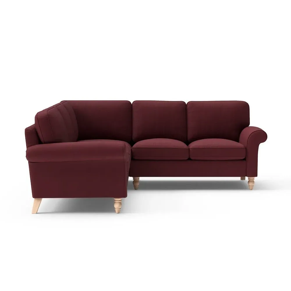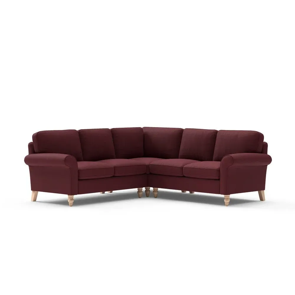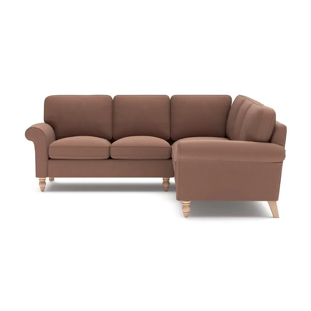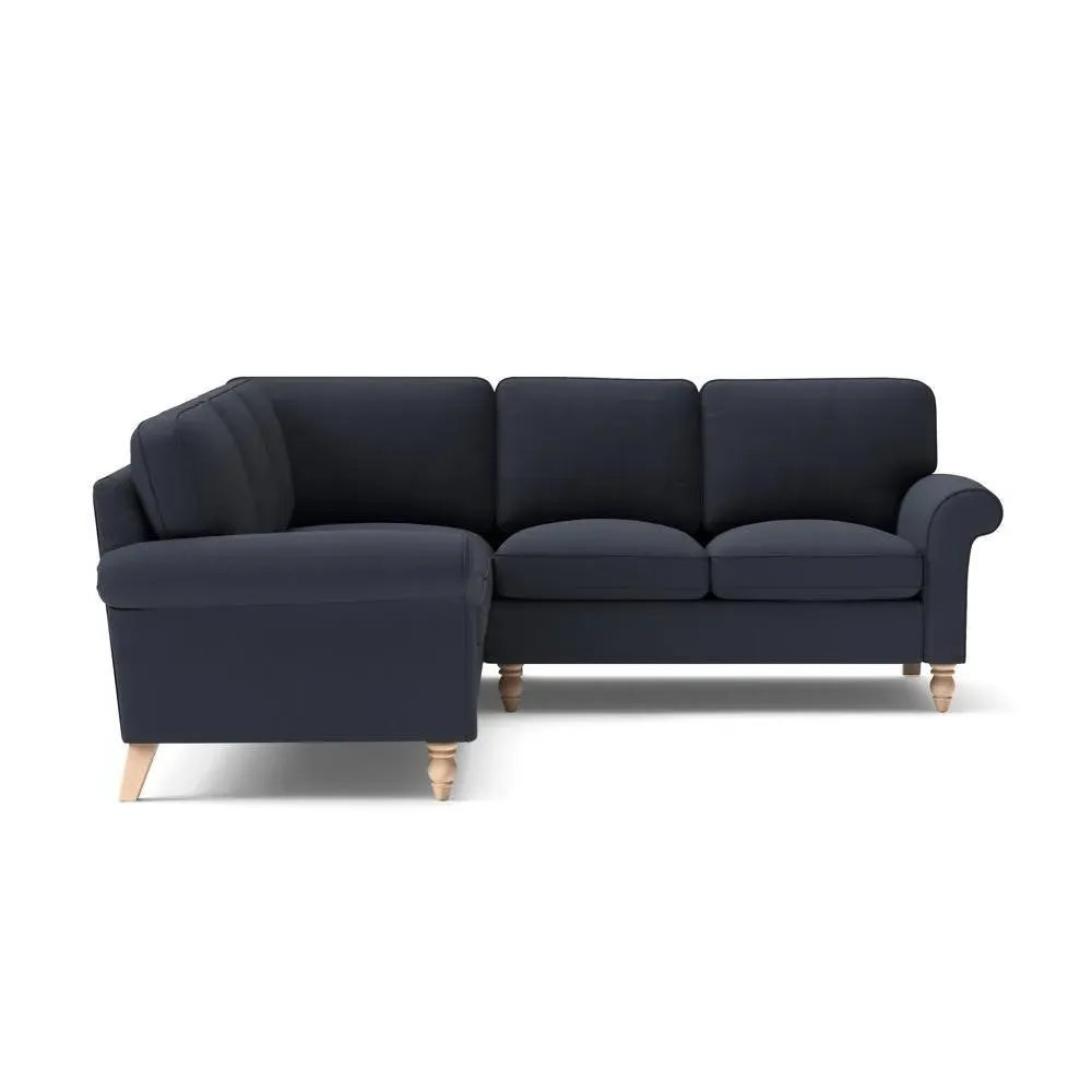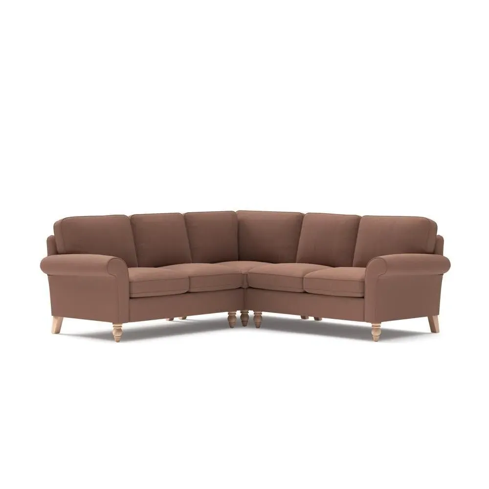 The corner sofa provides a comforting embrace with its tall, scrolled arms and deep seat cushions. Its beautifully turned feet add character, while the house linen mix fabric offers durability and texture. The design features both luxurious feather and low maintenance interior options to suit different preferences.