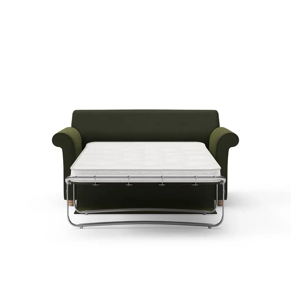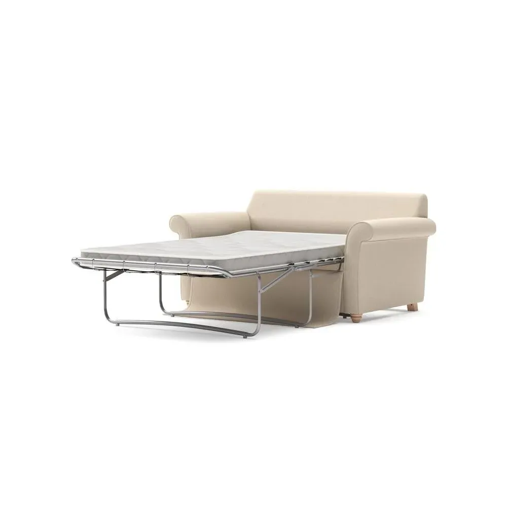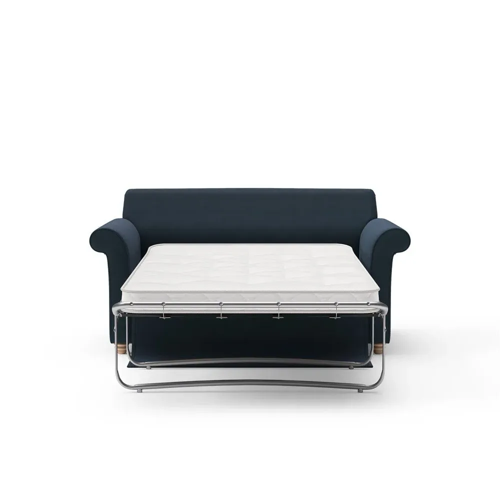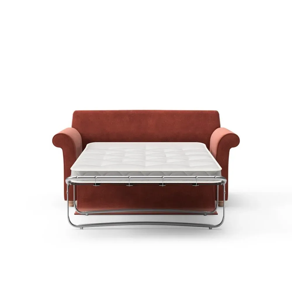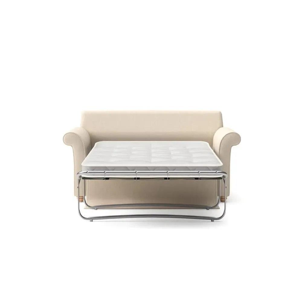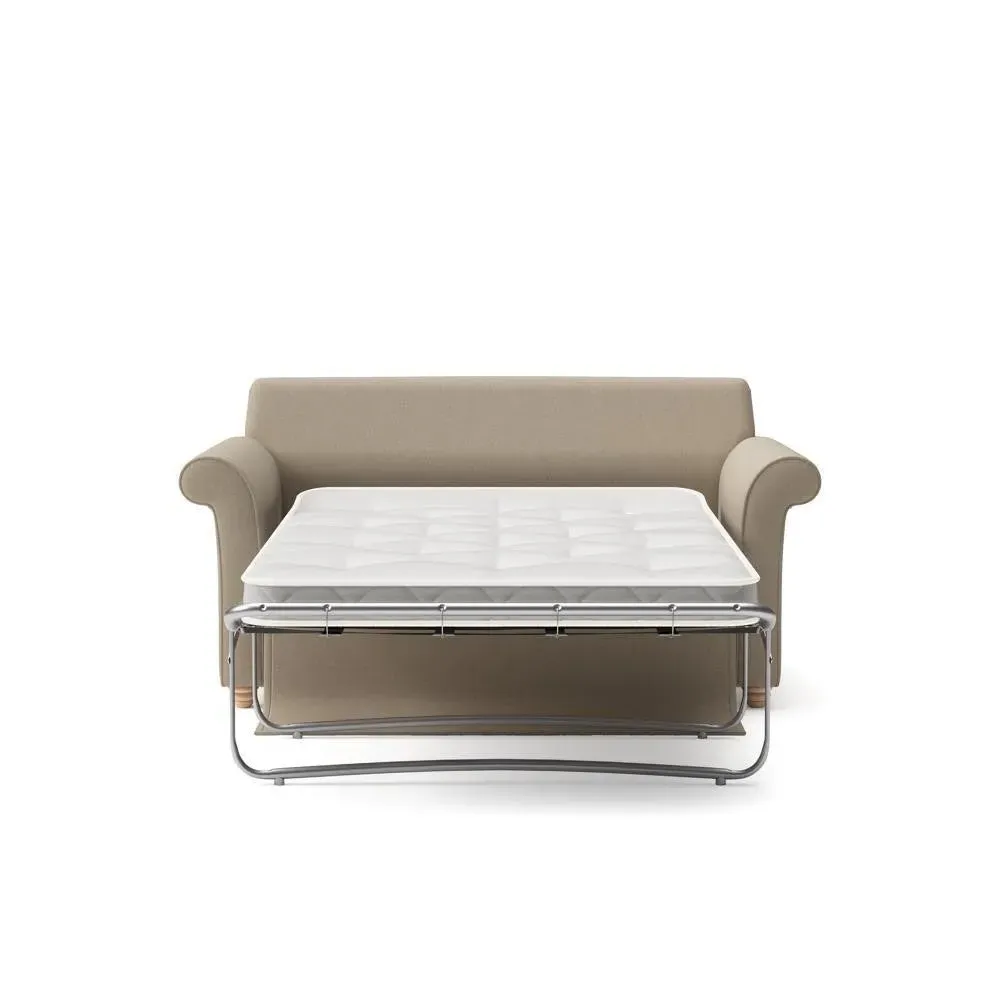 The sofa bed offers comfortable seating and sleeping with its tall, scrolled arms and deep seat cushions that provide a comforting embrace. Its beautifully turned feet add character to the design, while the construction accommodates both luxurious feather and low maintenance interior options. The dual functionality suits versatile living spaces, and the sturdy frame ensures lasting durability.