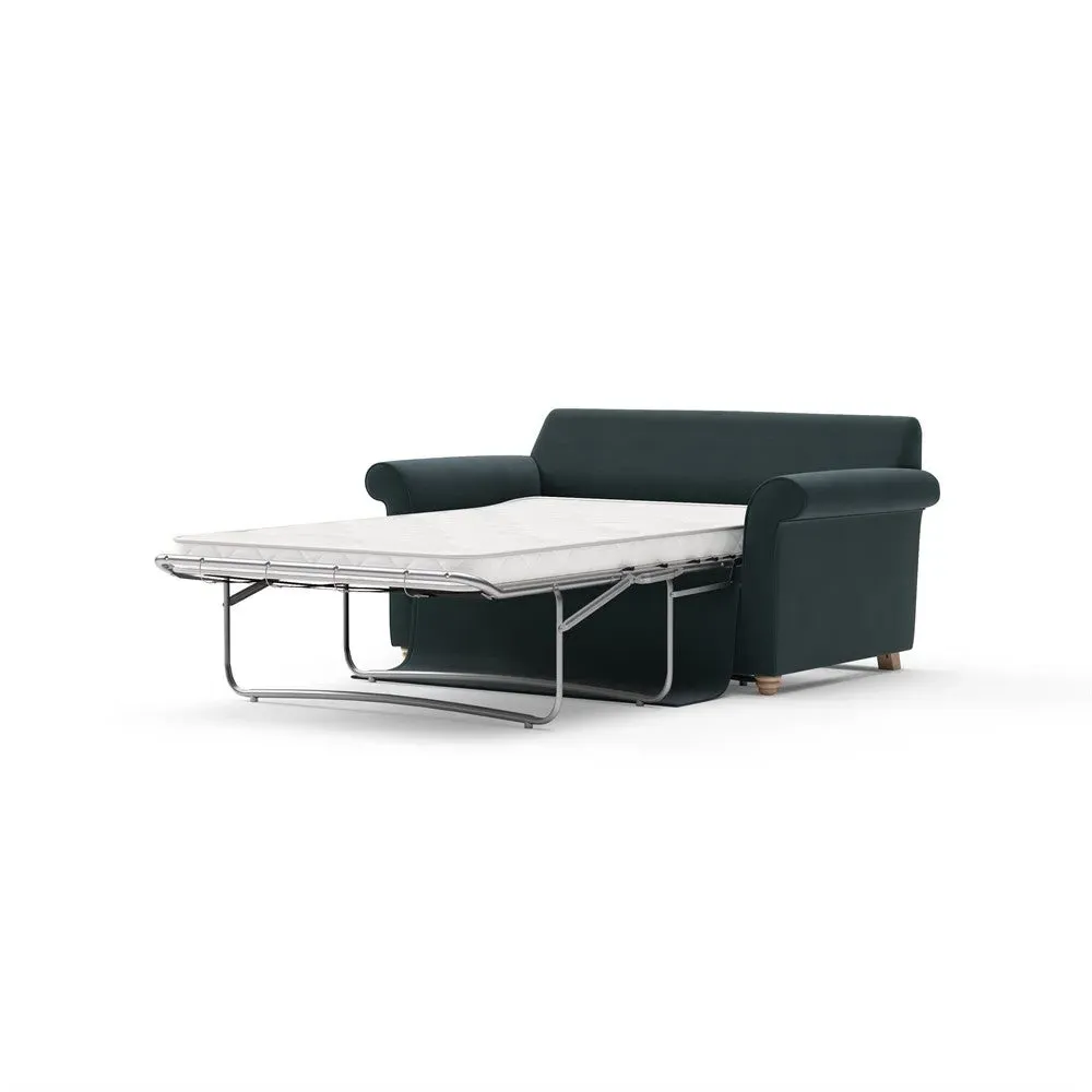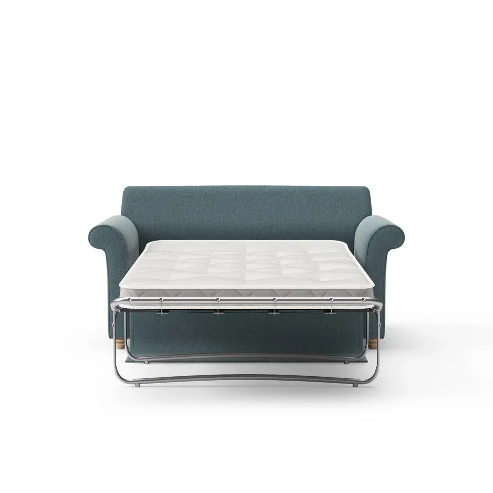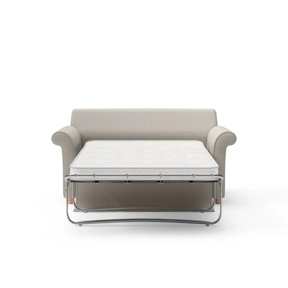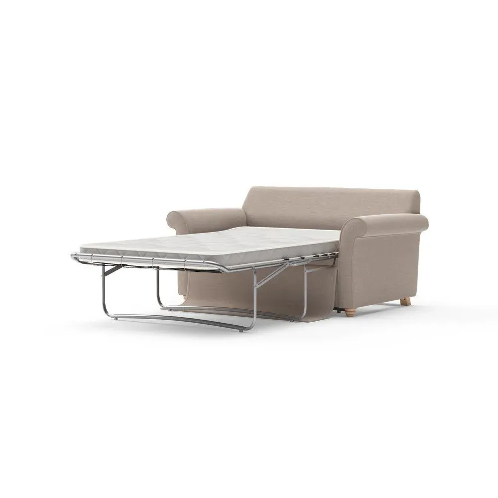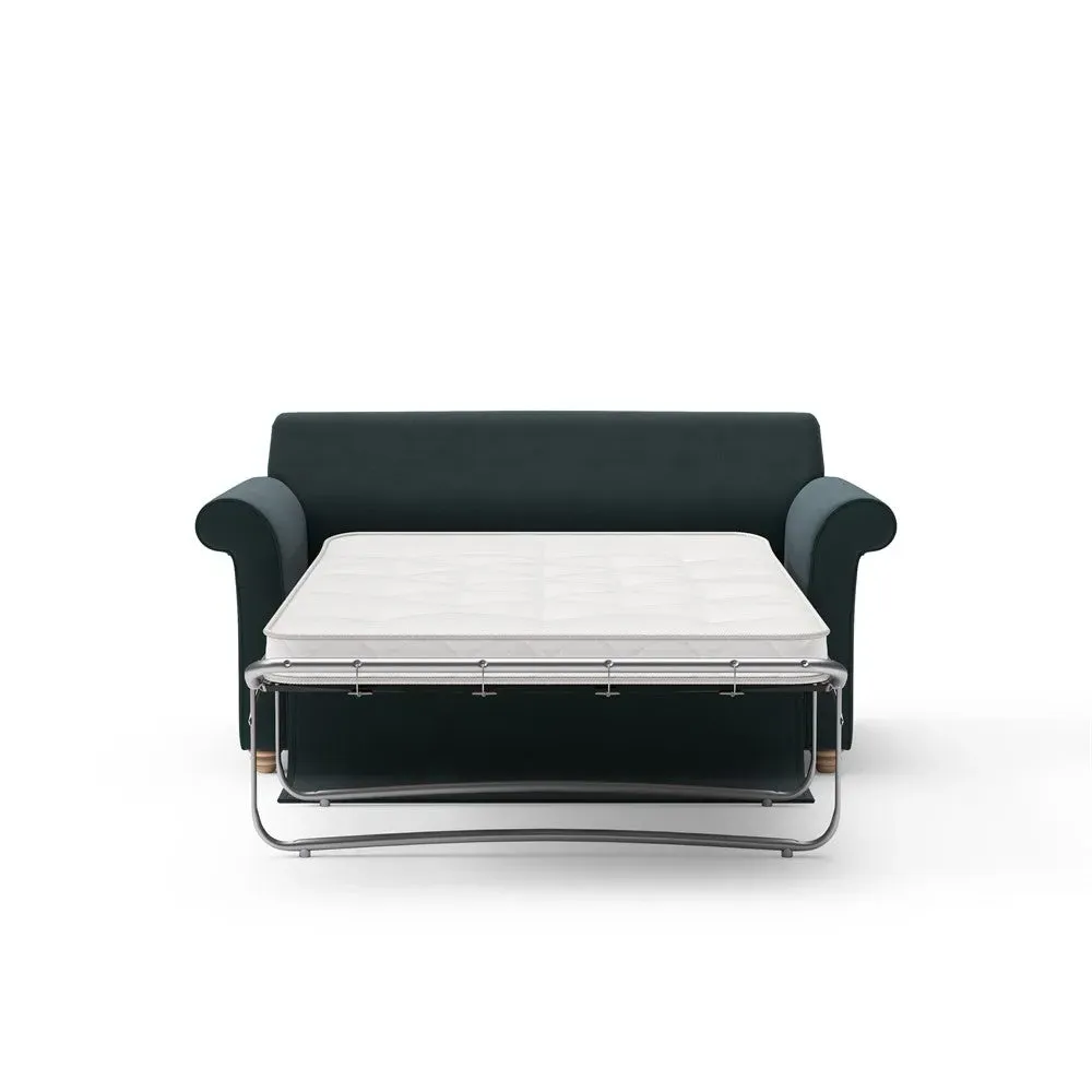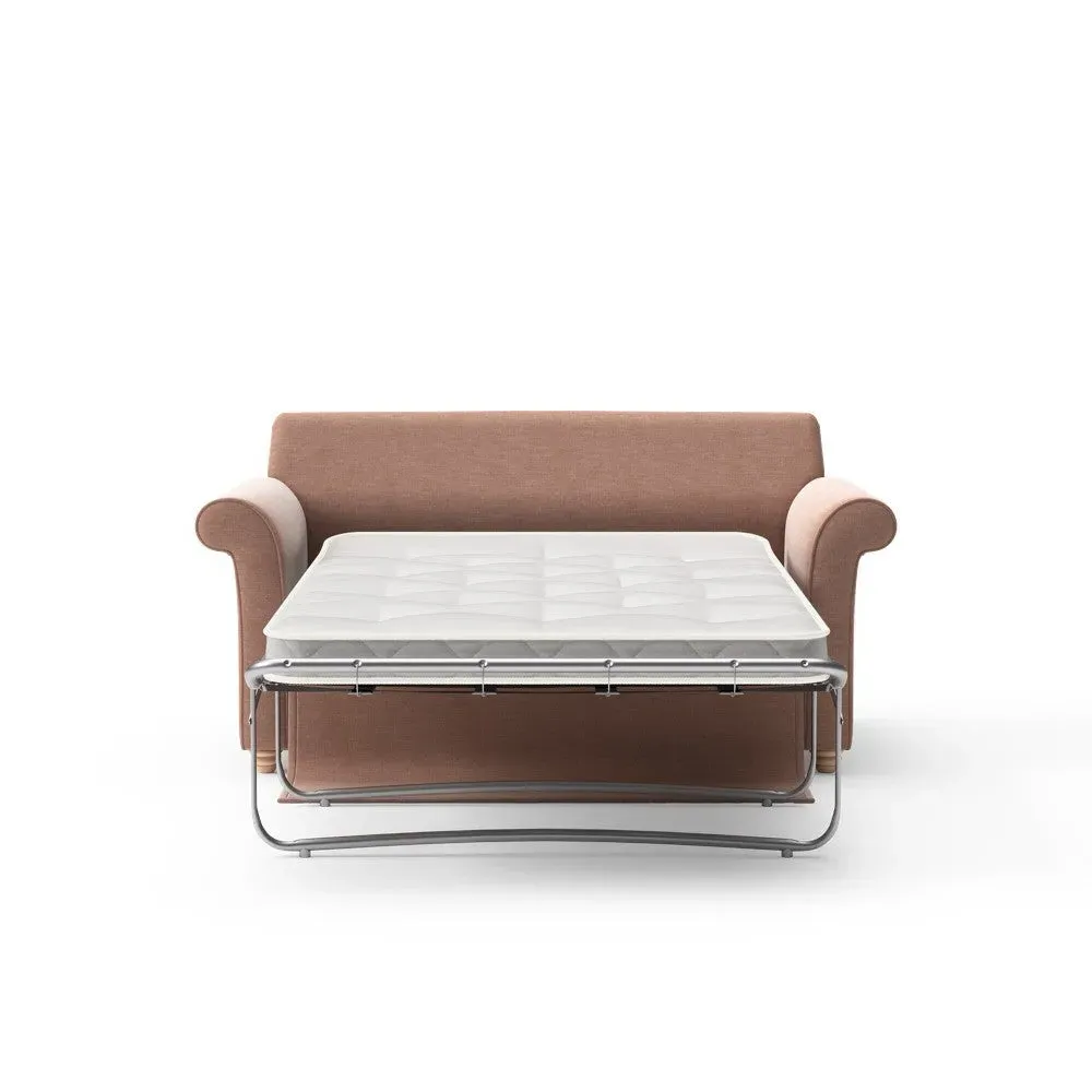 The sofa bed offers comfortable seating and sleeping with its tall, scrolled arms and deep seat cushions that provide a comforting embrace. Its beautifully turned feet add character to the design, while the construction accommodates both luxurious feather and low maintenance interior options. The dual functionality suits versatile living spaces, and the sturdy frame ensures lasting durability.