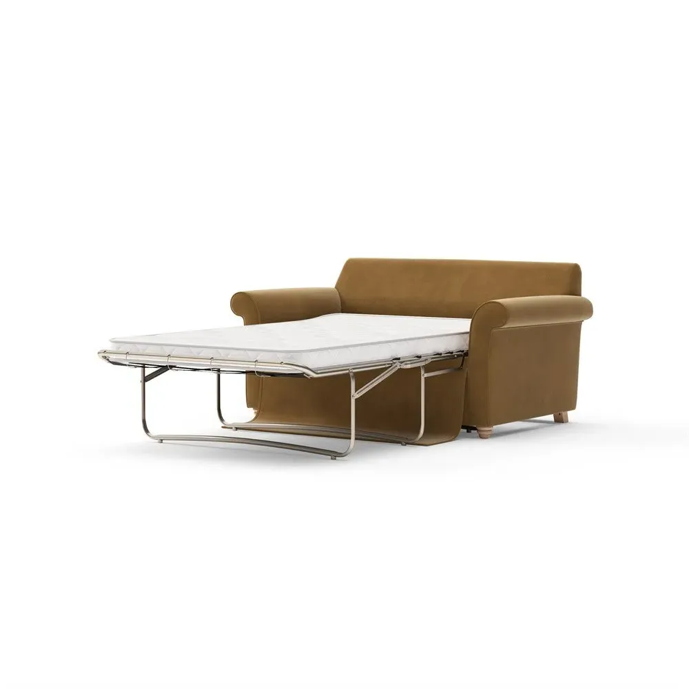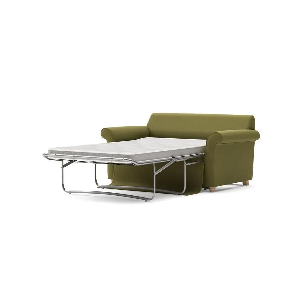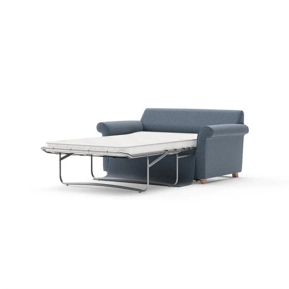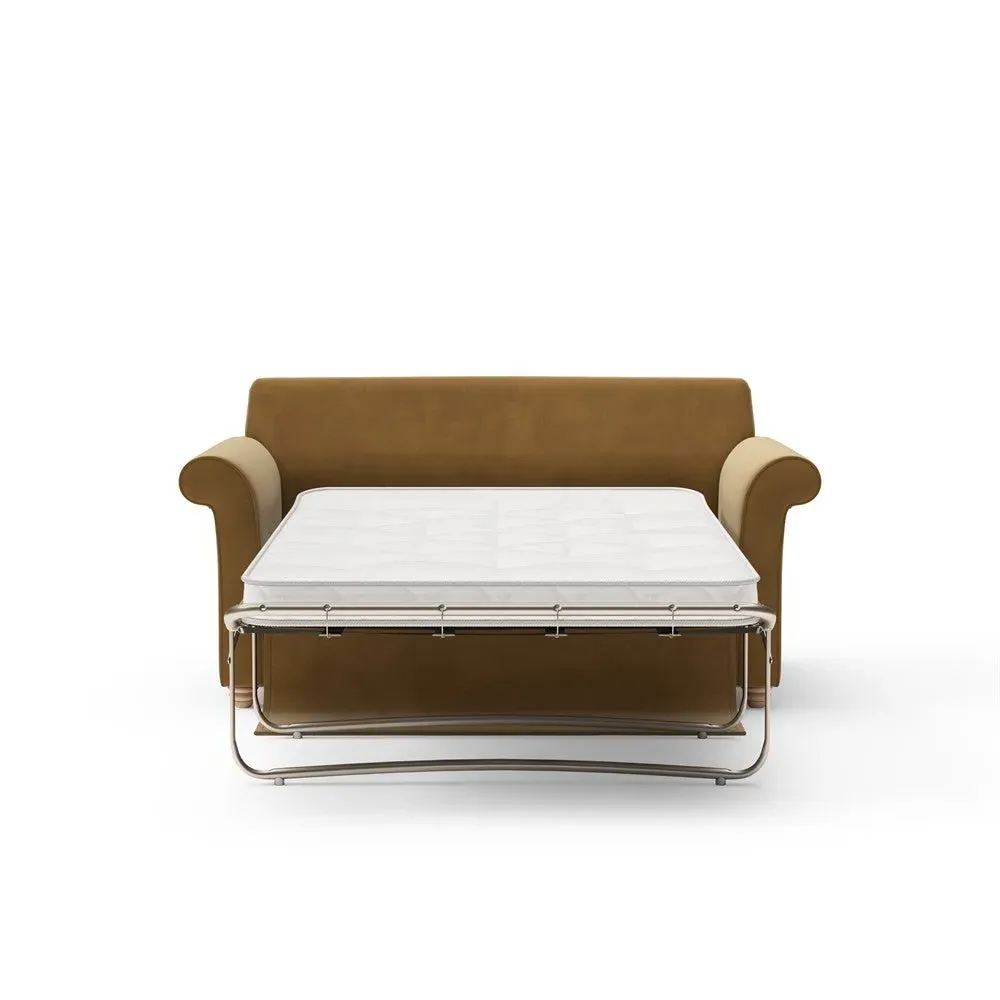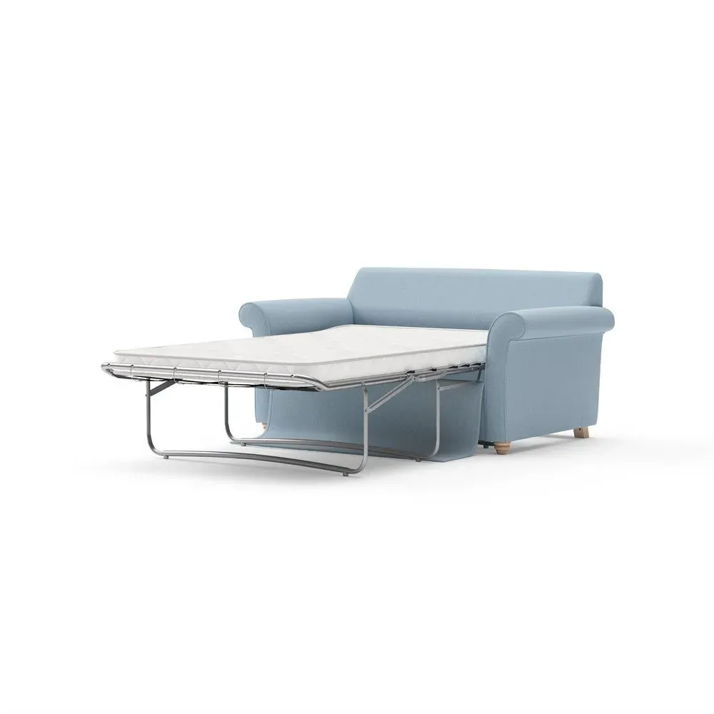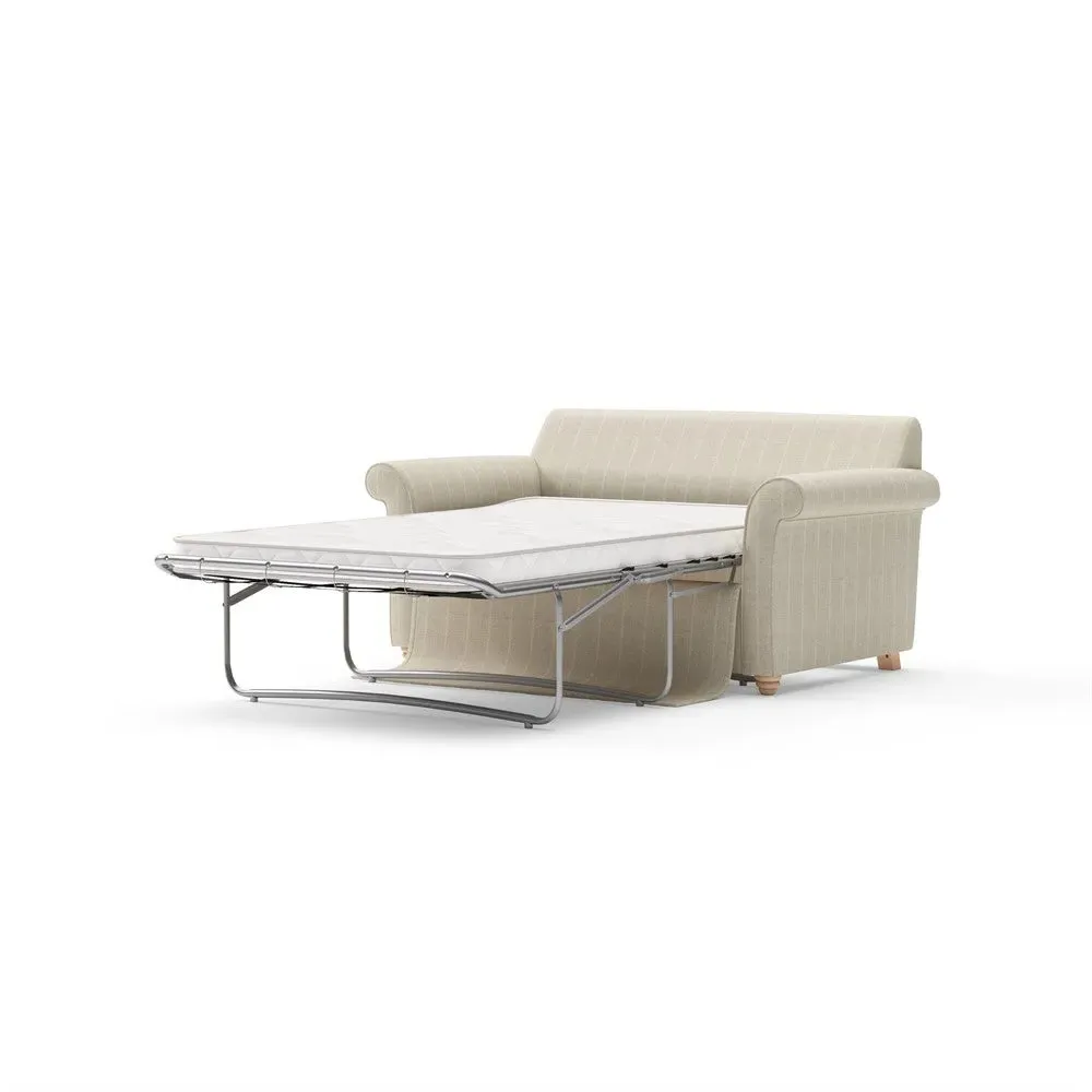 The sofa bed offers comfortable seating and sleeping with its tall, scrolled arms and deep seat cushions that provide a comforting embrace. Its beautifully turned feet add character to the design, while the construction accommodates both luxurious feather and low maintenance interior options. The dual functionality suits versatile living spaces, and the sturdy frame ensures lasting durability.