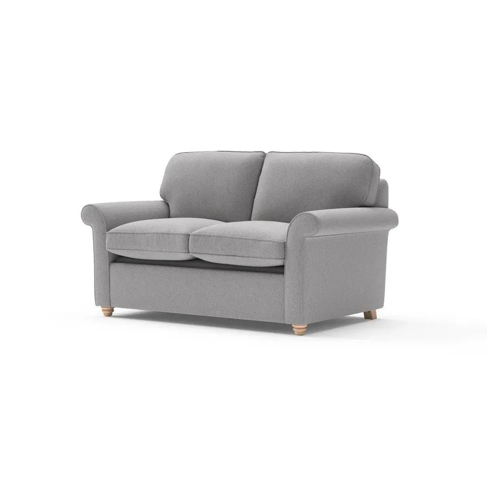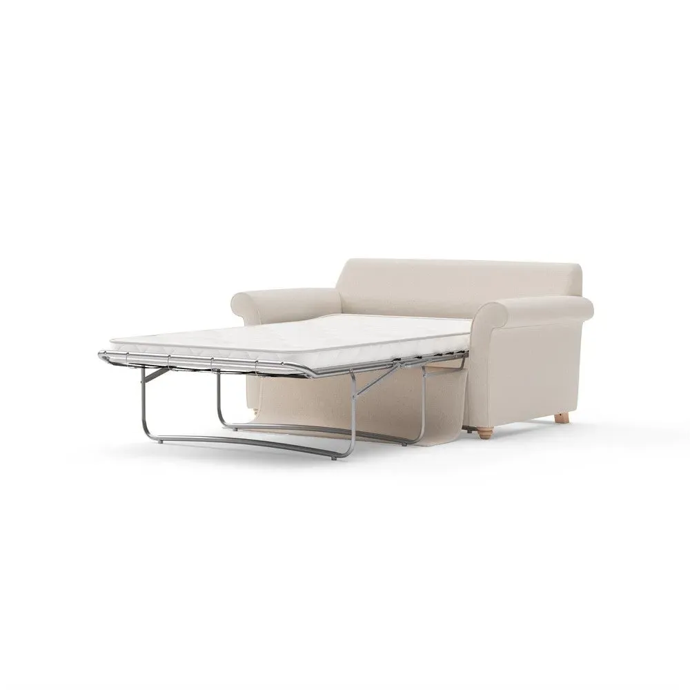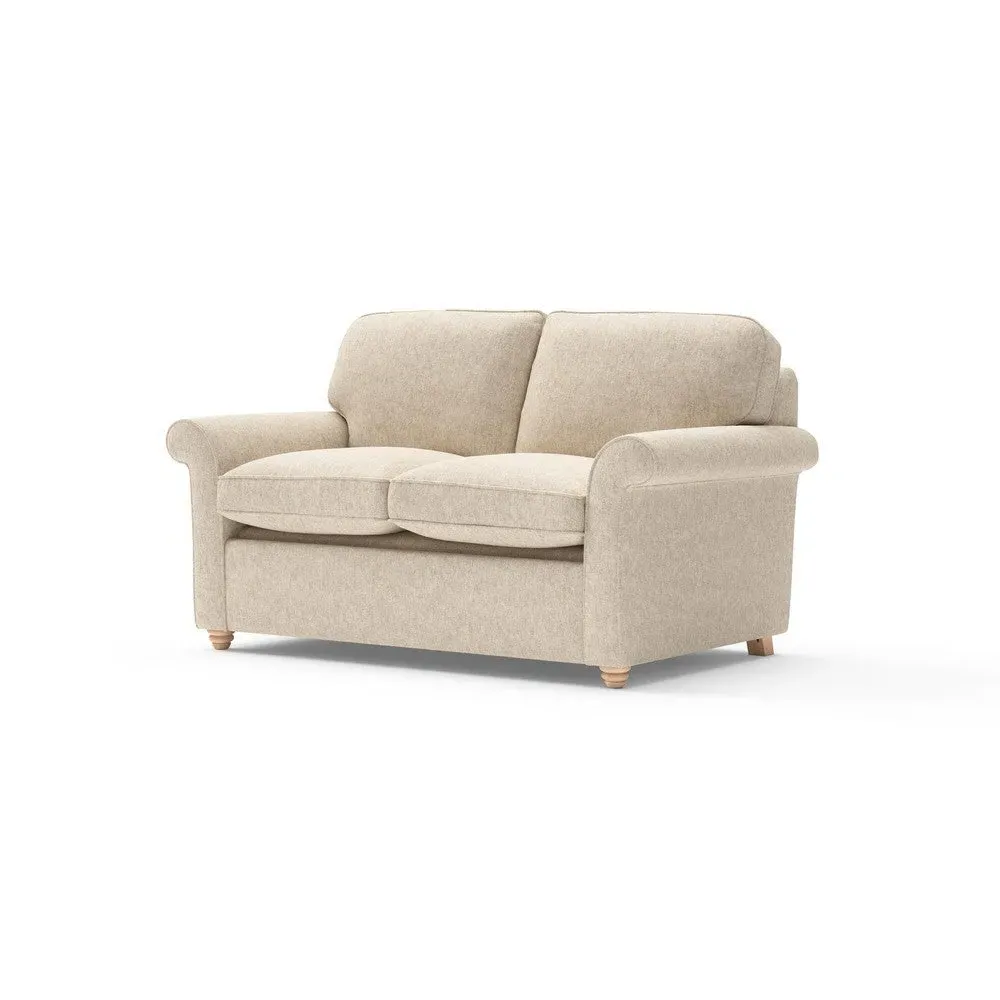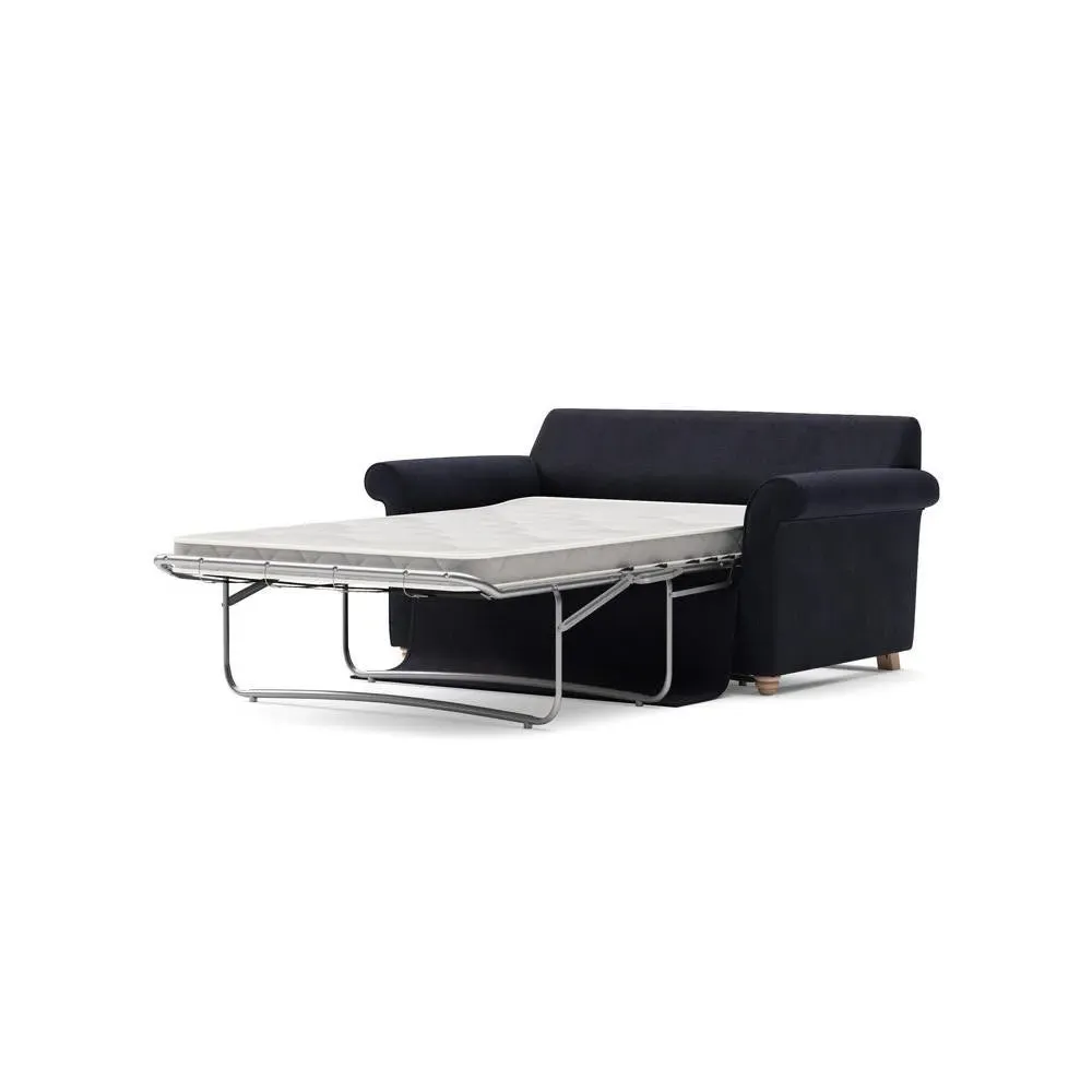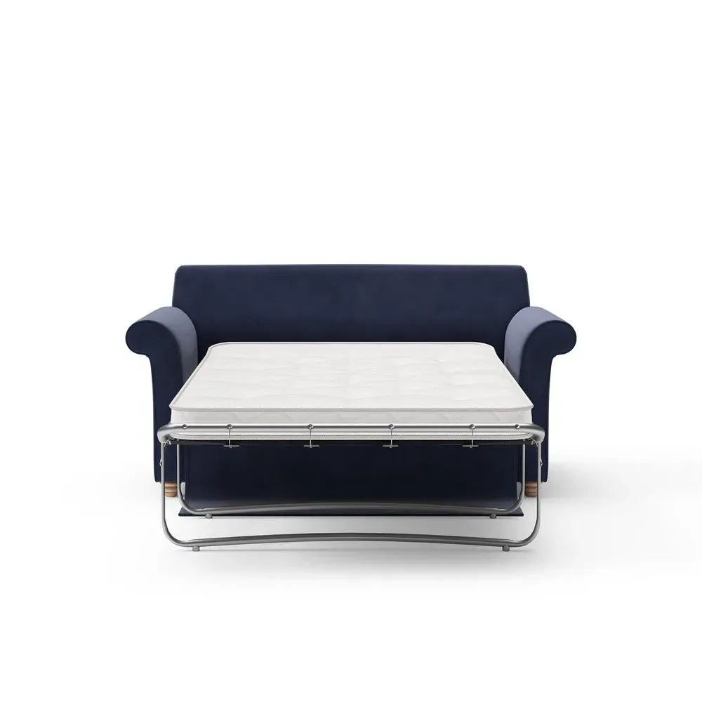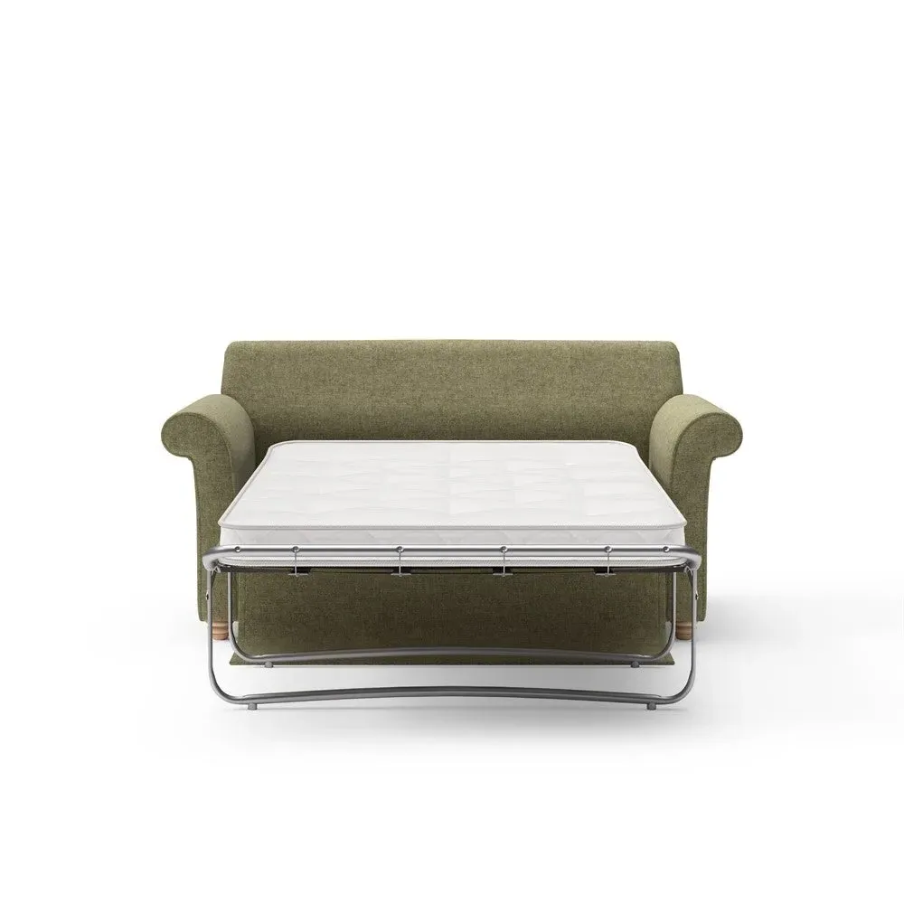 The sofa bed offers comfortable seating and sleeping with its tall, scrolled arms and deep seat cushions that provide a comforting embrace. Its beautifully turned feet add character to the design, while the construction accommodates both luxurious feather and low maintenance interior options. The dual functionality suits versatile living spaces, and the sturdy frame ensures lasting durability.