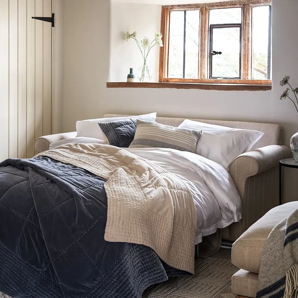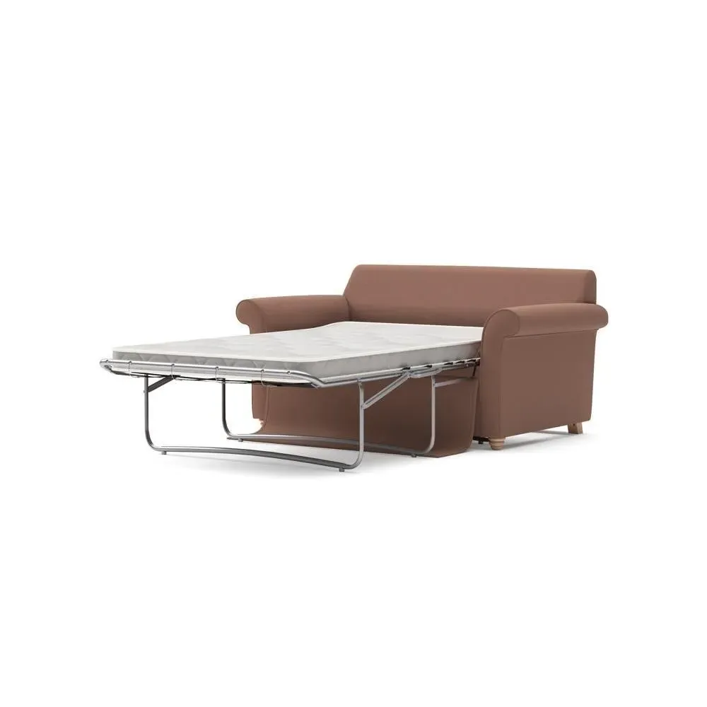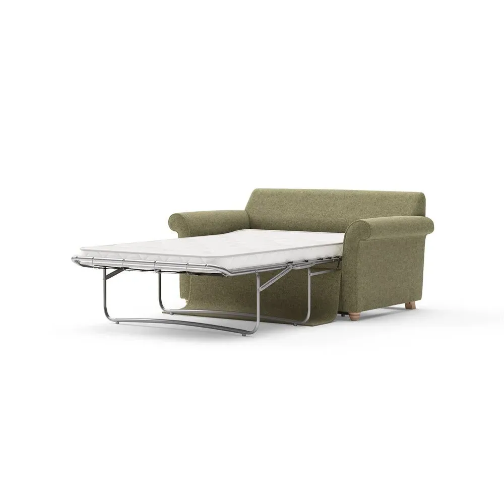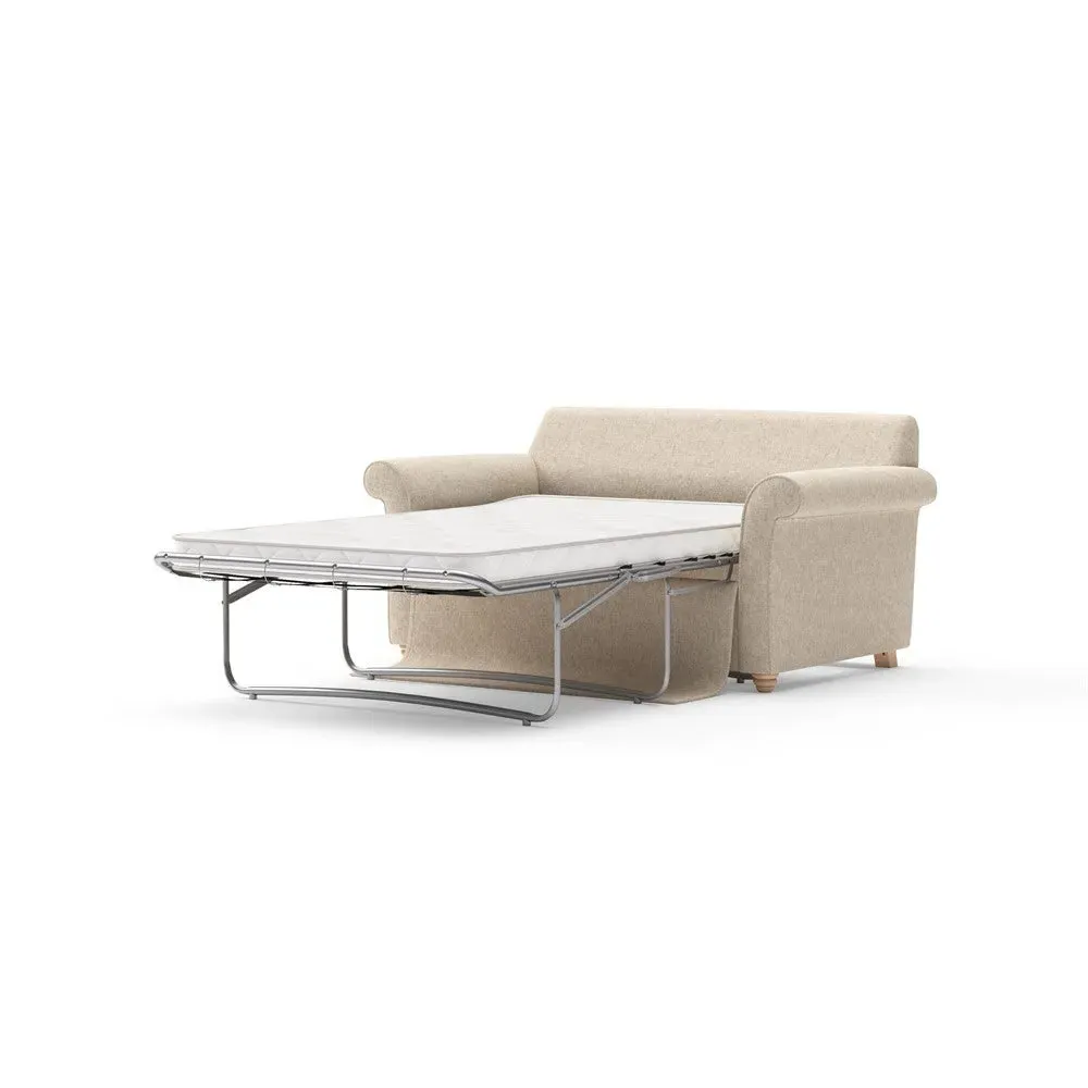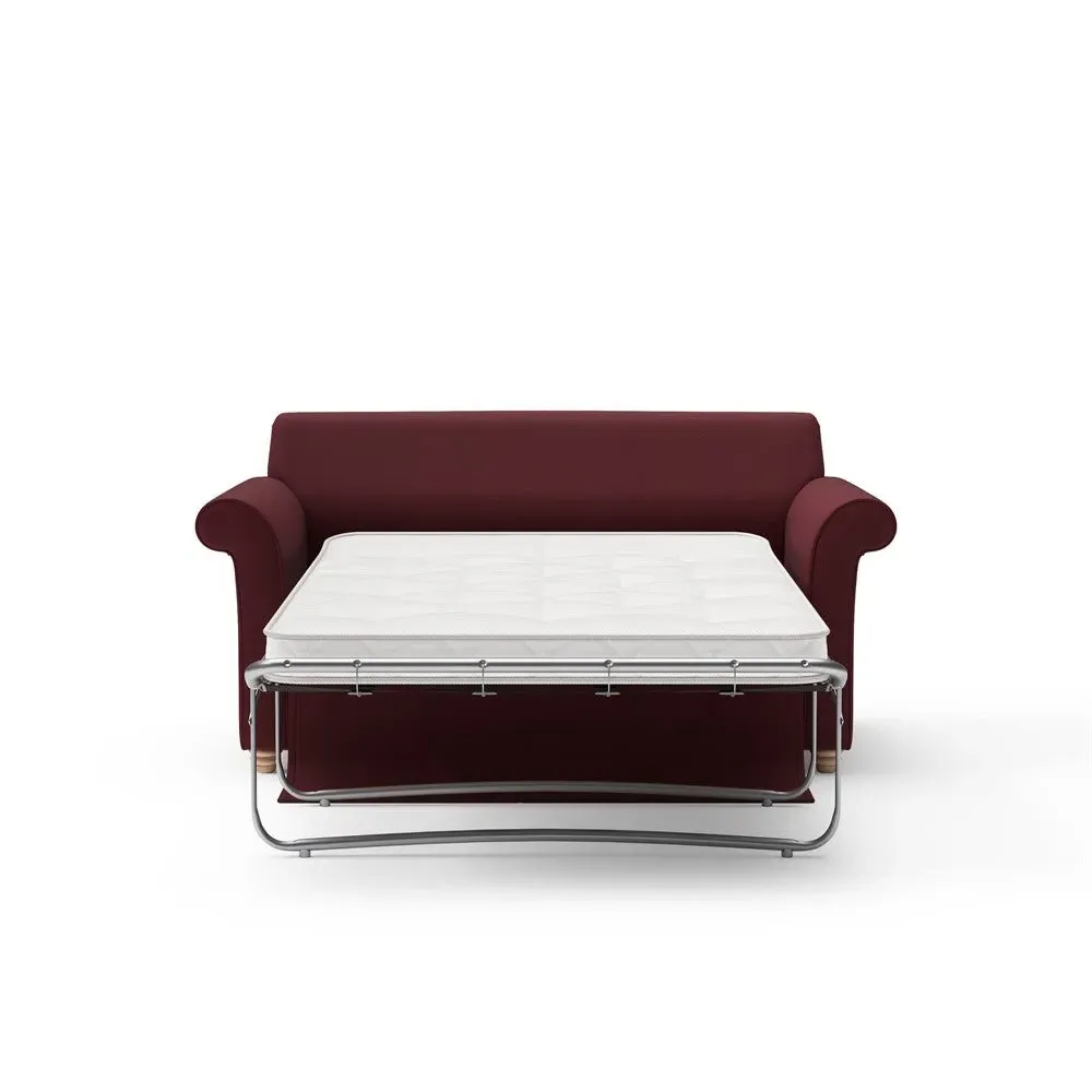 The sofa bed offers comfortable seating and sleeping with its tall, scrolled arms and deep seat cushions that provide a comforting embrace. Its beautifully turned feet add character to the design, while the construction accommodates both luxurious feather and low maintenance interior options. The dual functionality suits versatile living spaces, and the sturdy frame ensures lasting durability.