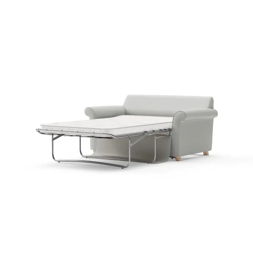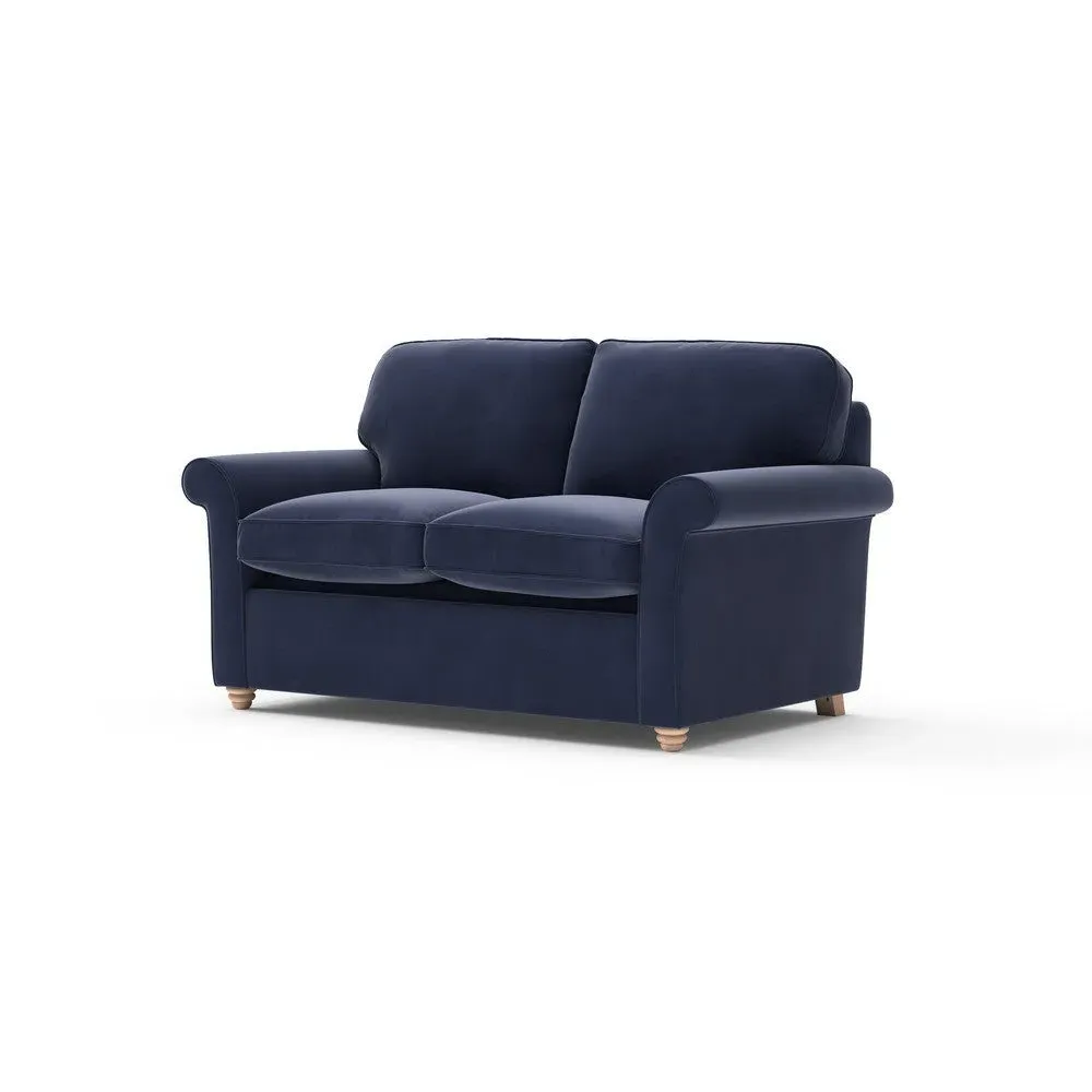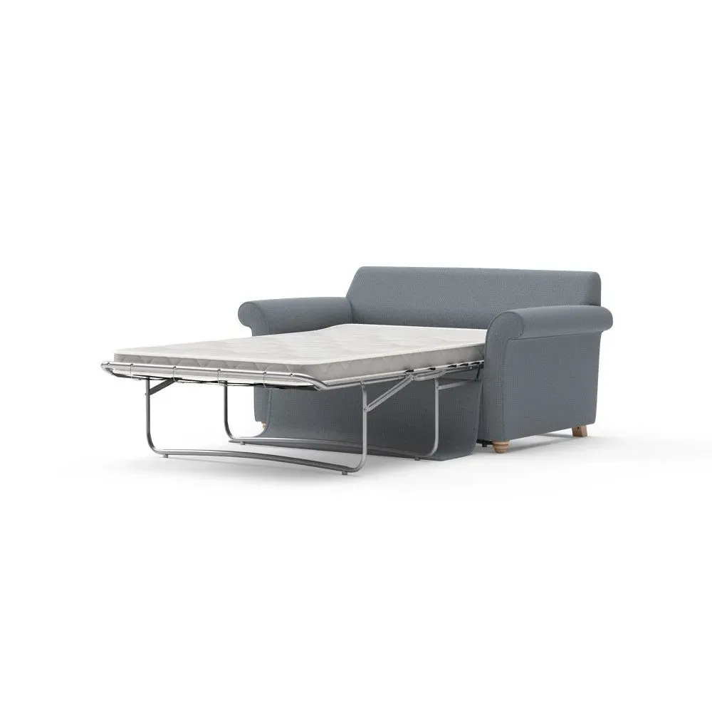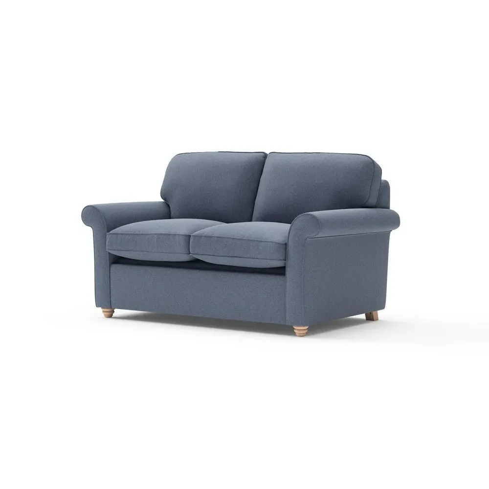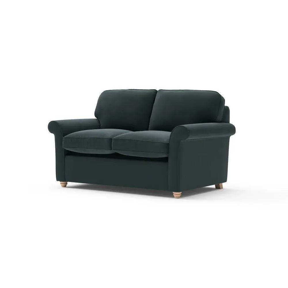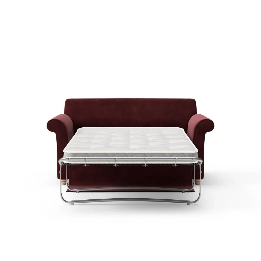 The sofa bed offers comfortable seating and sleeping with its tall, scrolled arms and deep seat cushions that provide a comforting embrace. Its beautifully turned feet add character to the design, while the construction accommodates both luxurious feather and low maintenance interior options. The dual functionality suits versatile living spaces, and the sturdy frame ensures lasting durability.