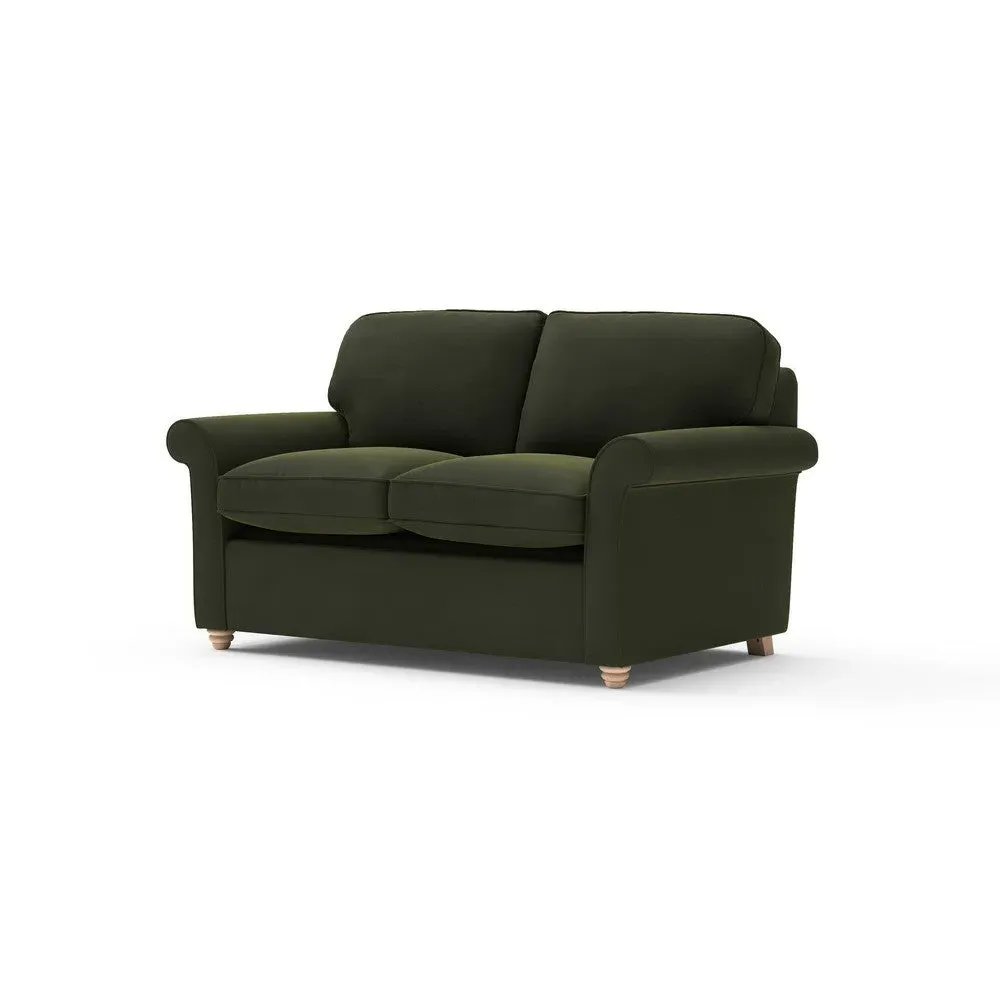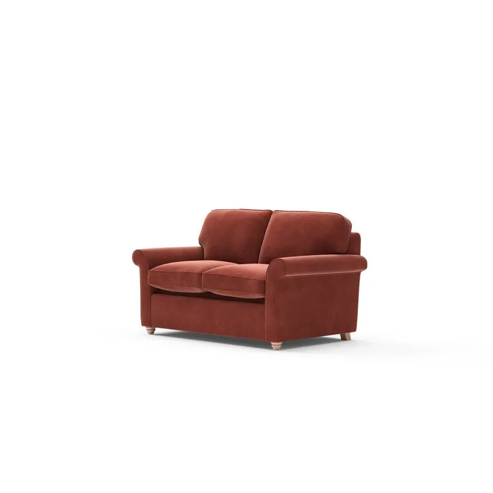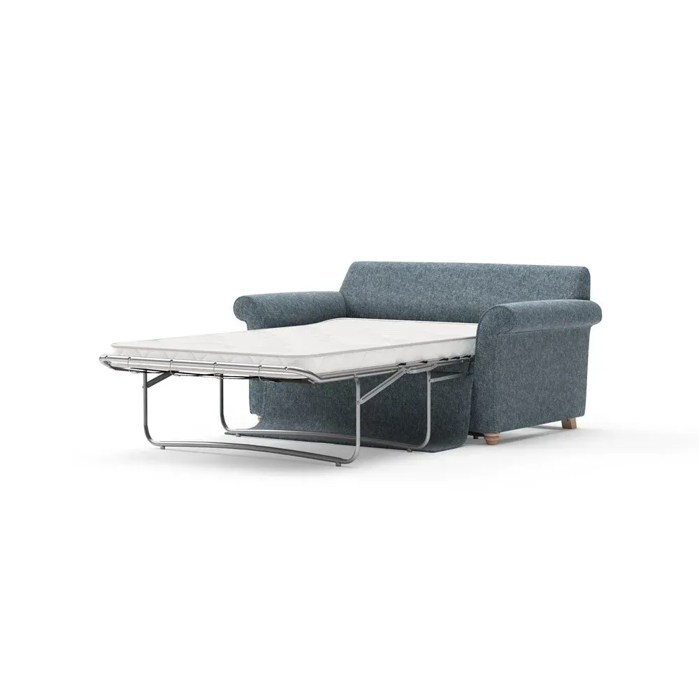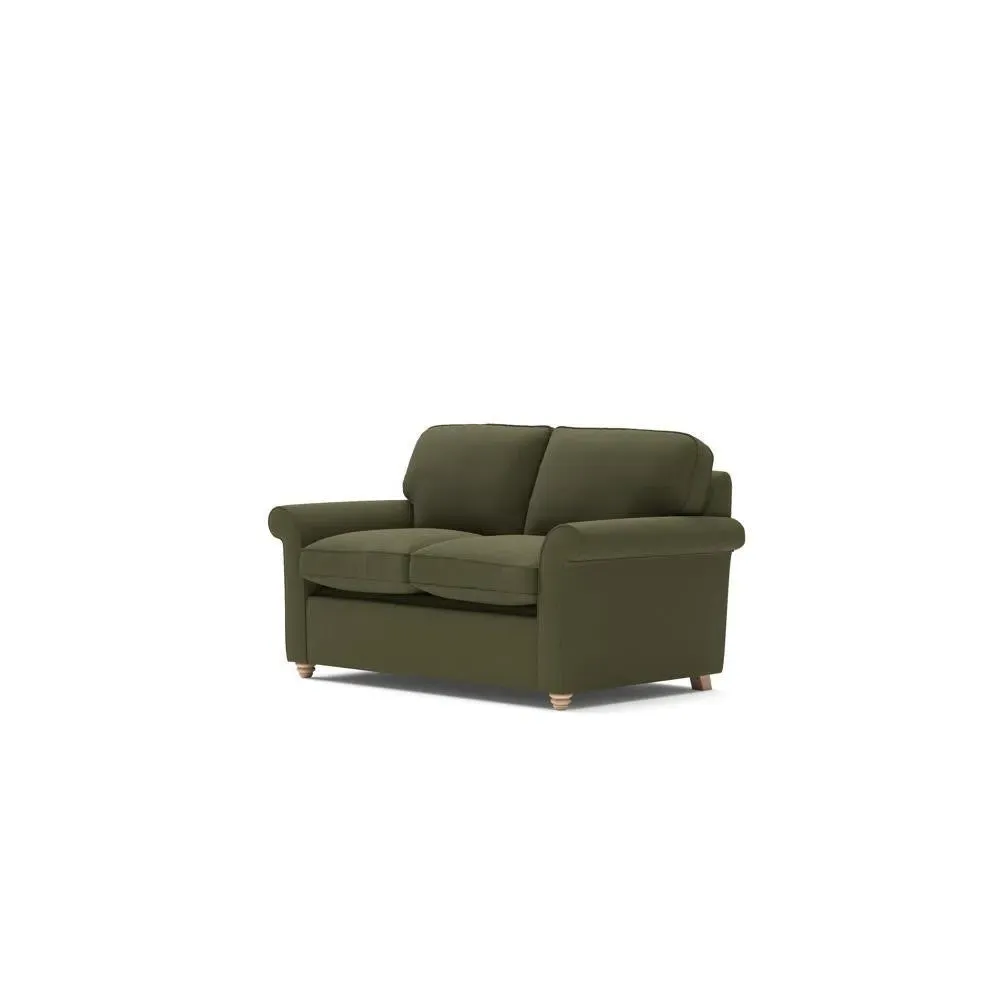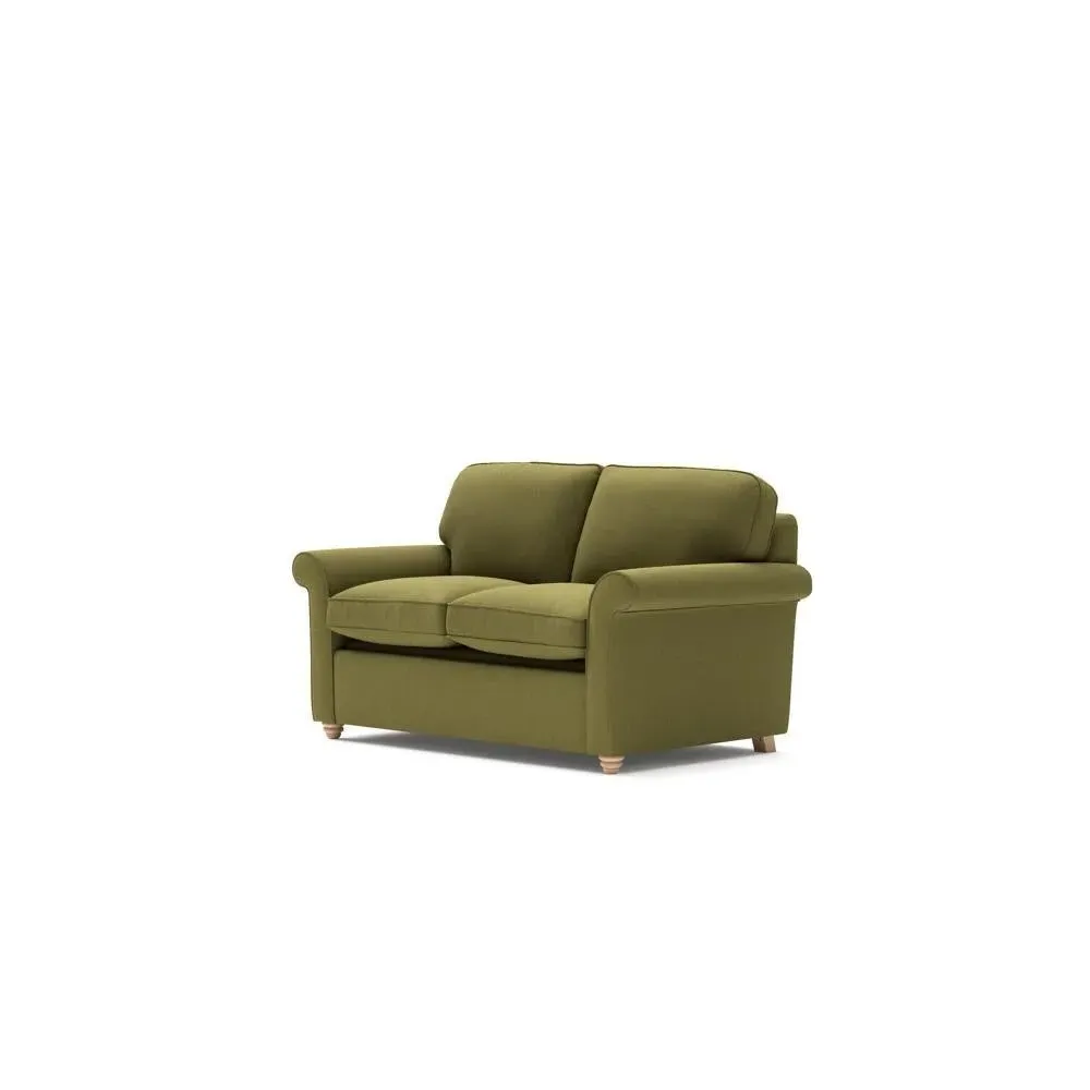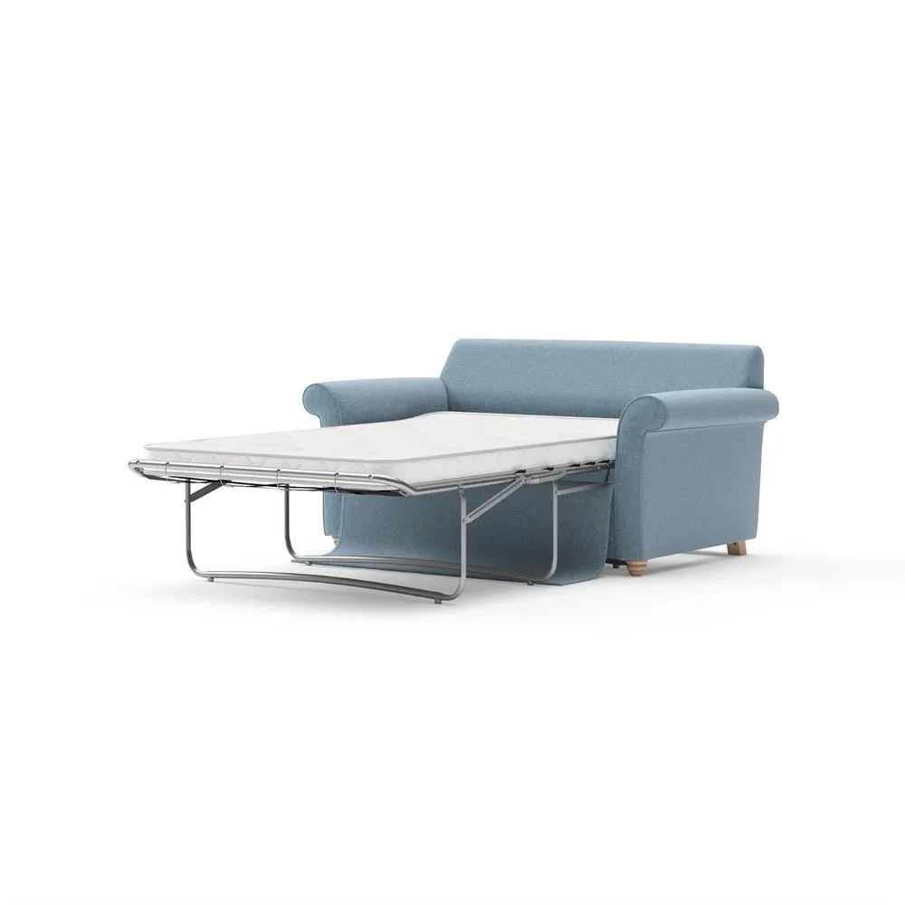 The sofa bed offers comfortable seating and sleeping with its tall, scrolled arms and deep seat cushions that provide a comforting embrace. Its beautifully turned feet add character to the design, while the construction accommodates both luxurious feather and low maintenance interior options. The dual functionality suits versatile living spaces, and the sturdy frame ensures lasting durability.