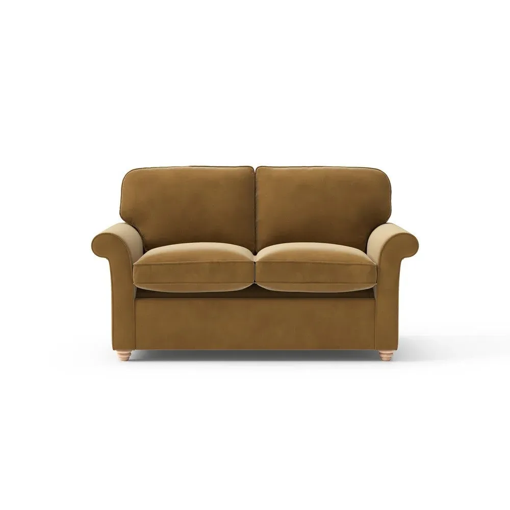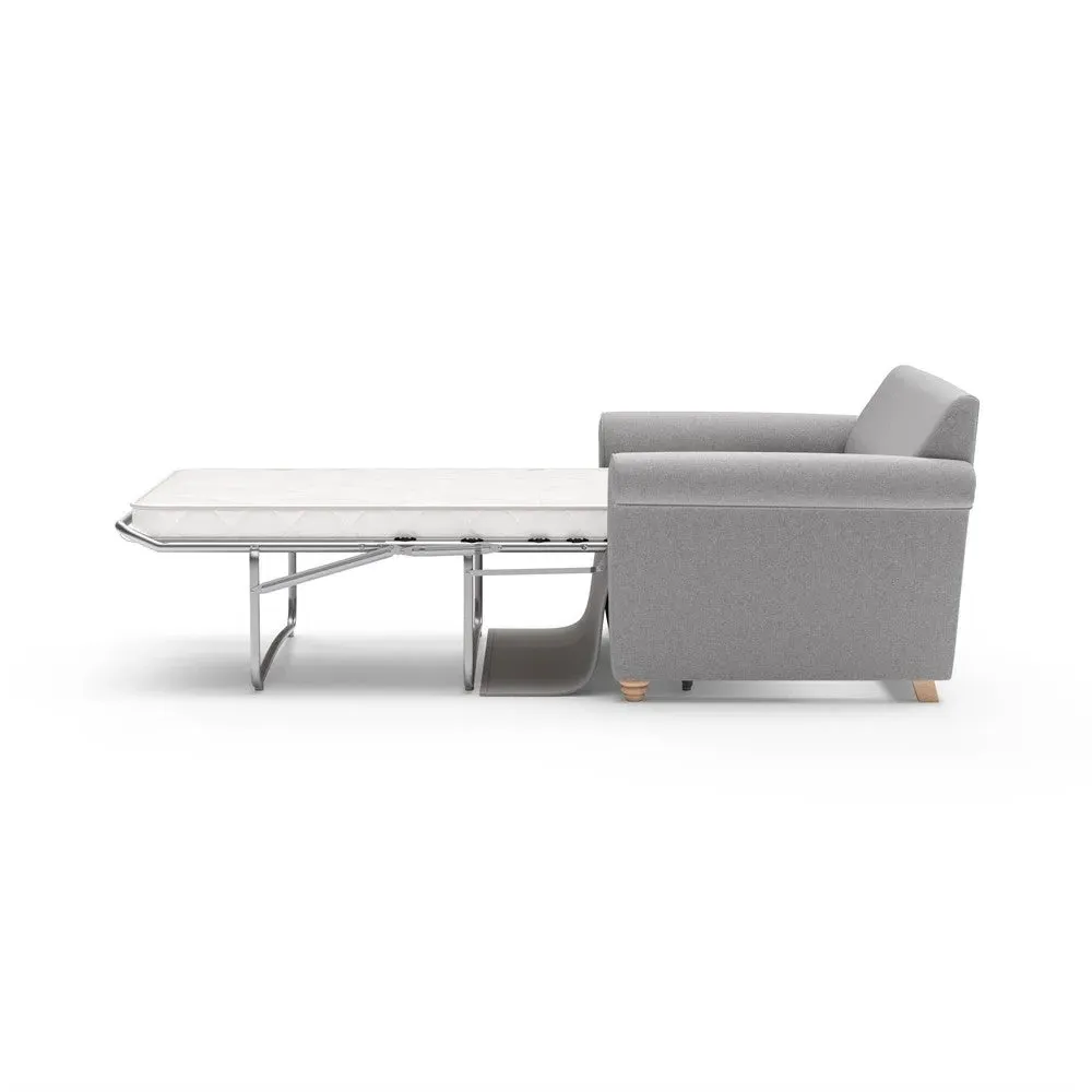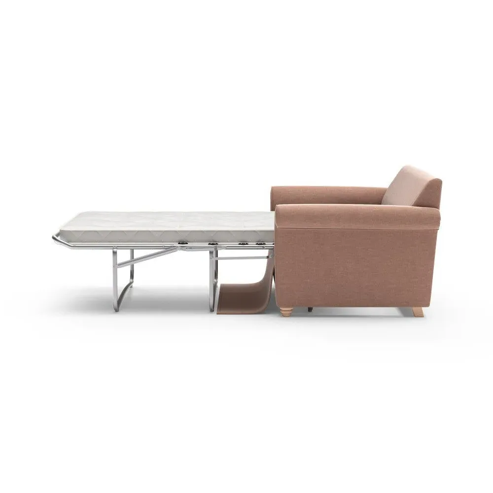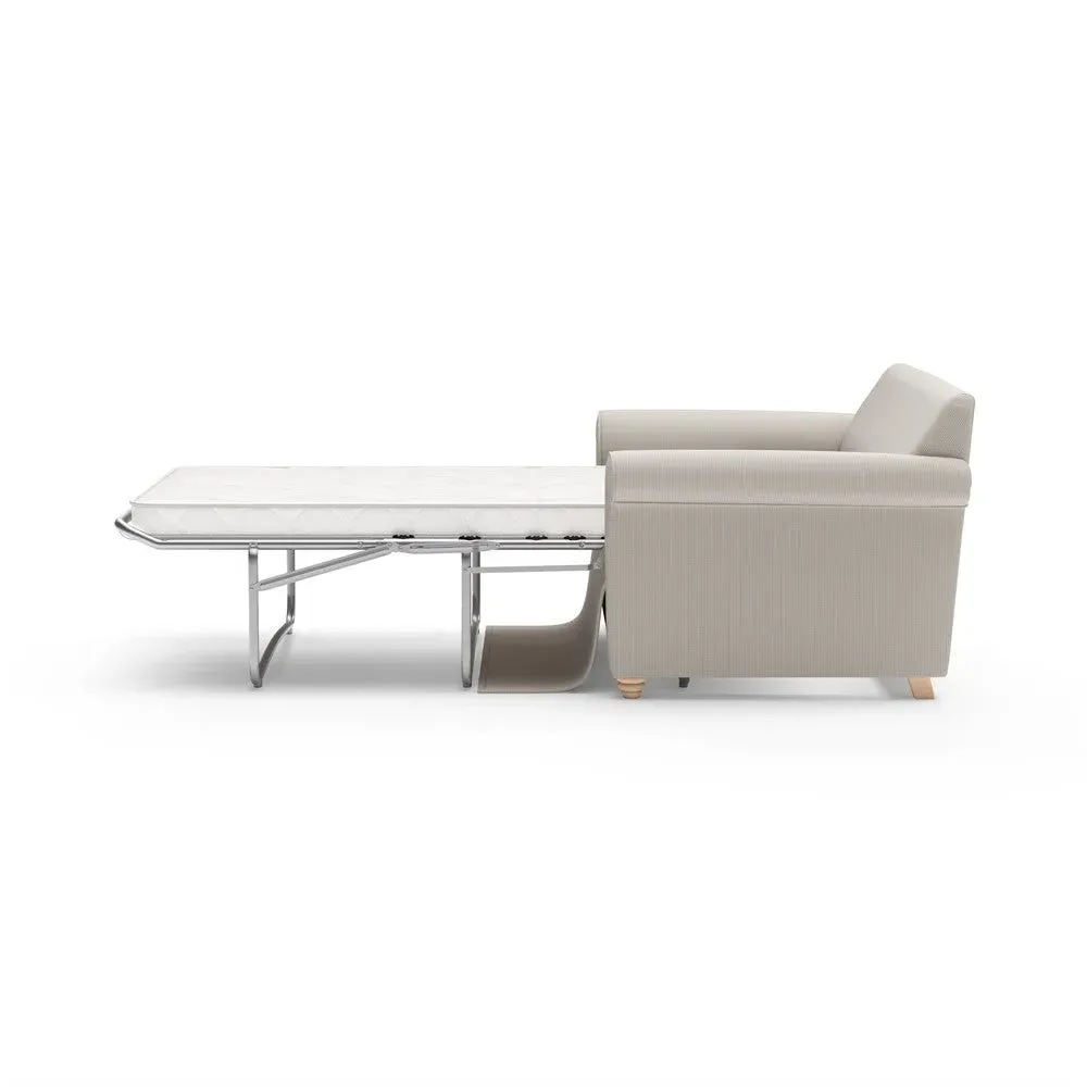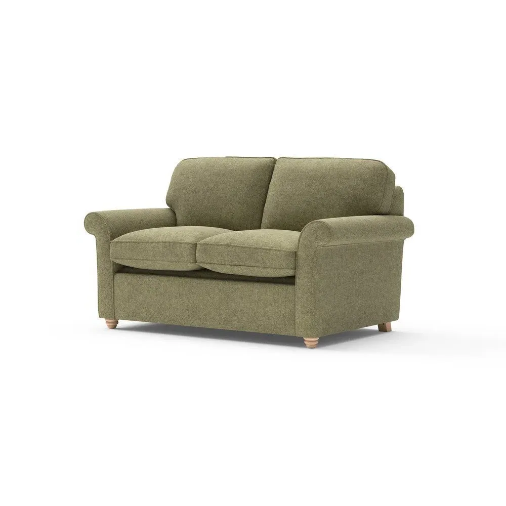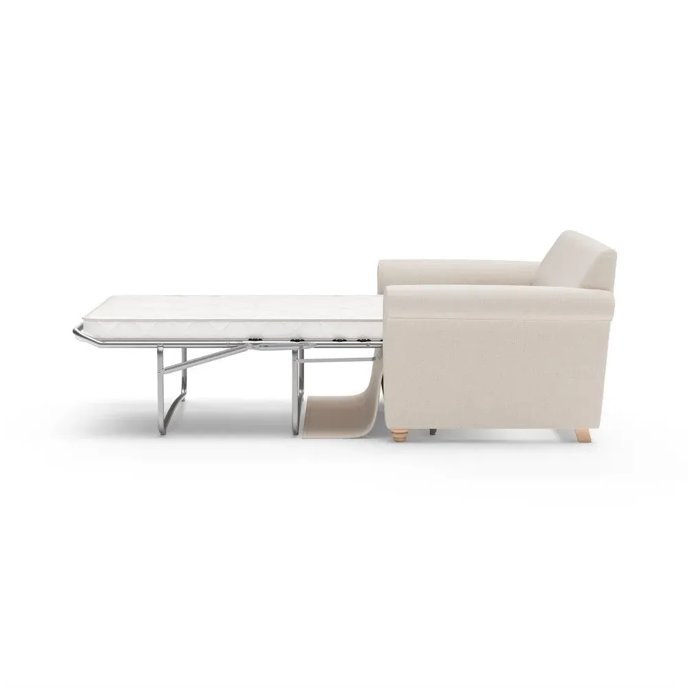The sofa bed offers comfortable seating and sleeping with its tall, scrolled arms and deep seat cushions that provide a comforting embrace. Its beautifully turned feet add character to the design, while the construction accommodates both luxurious feather and low maintenance interior options. The dual functionality suits versatile living spaces, and the sturdy frame ensures lasting durability.