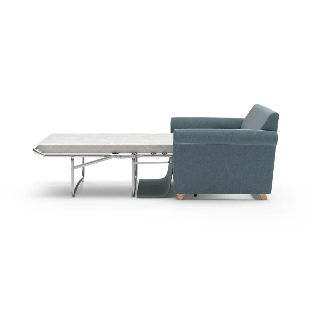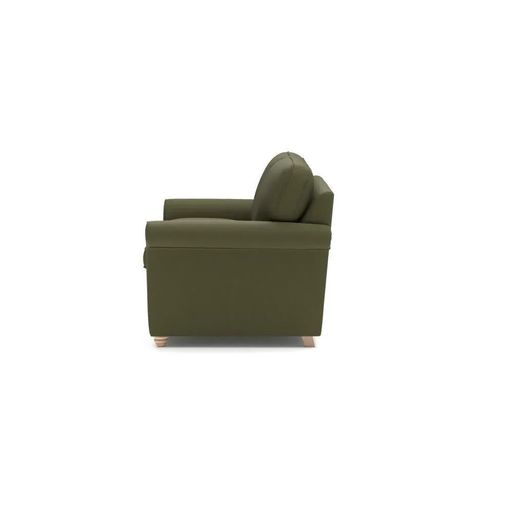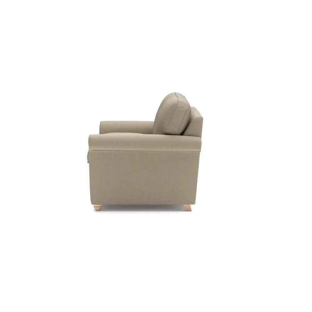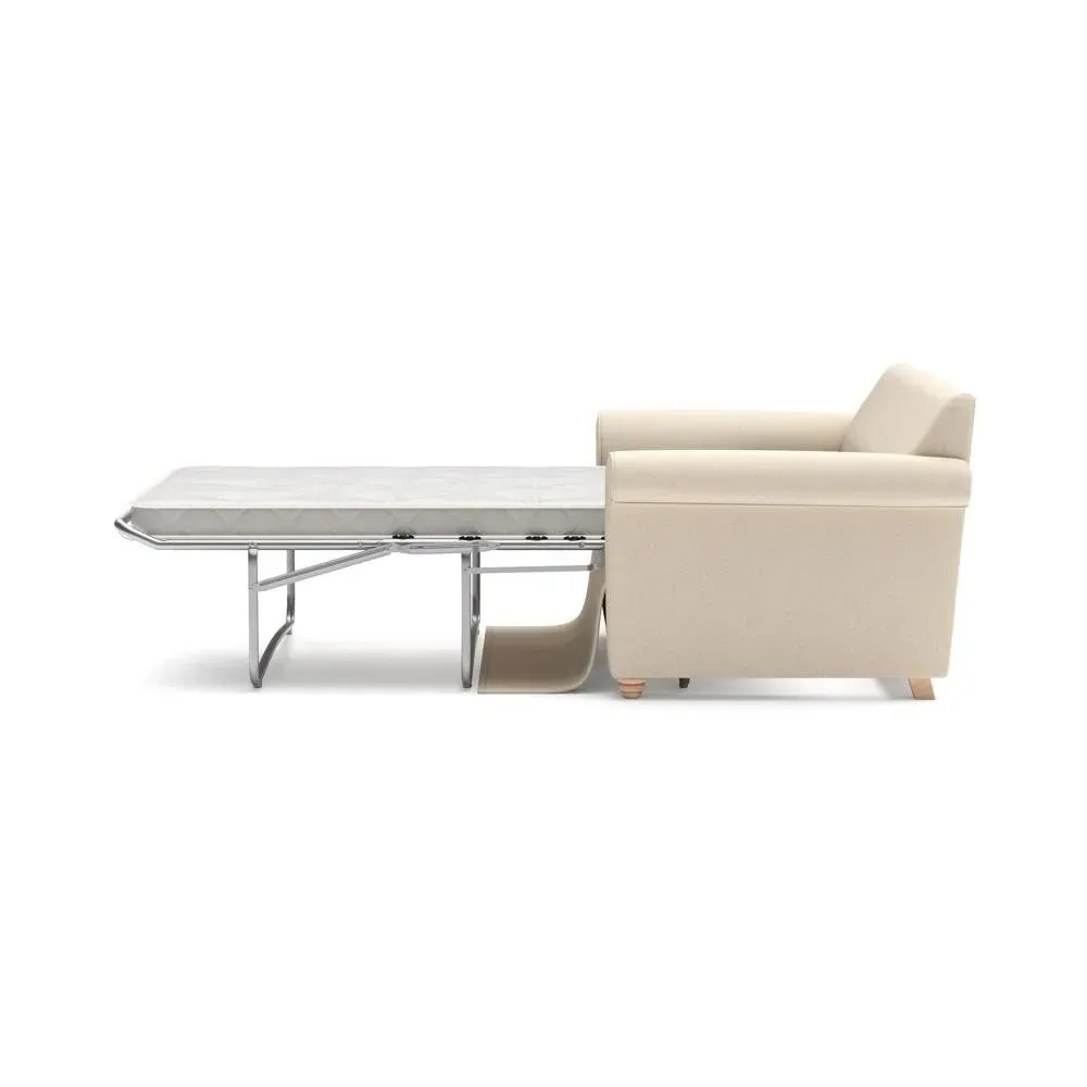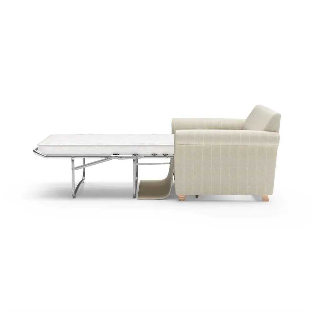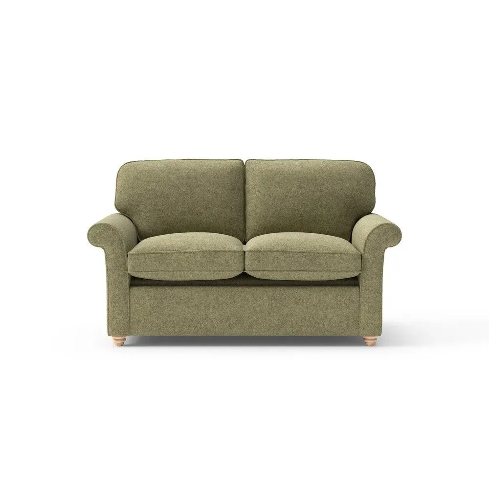 The sofa bed offers comfortable seating and sleeping with its tall, scrolled arms and deep seat cushions that provide a comforting embrace. Its beautifully turned feet add character to the design, while the construction accommodates both luxurious feather and low maintenance interior options. The dual functionality suits versatile living spaces, and the sturdy frame ensures lasting durability.