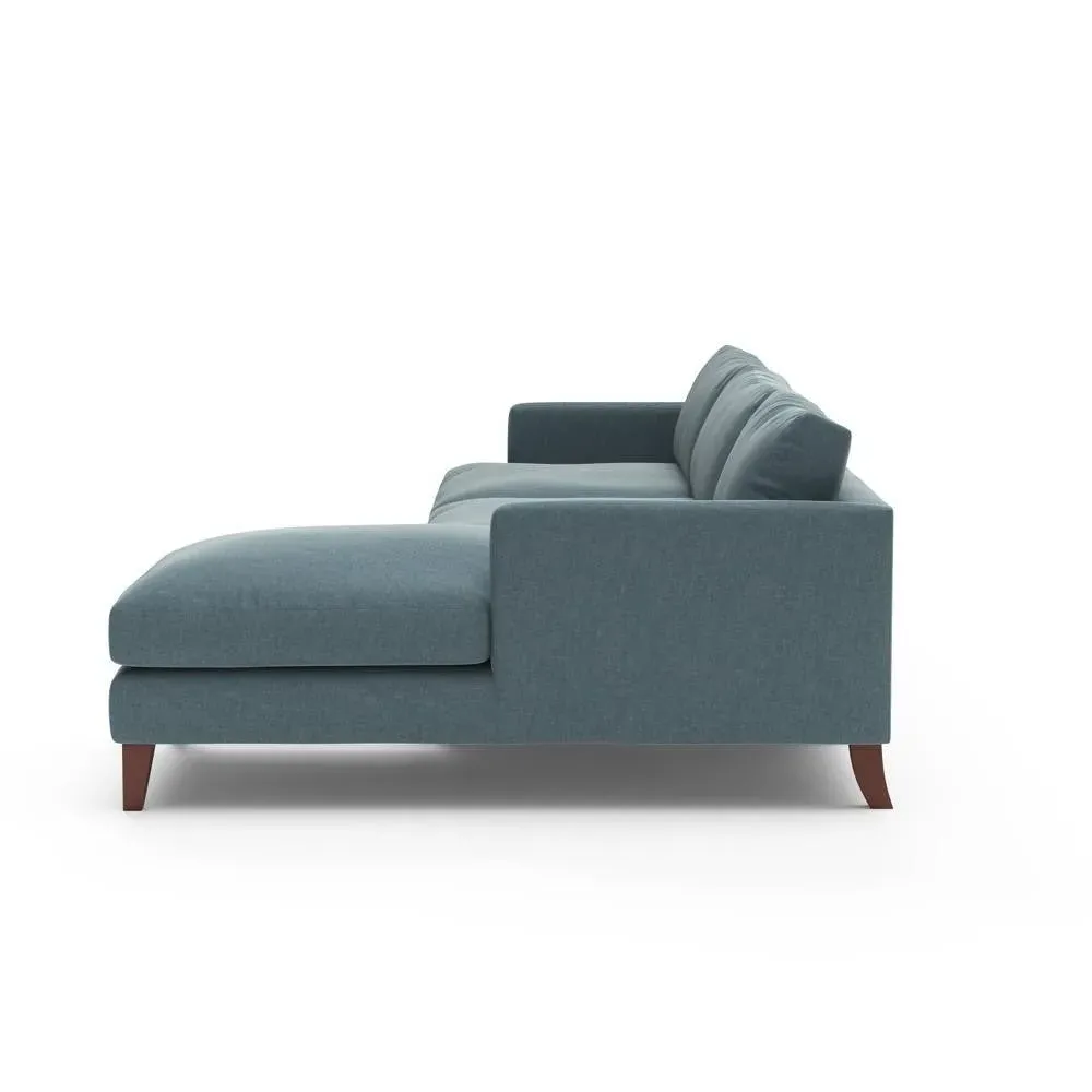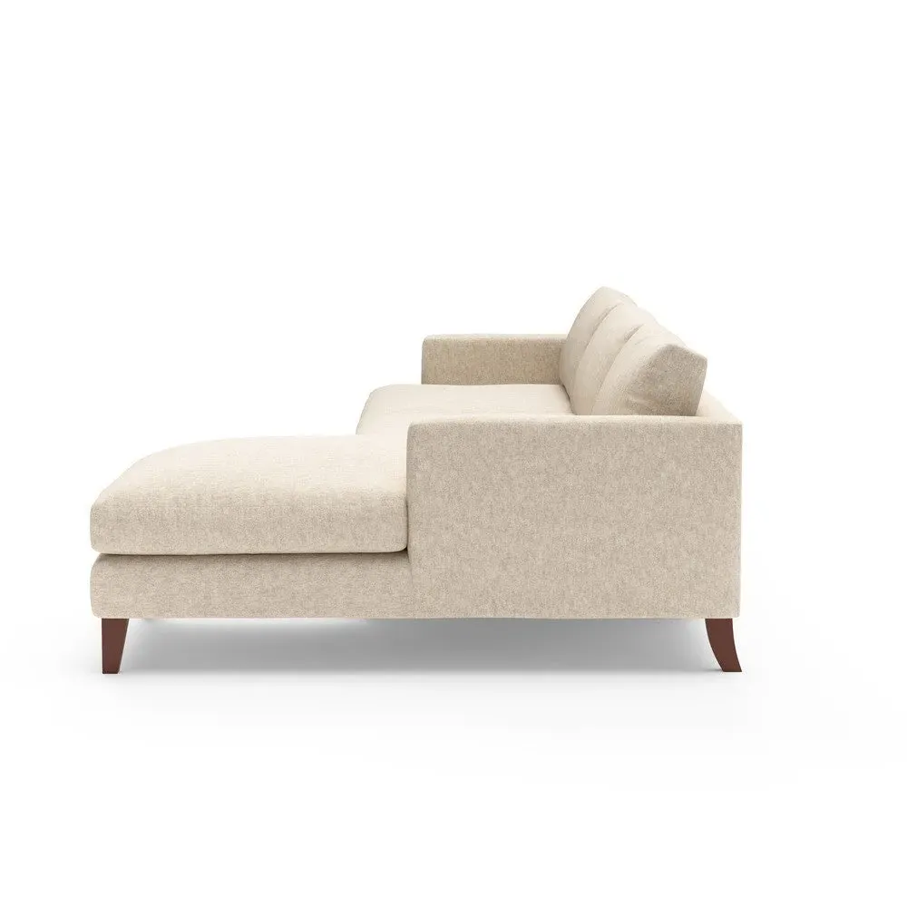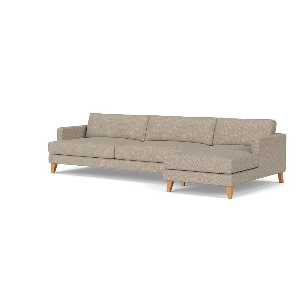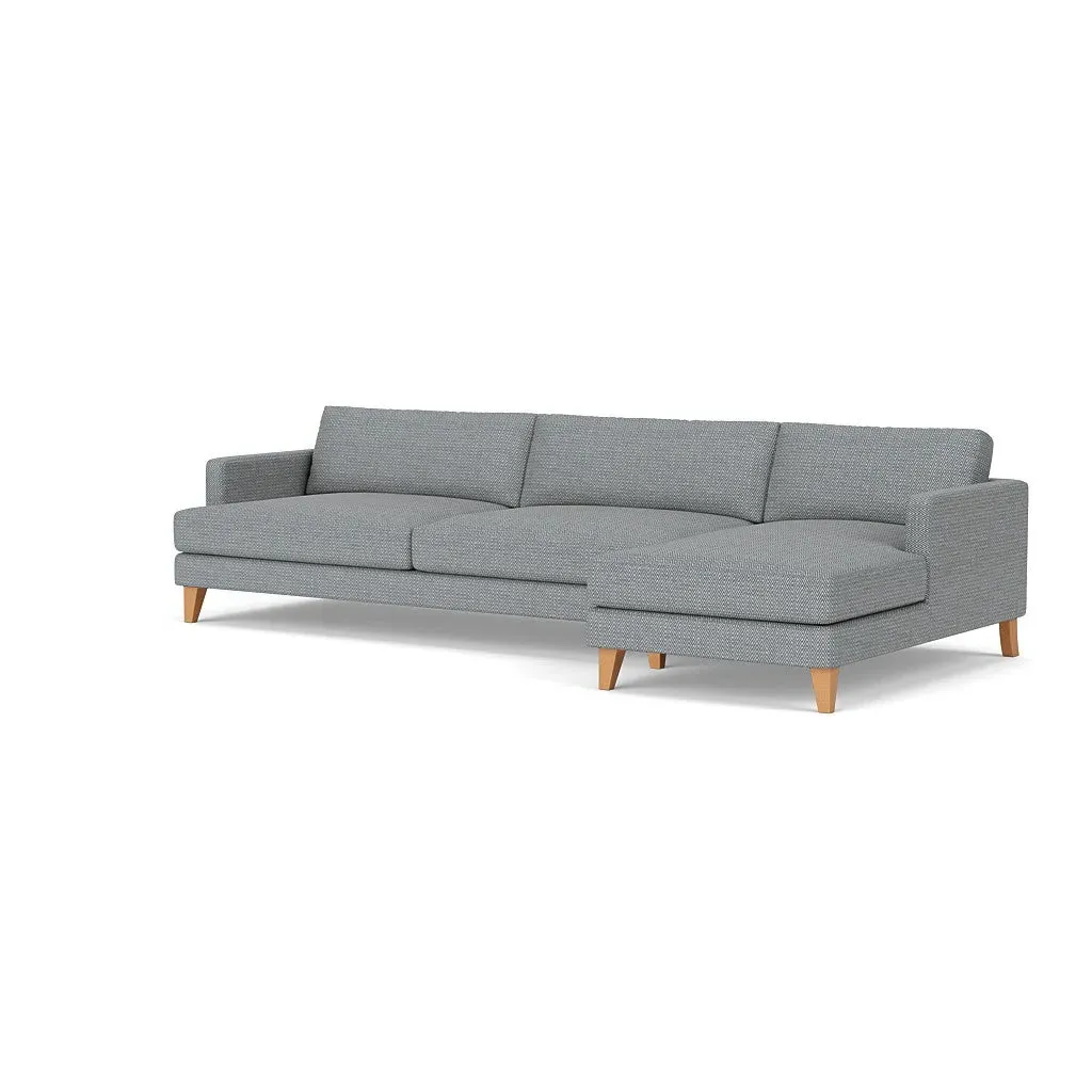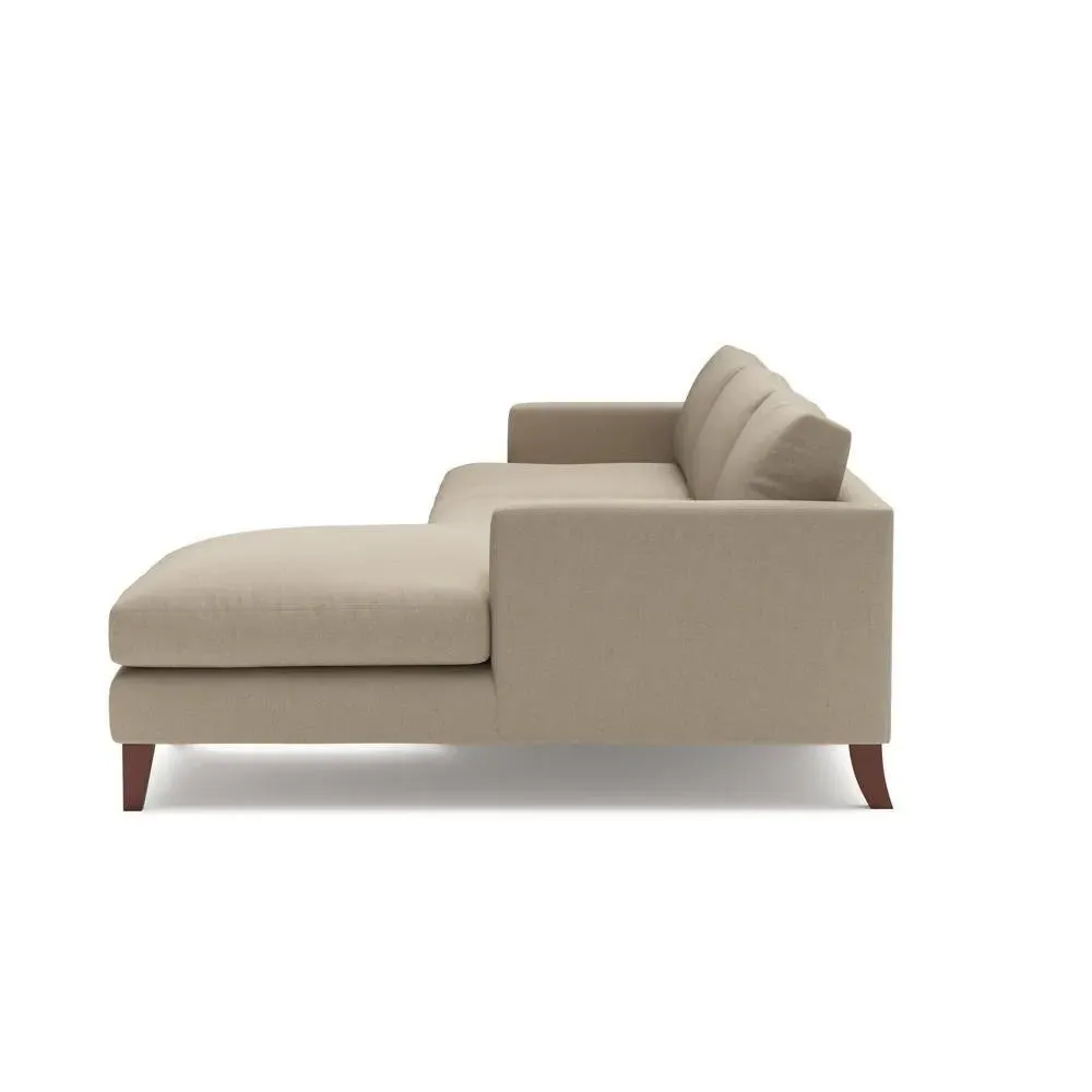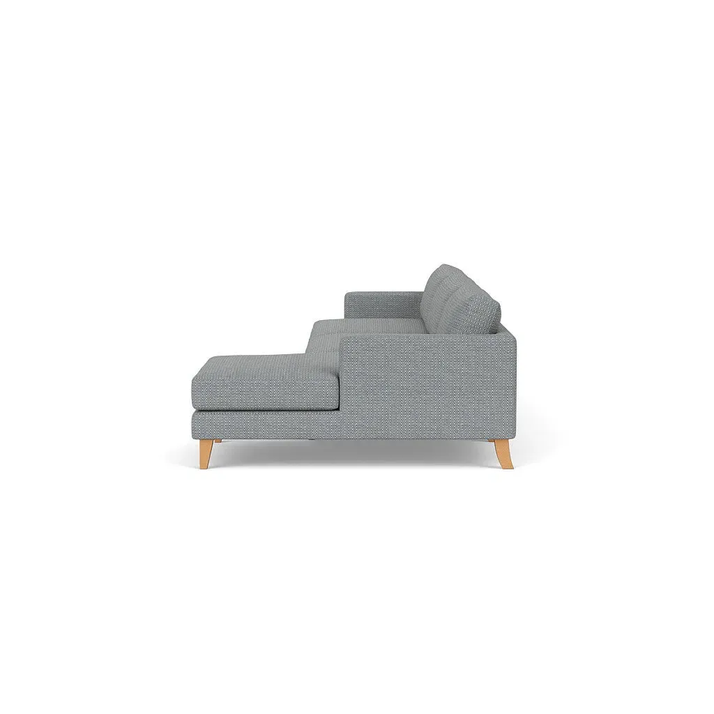 The chaise sofa offers lasting comfort with its smart, clean lines and tall arms. Its generous proportions provide ample seating space, while the house weave fabric adds texture and durability. The left-hand configuration suits various room layouts, and the tall arms ensure excellent support for relaxation.