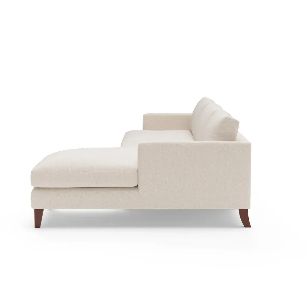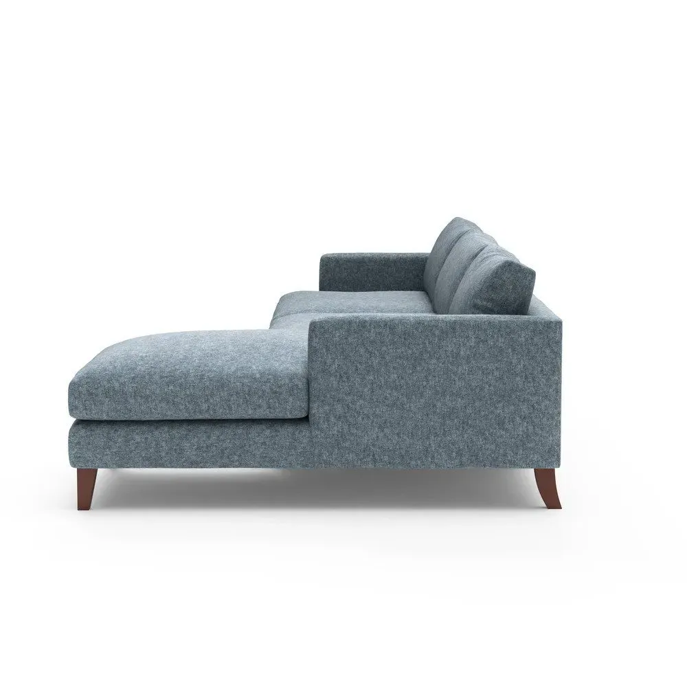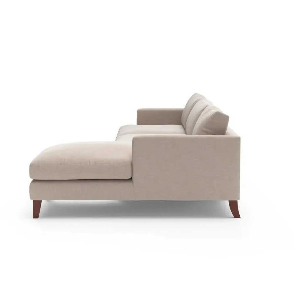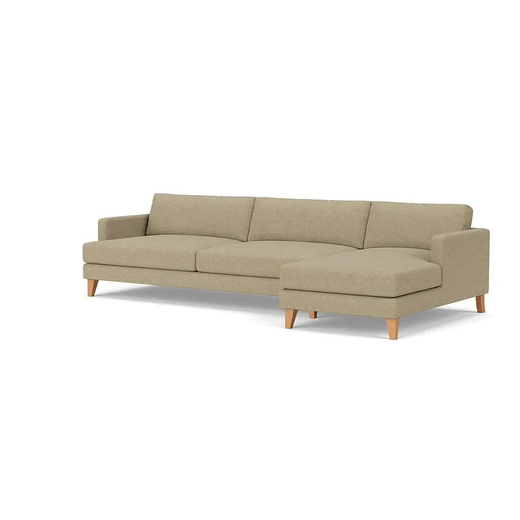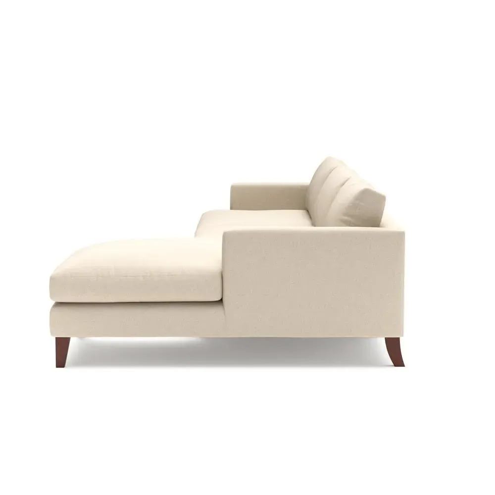 The chaise sofa offers lasting comfort with its smart, clean lines and tall arms. Its generous proportions provide ample seating space, while the house weave fabric adds texture and durability. The left-hand configuration suits various room layouts, and the tall arms ensure excellent support for relaxation.