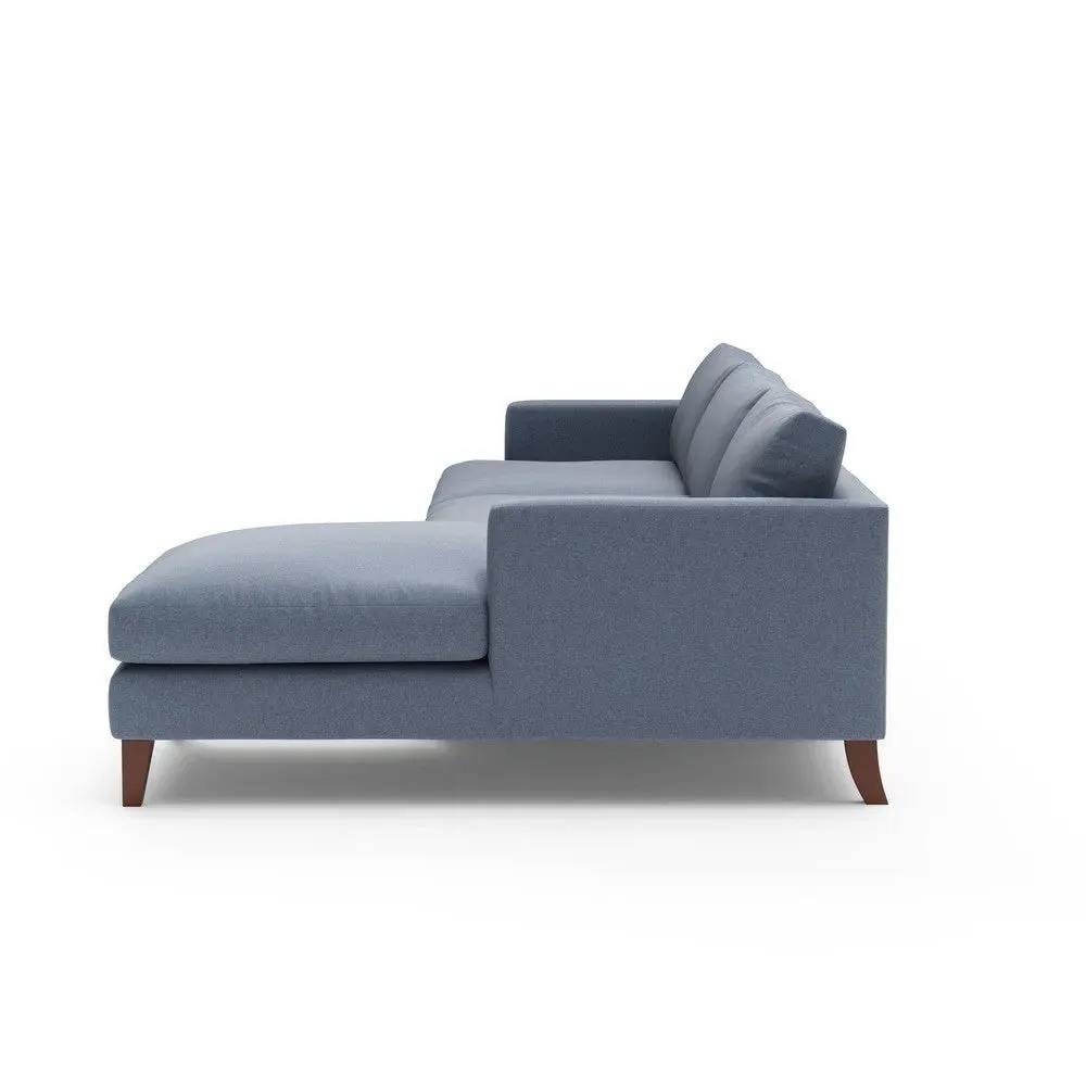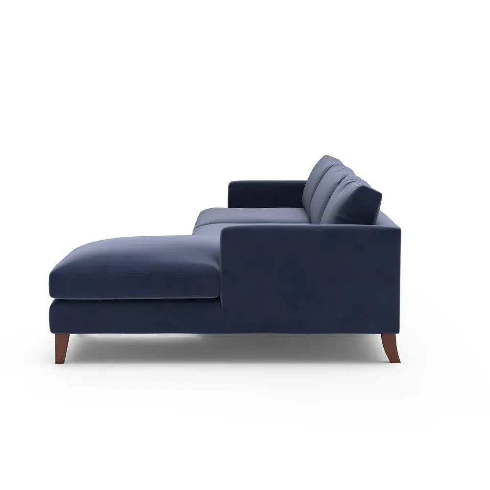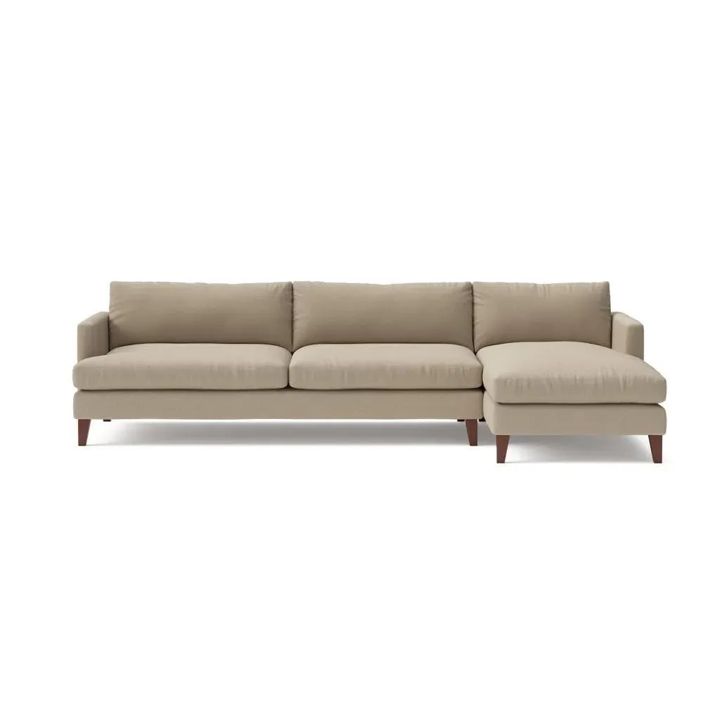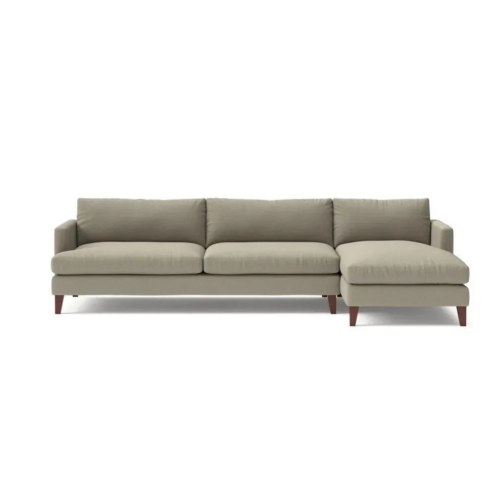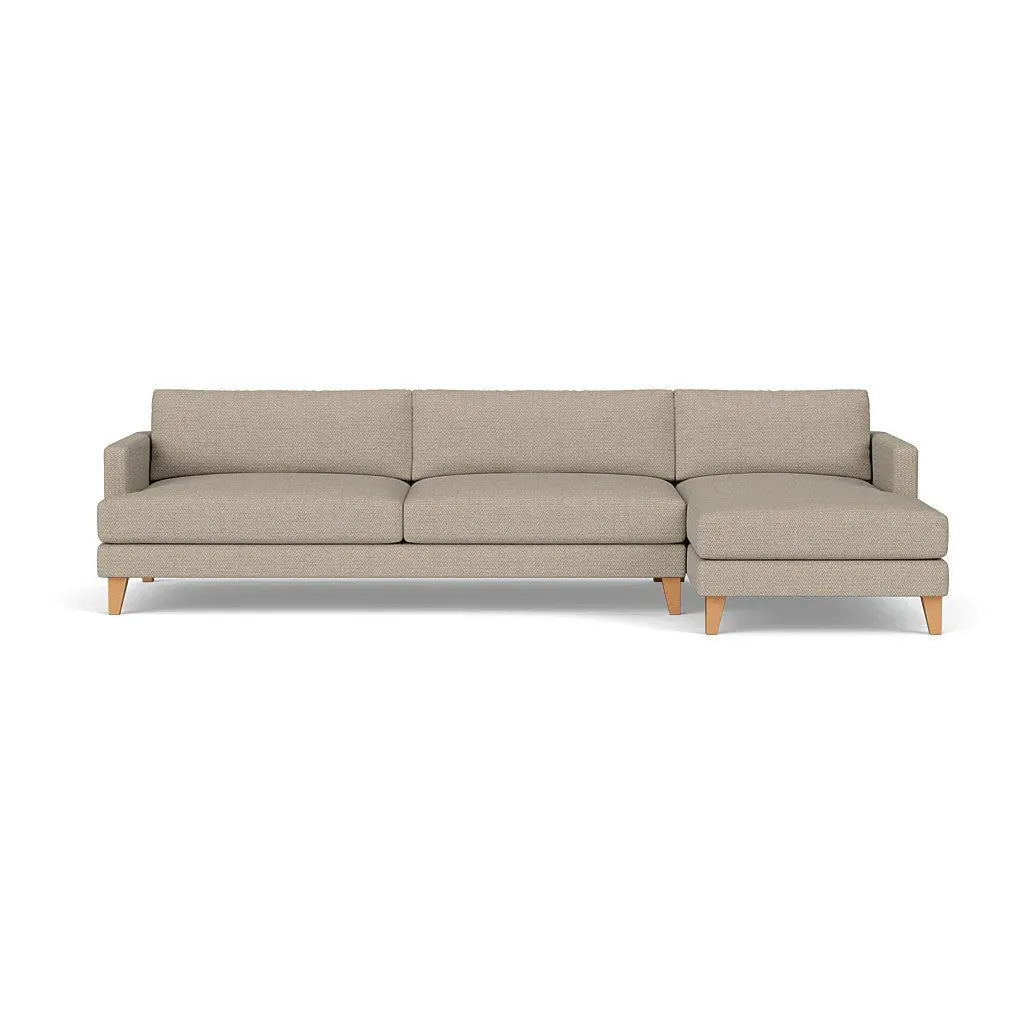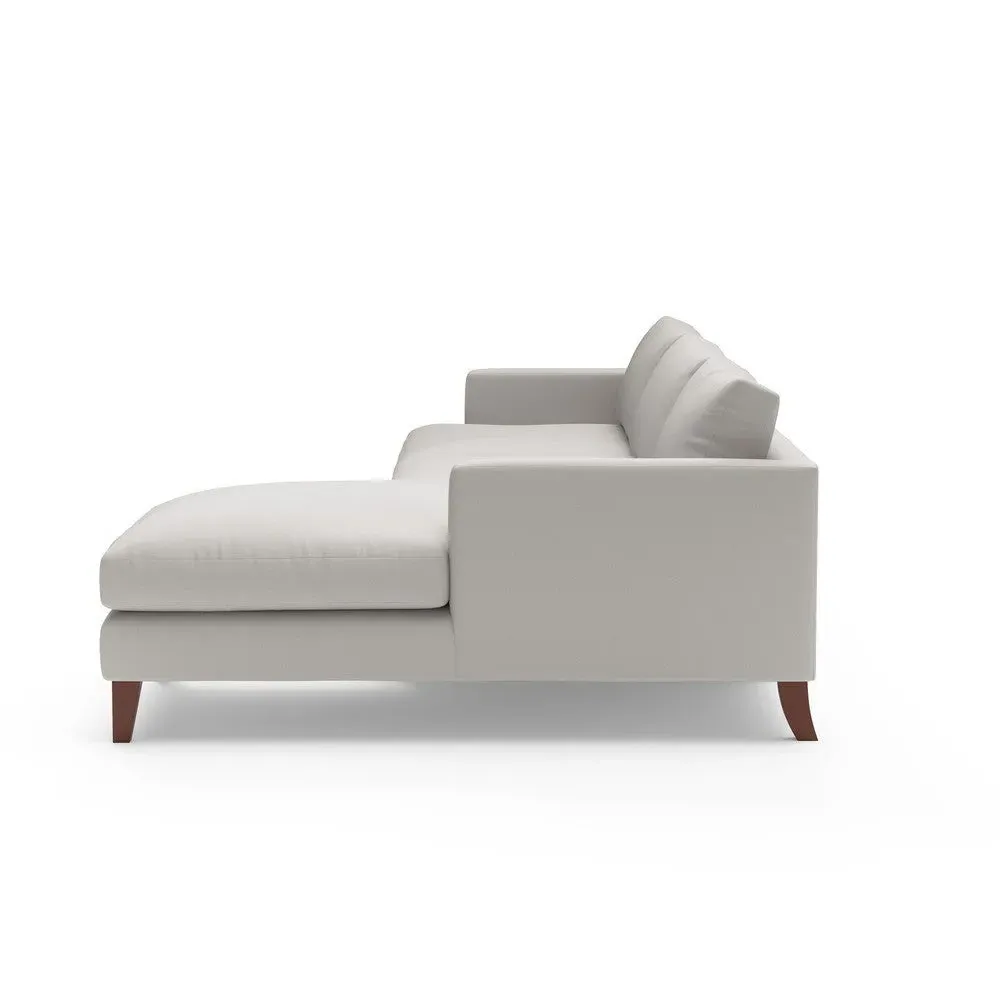The chaise sofa offers lasting comfort with its smart, clean lines and tall arms. Its generous proportions provide ample seating space, while the house weave fabric adds texture and durability. The left-hand configuration suits various room layouts, and the tall arms ensure excellent support for relaxation.