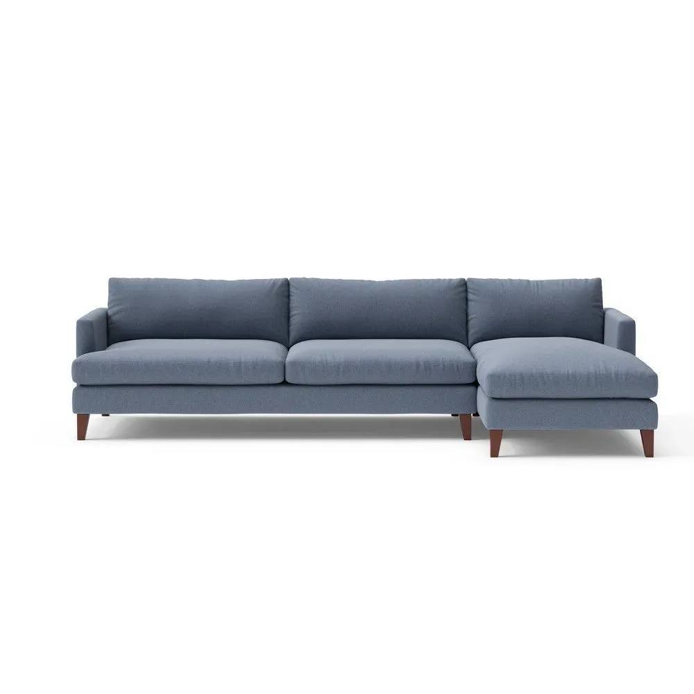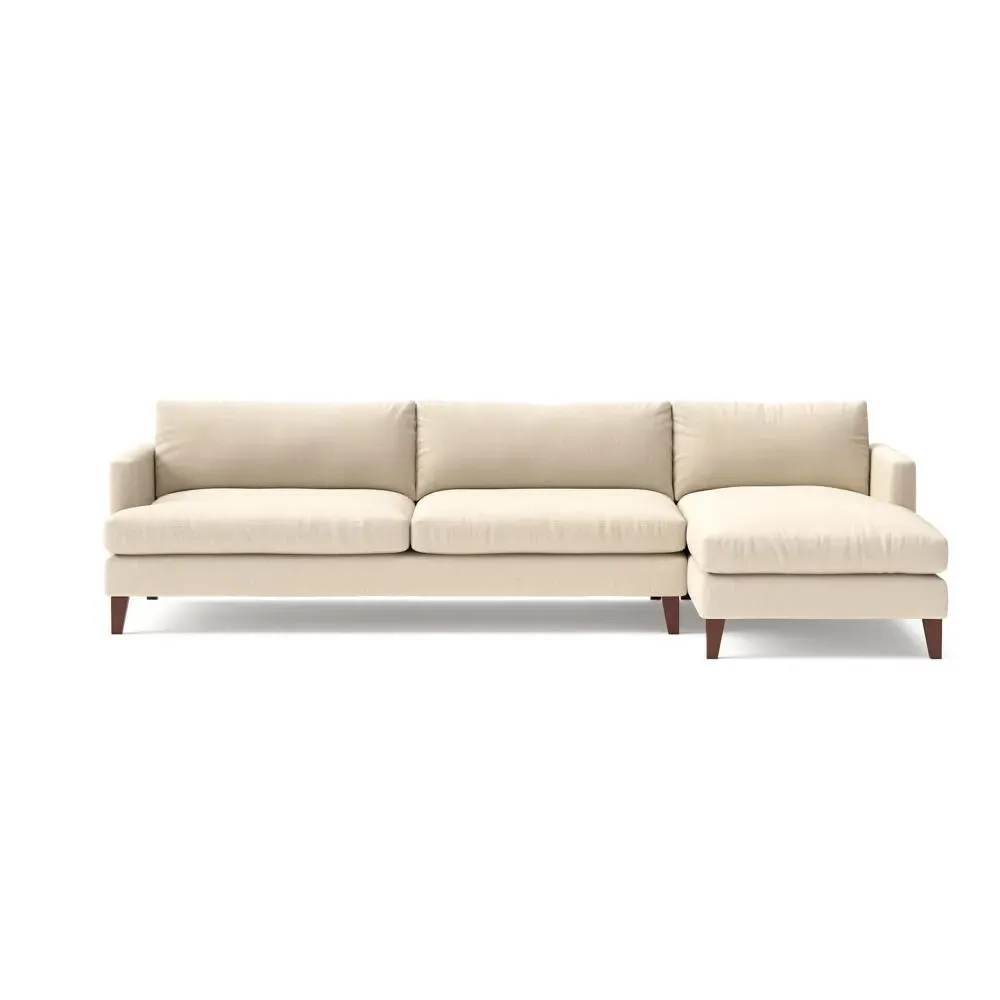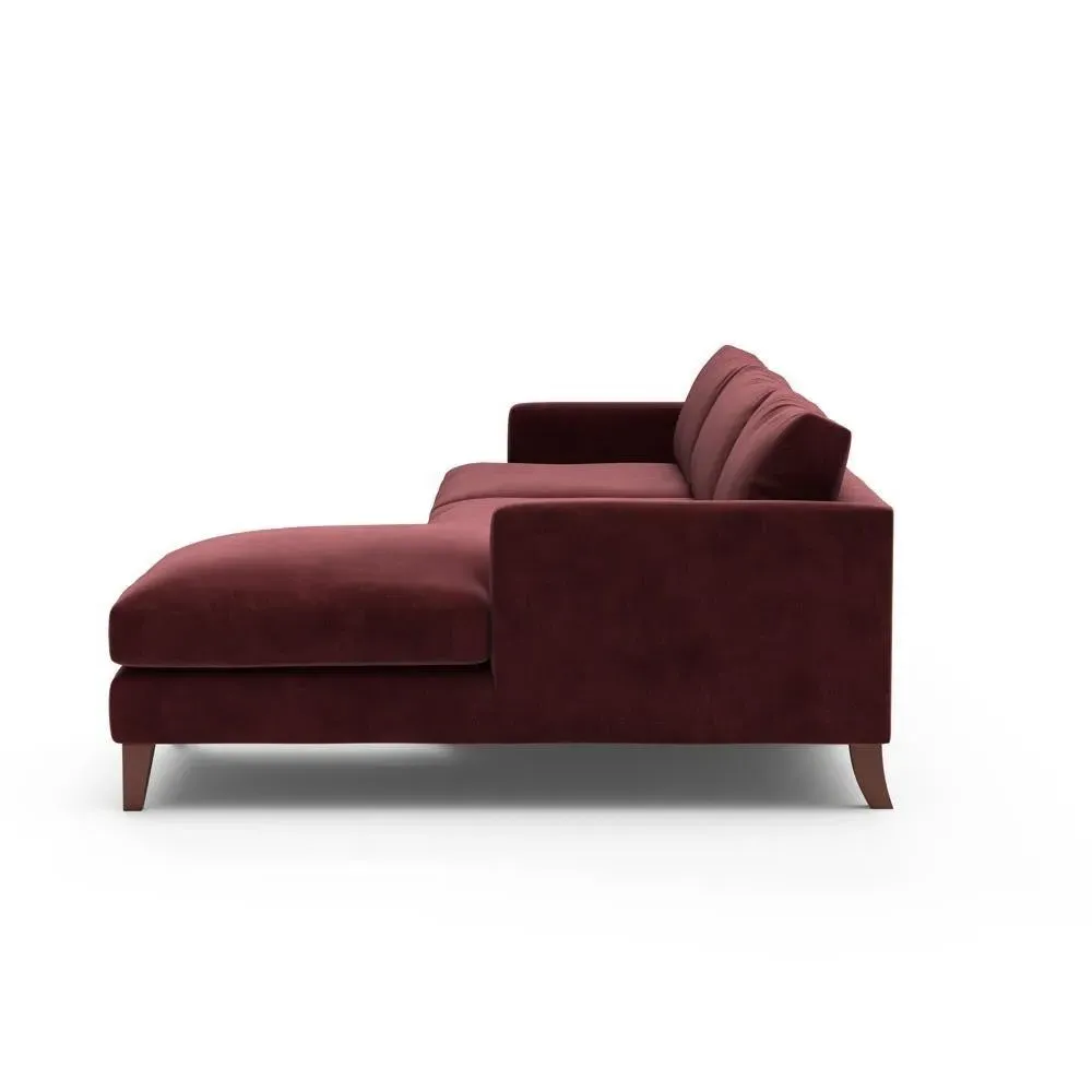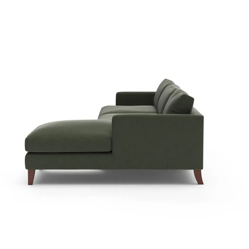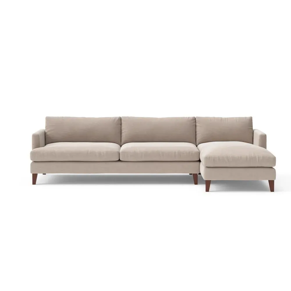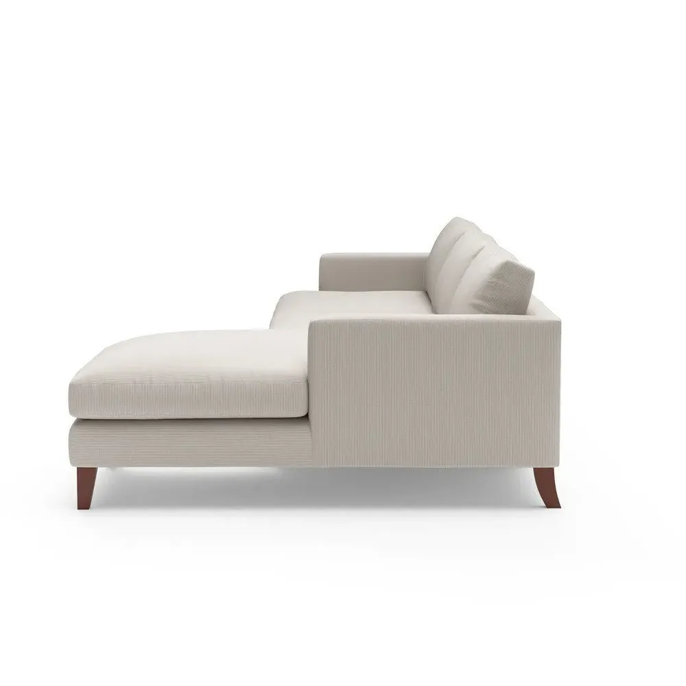 The chaise sofa offers lasting comfort with its smart, clean lines and tall arms. Its generous proportions provide ample seating space, while the house weave fabric adds texture and durability. The left-hand configuration suits various room layouts, and the tall arms ensure excellent support for relaxation.